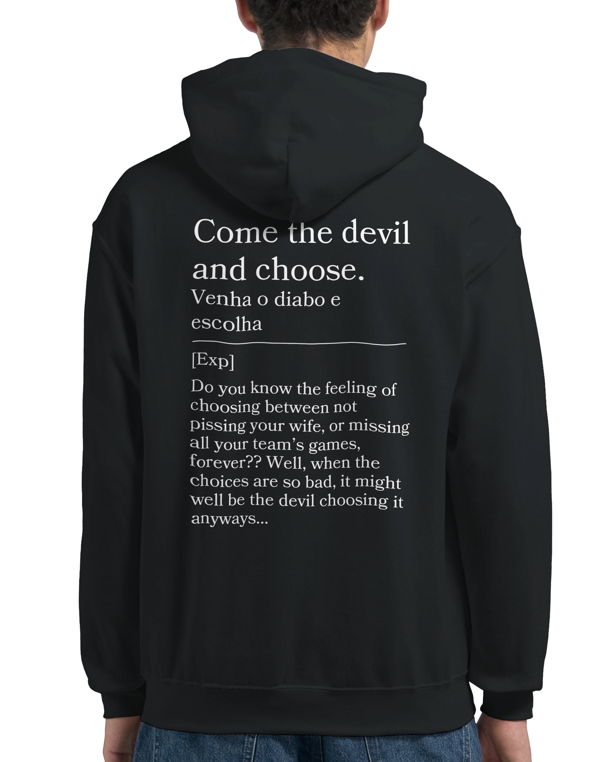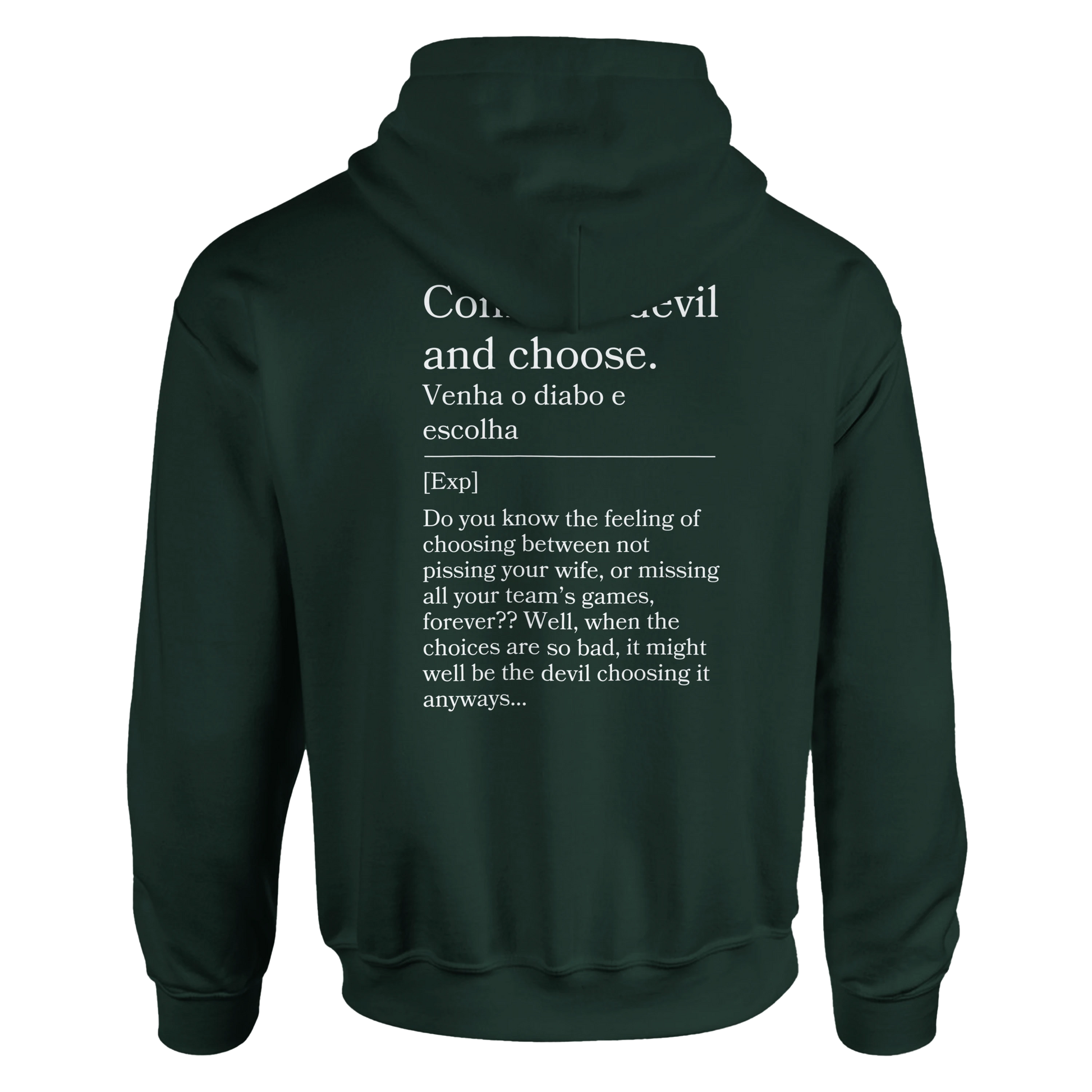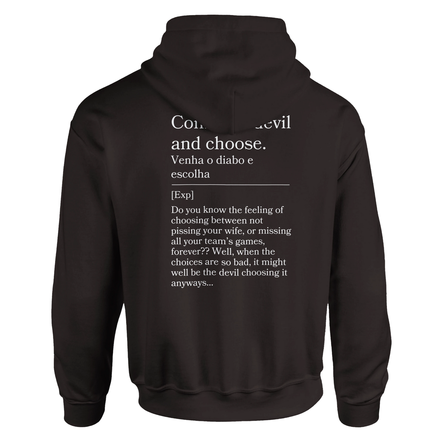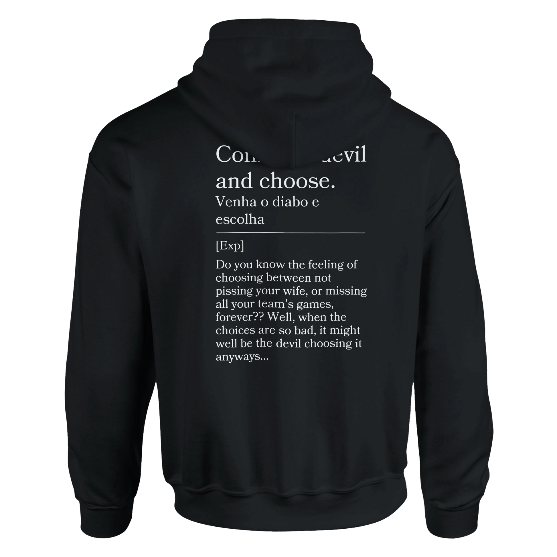 Tough choices? This hoodie reads “Venha o diabo e escolha” with back: “Either way, it sucks.” For those no-win situations, this hoodie is your blunt anthem.