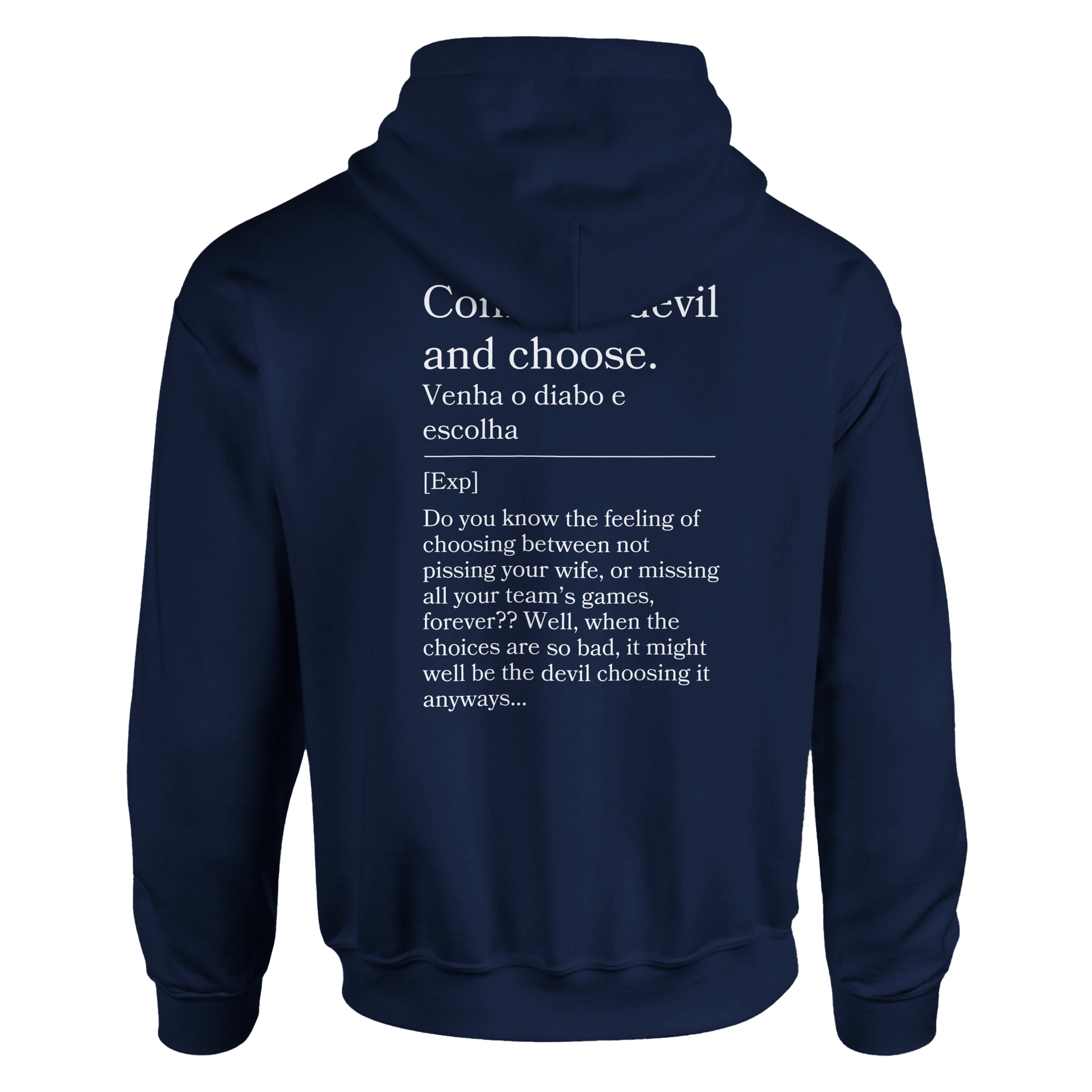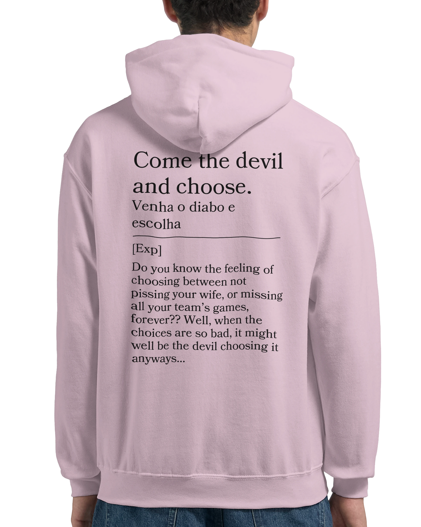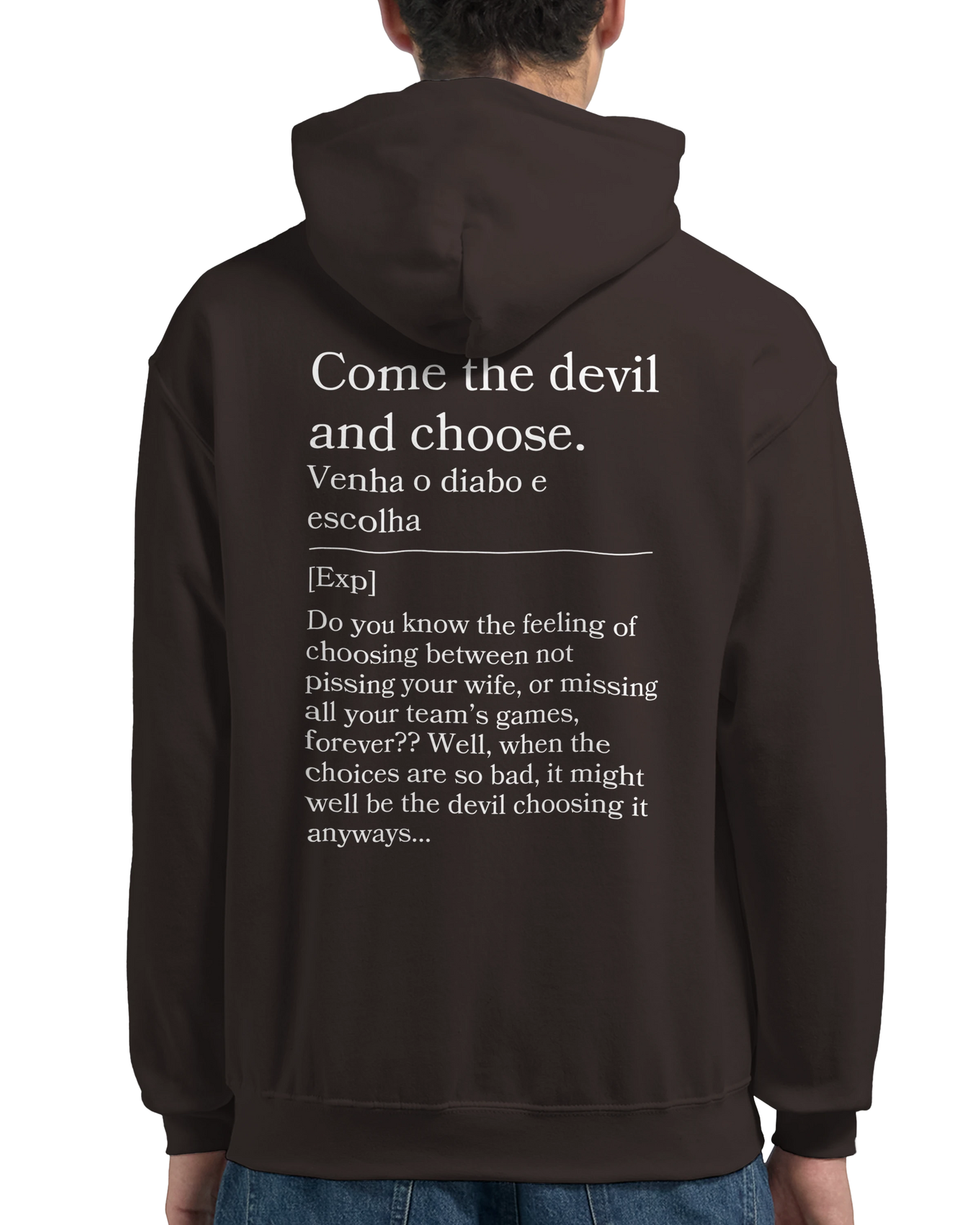 Tough choices? This hoodie reads “Venha o diabo e escolha” with back: “Either way, it sucks.” For those no-win situations, this hoodie is your blunt anthem.