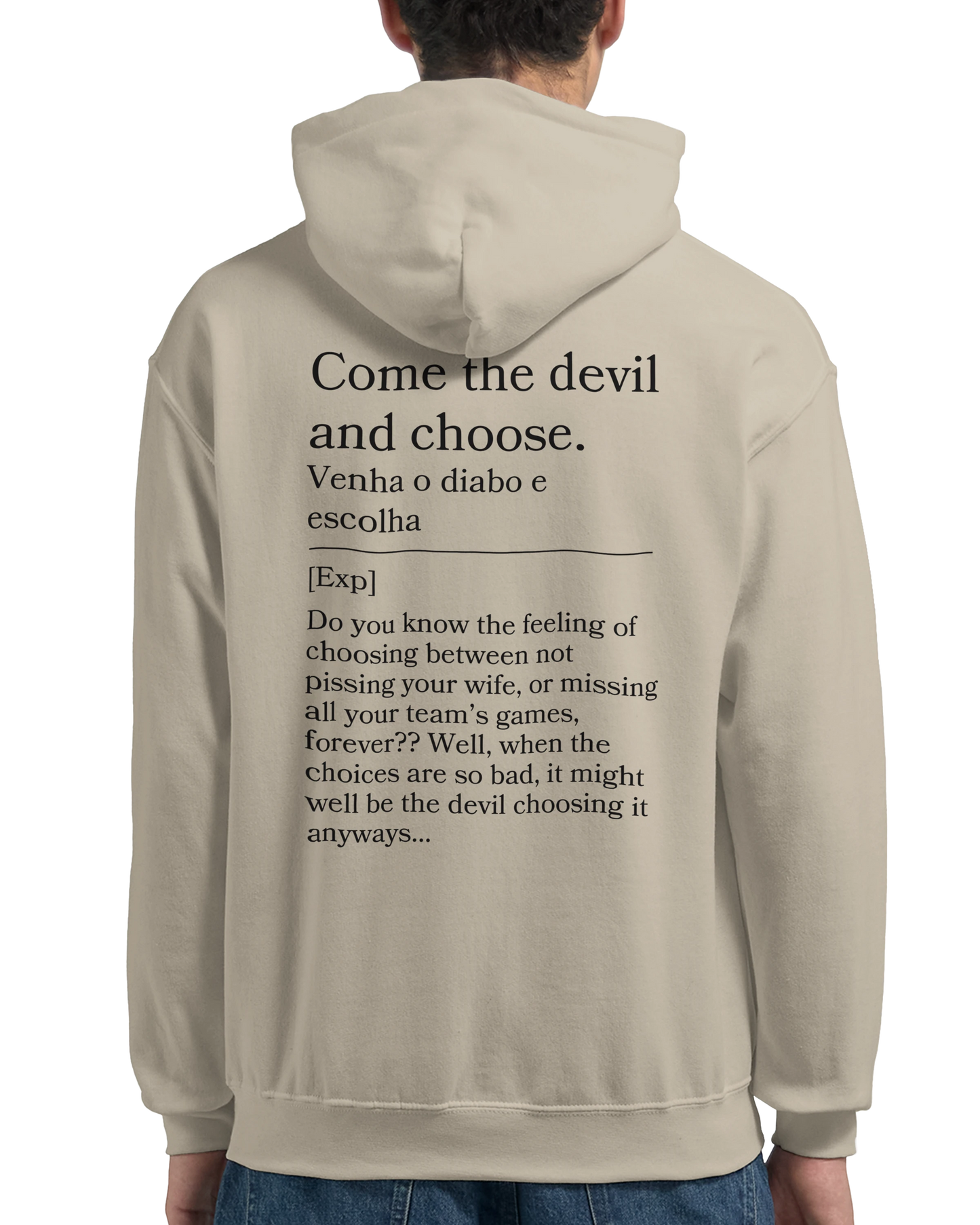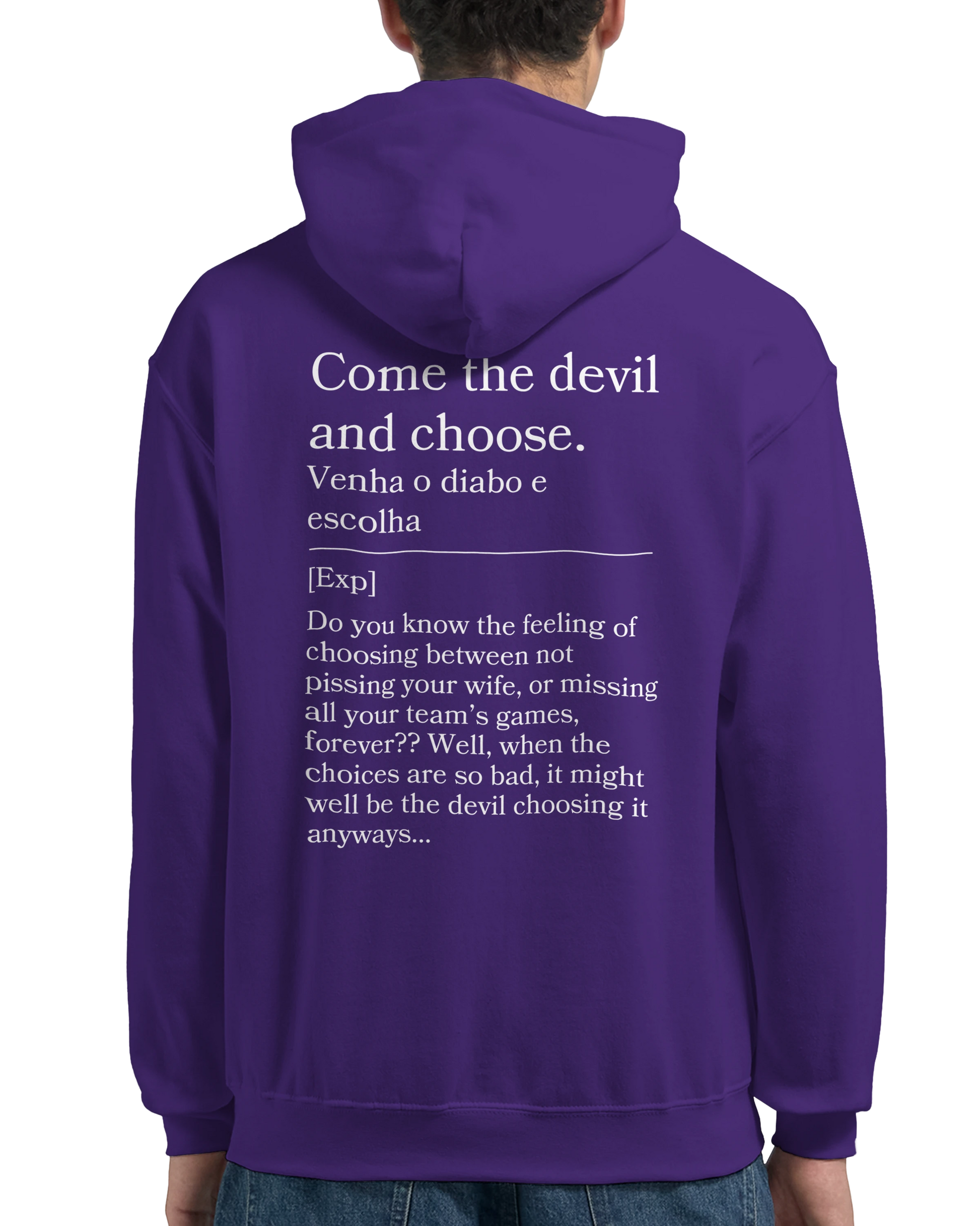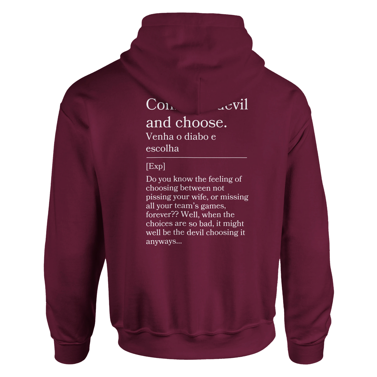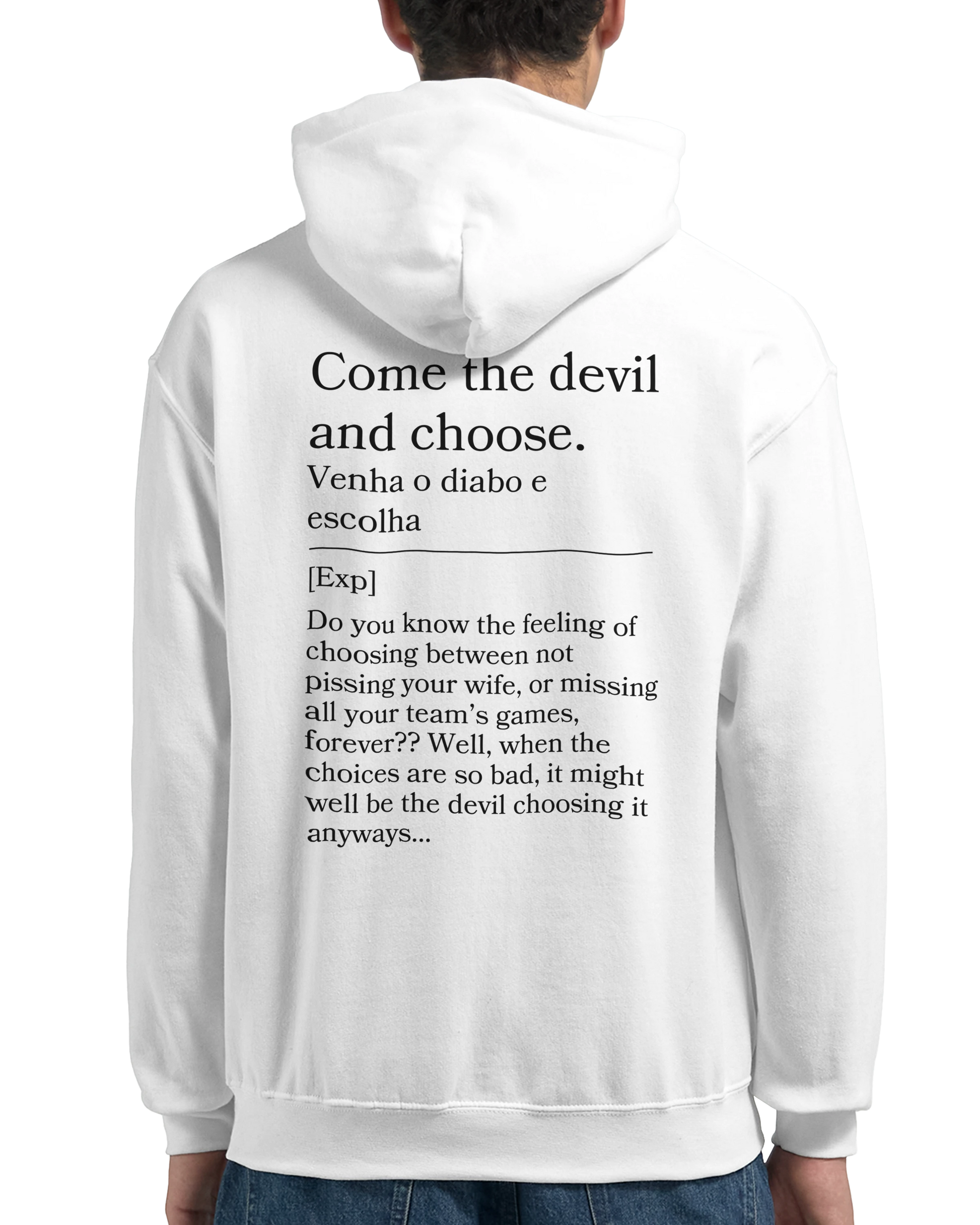 Tough choices? This hoodie reads “Venha o diabo e escolha” with back: “Either way, it sucks.” For those no-win situations, this hoodie is your blunt anthem.