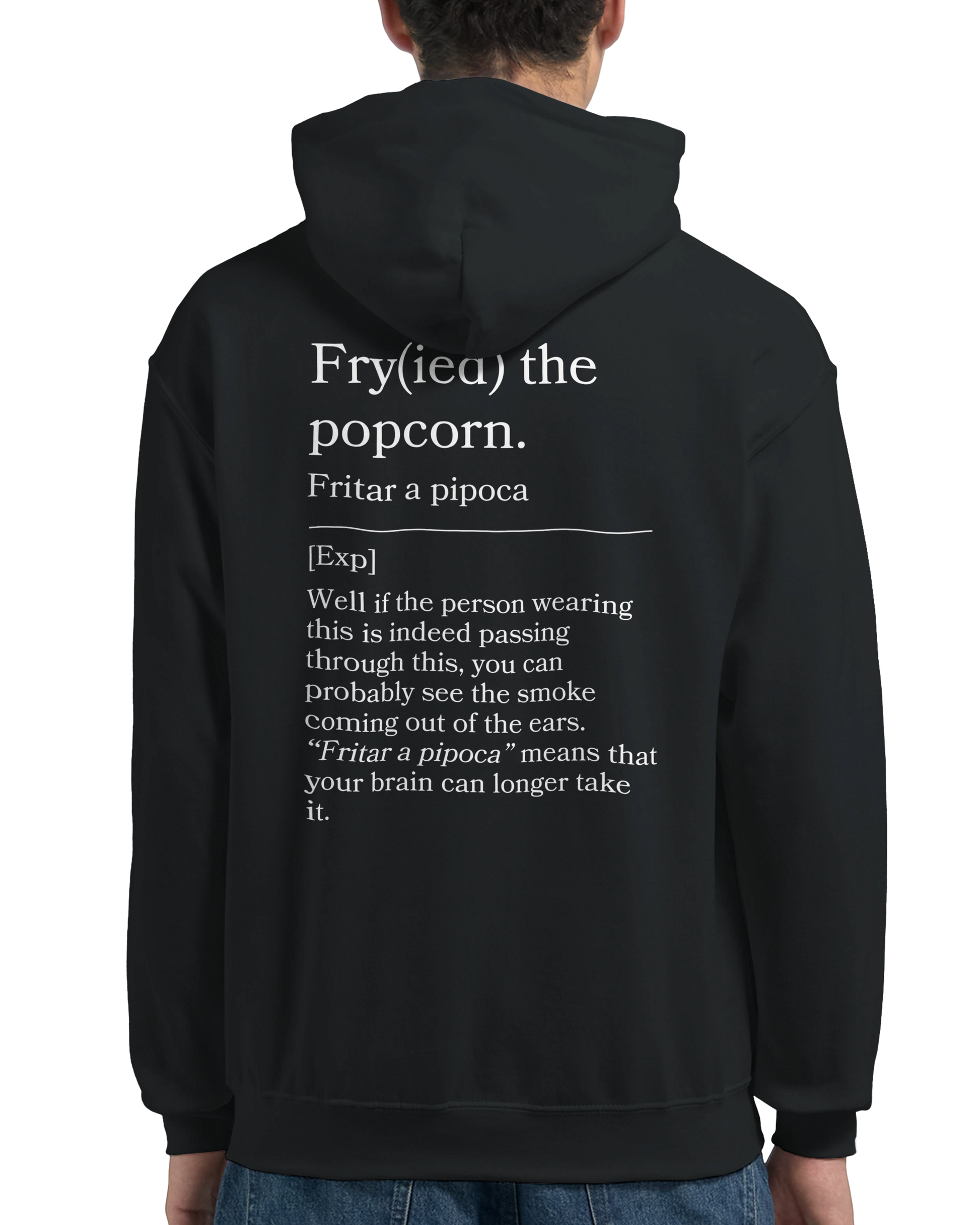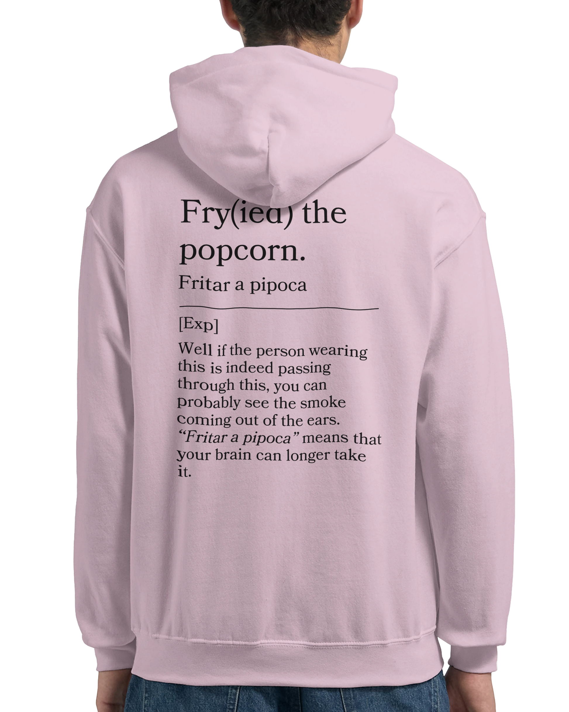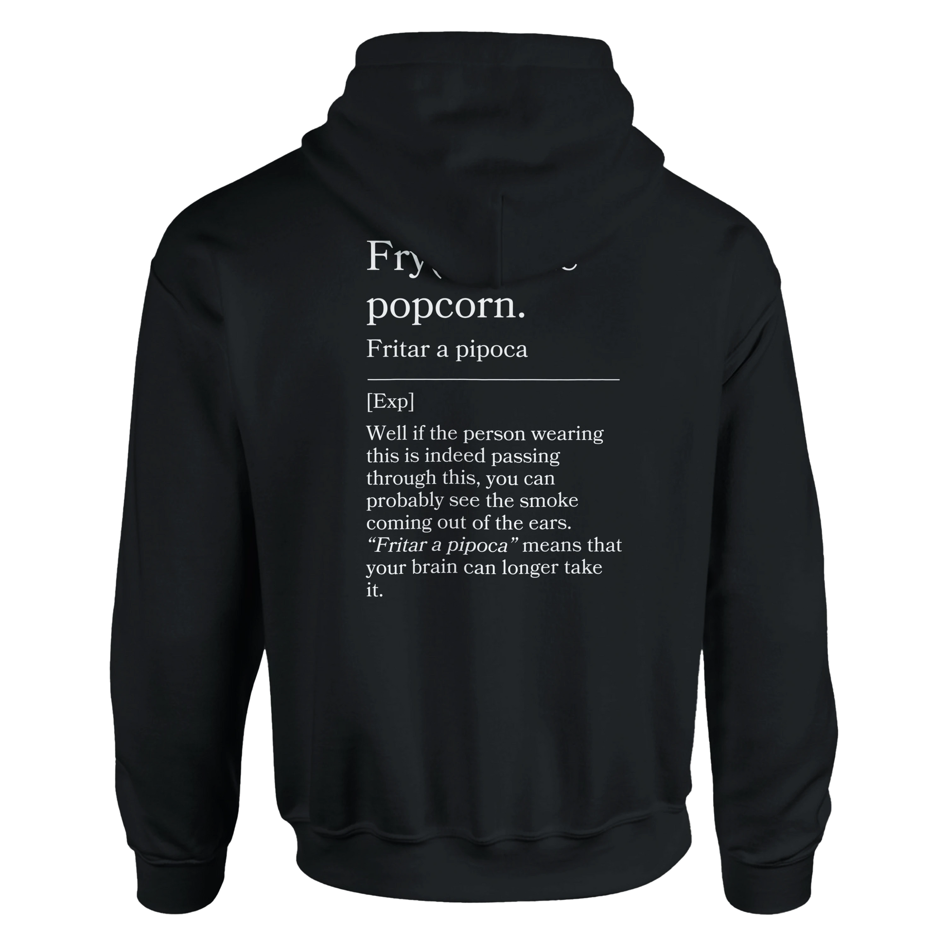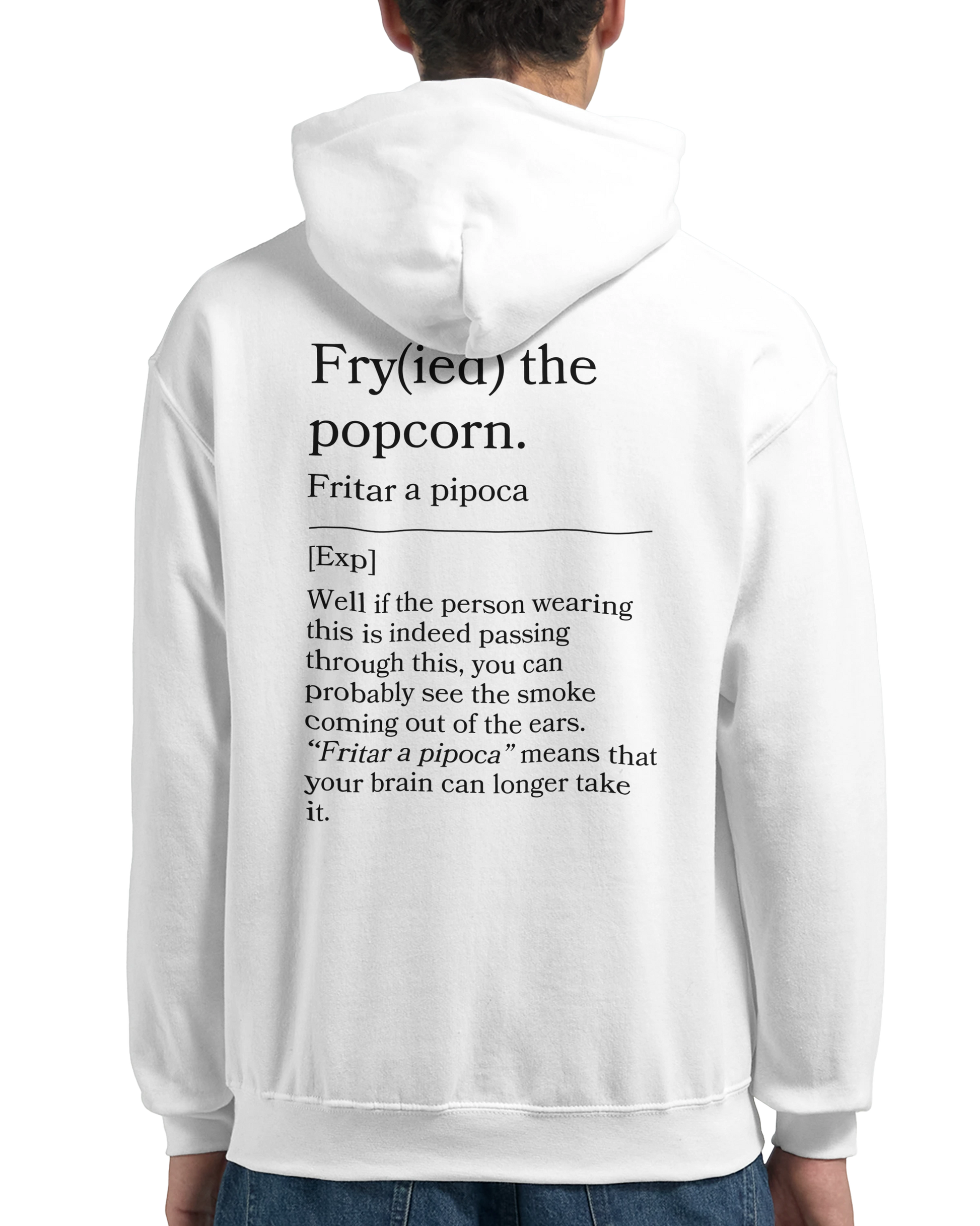 Mind blown? This hoodie shouts “Fritar a pipoca.” Back: “Brain so overloaded it’s popping popcorn.” Ideal for when you’ve reached your limit.