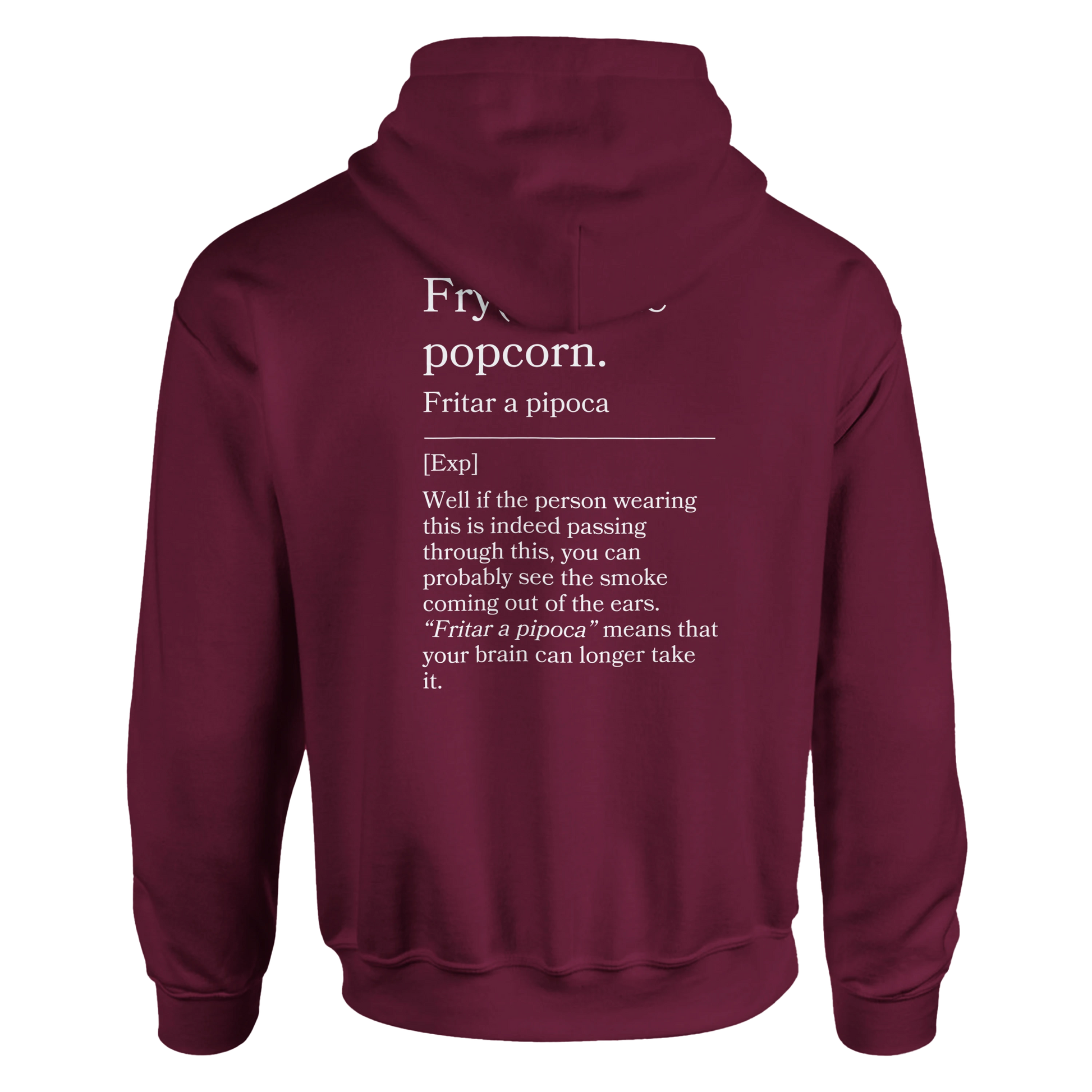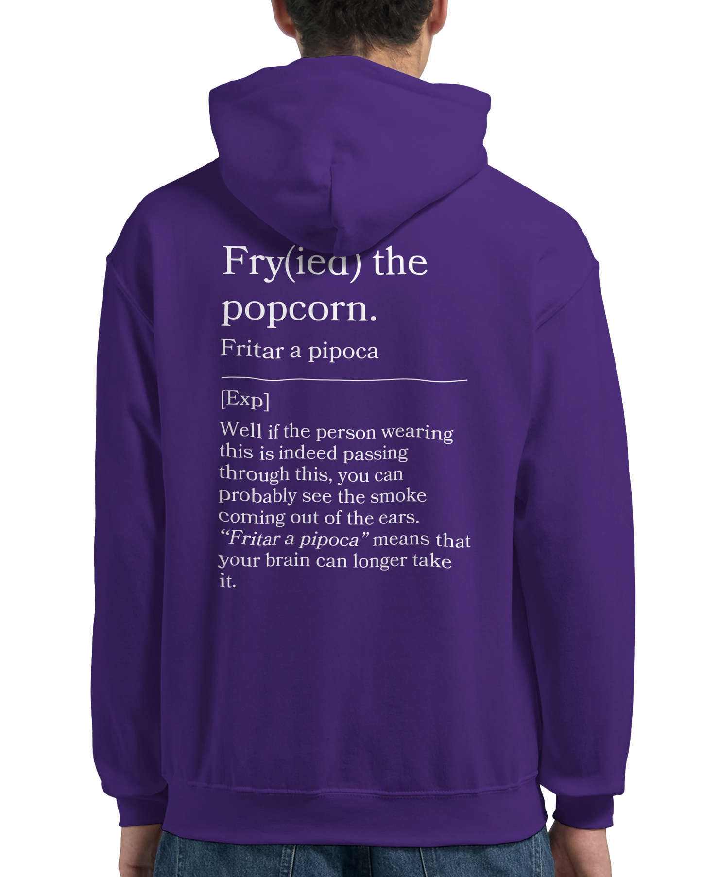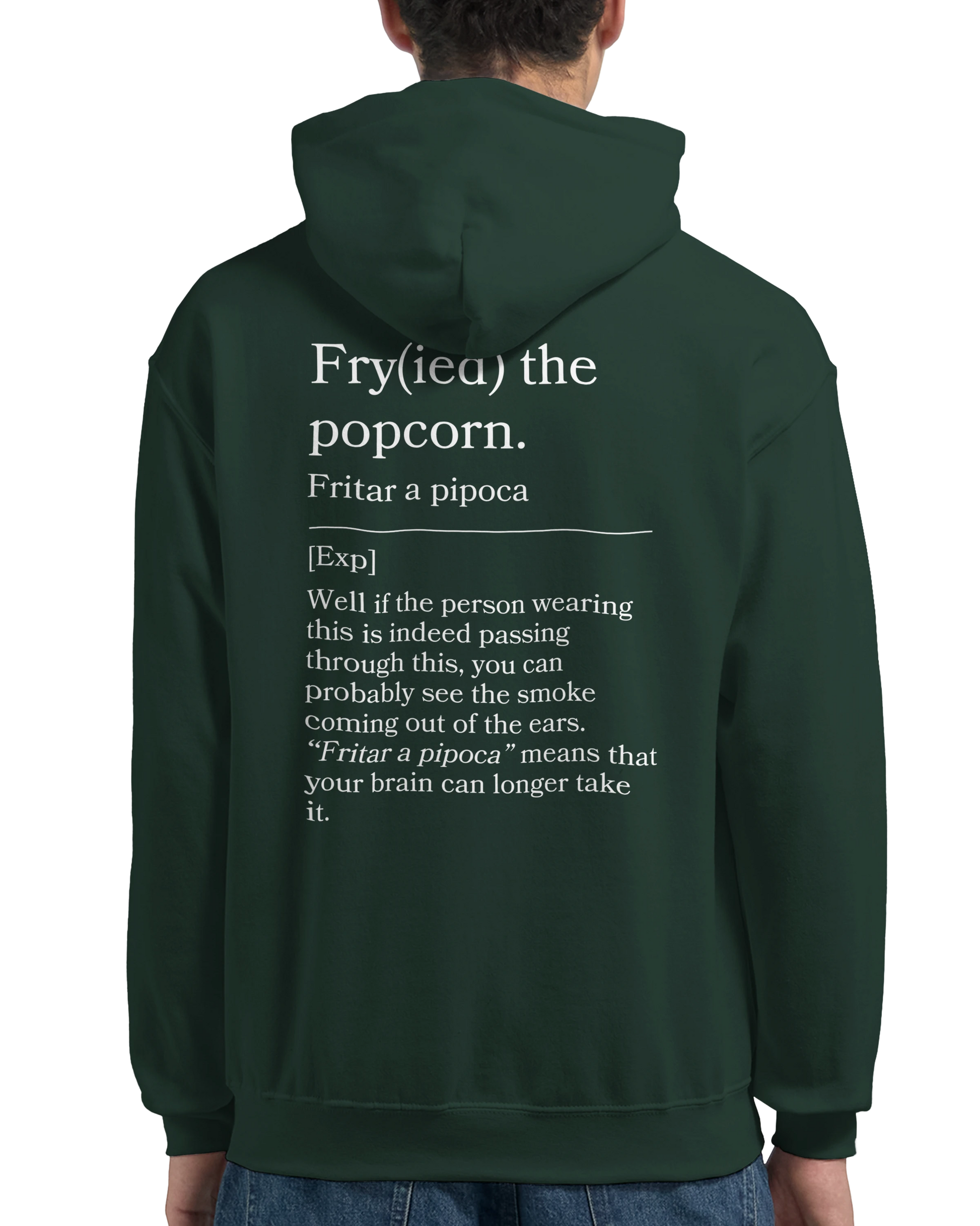 Mind blown? This hoodie shouts “Fritar a pipoca.” Back: “Brain so overloaded it’s popping popcorn.” Ideal for when you’ve reached your limit.