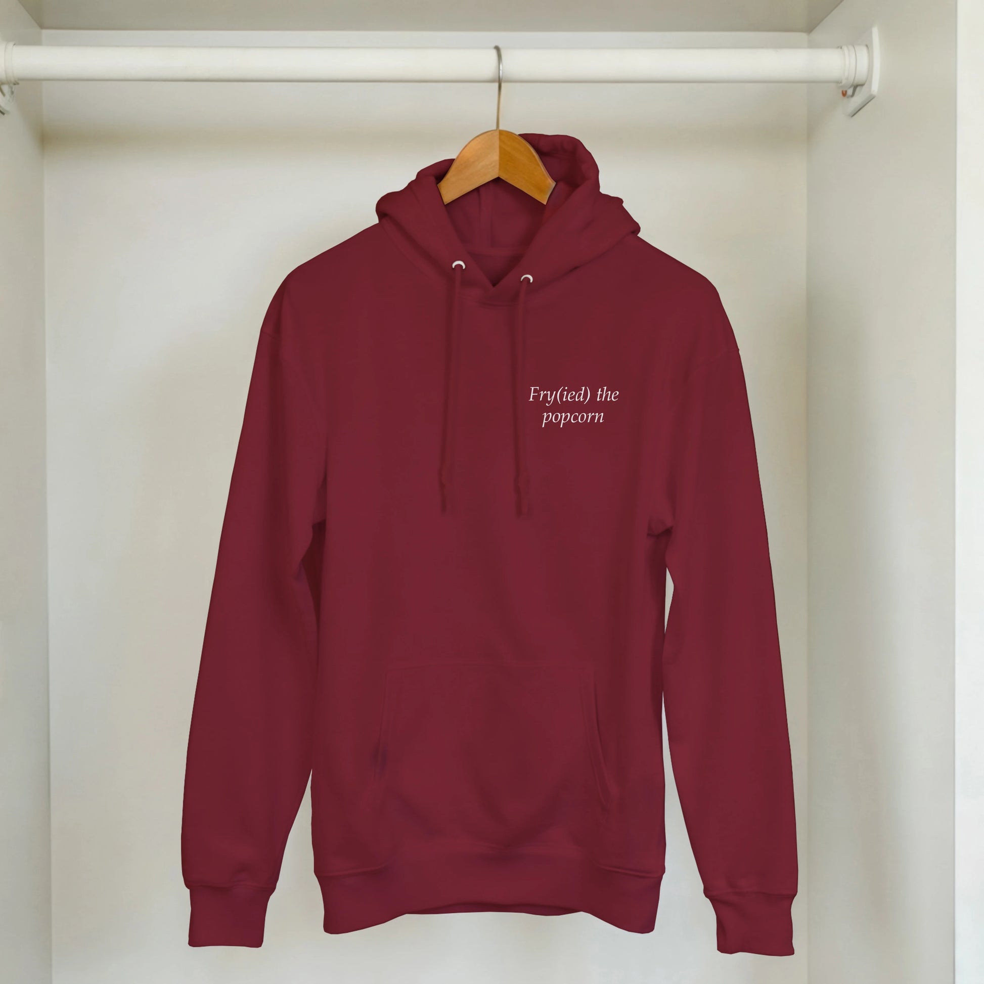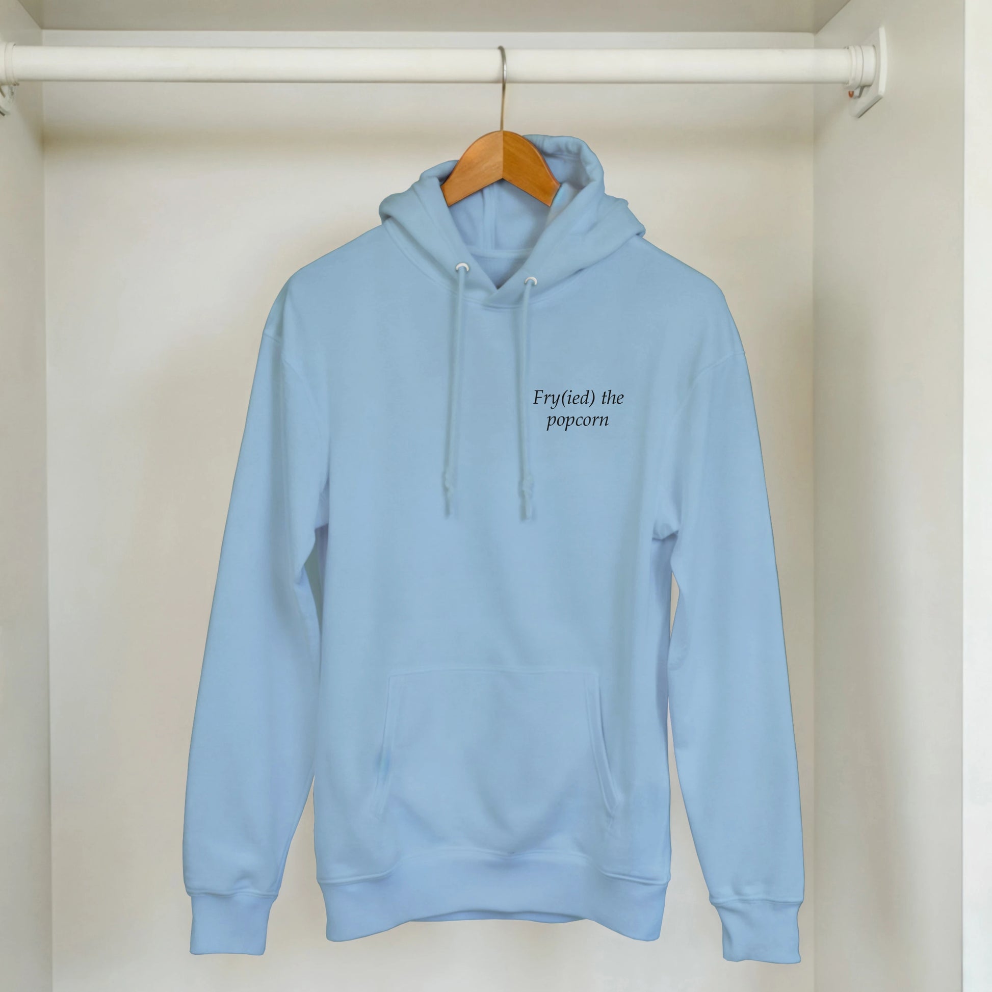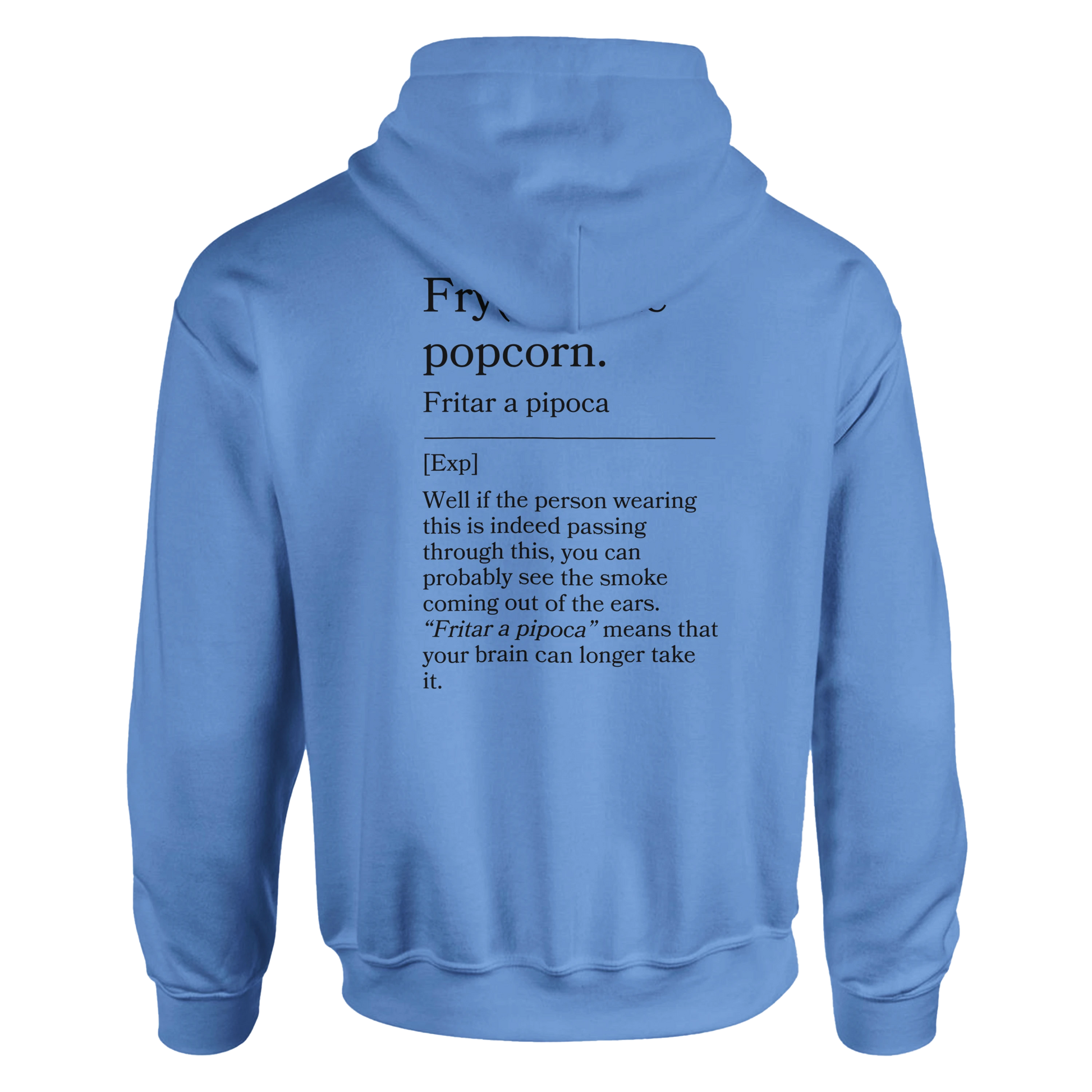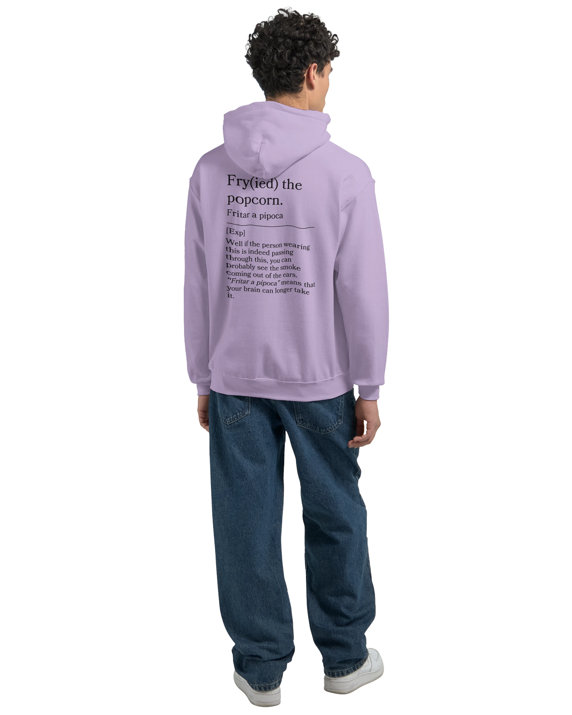 Mind blown? This hoodie shouts “Fritar a pipoca.” Back: “Brain so overloaded it’s popping popcorn.” Ideal for when you’ve reached your limit.