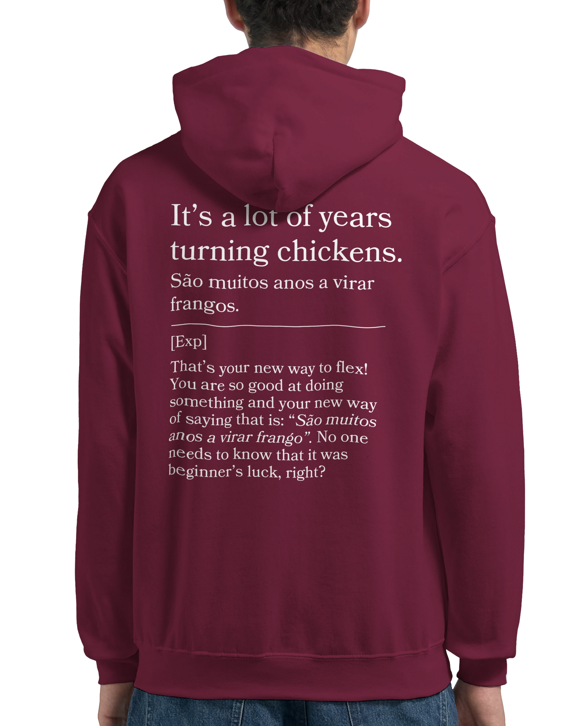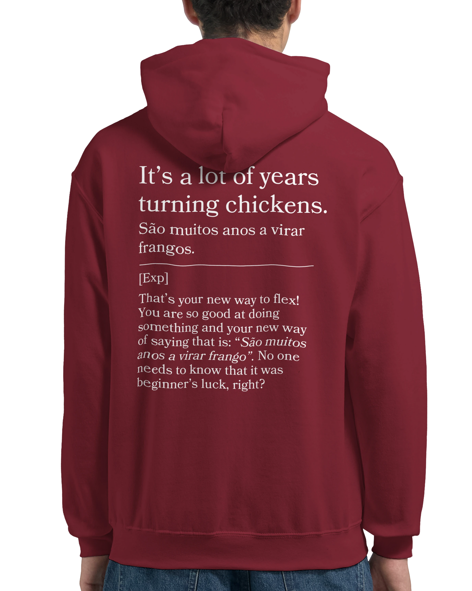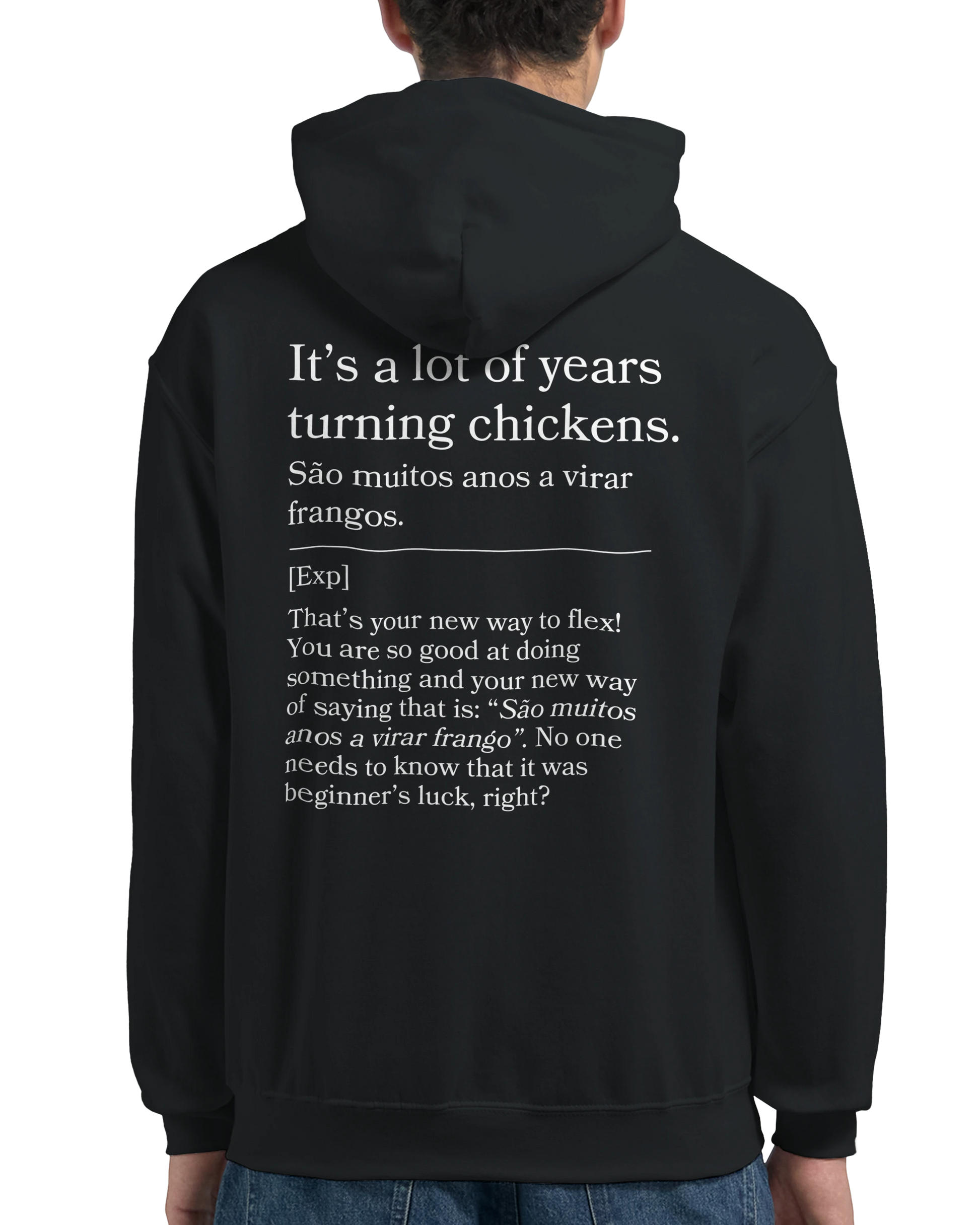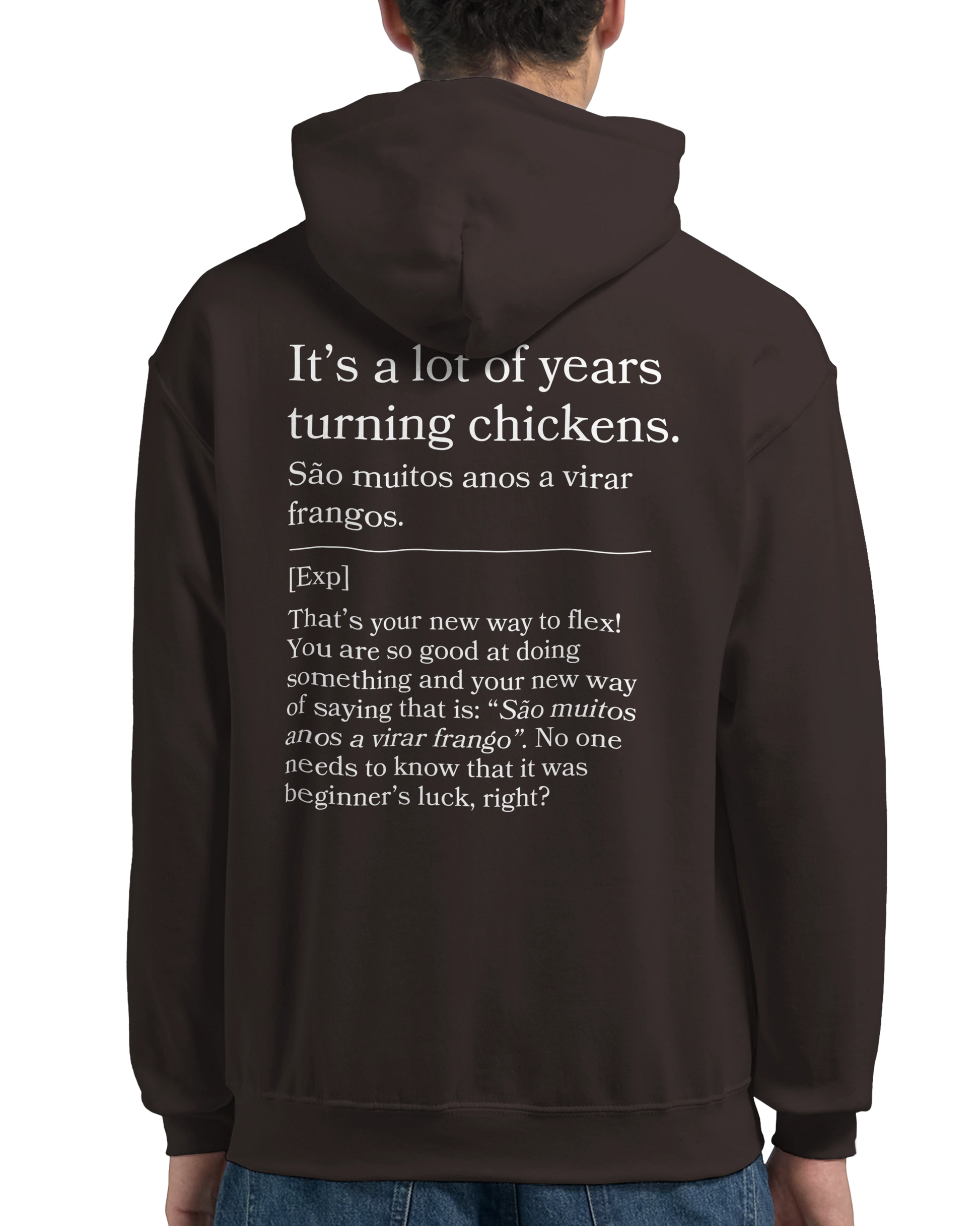 Skilled and seasoned? This hoodie states “São muitos anos a virar frangos,” with back: “Been doing this long enough to know.” Ideal for showing off your experience—no bragging required.