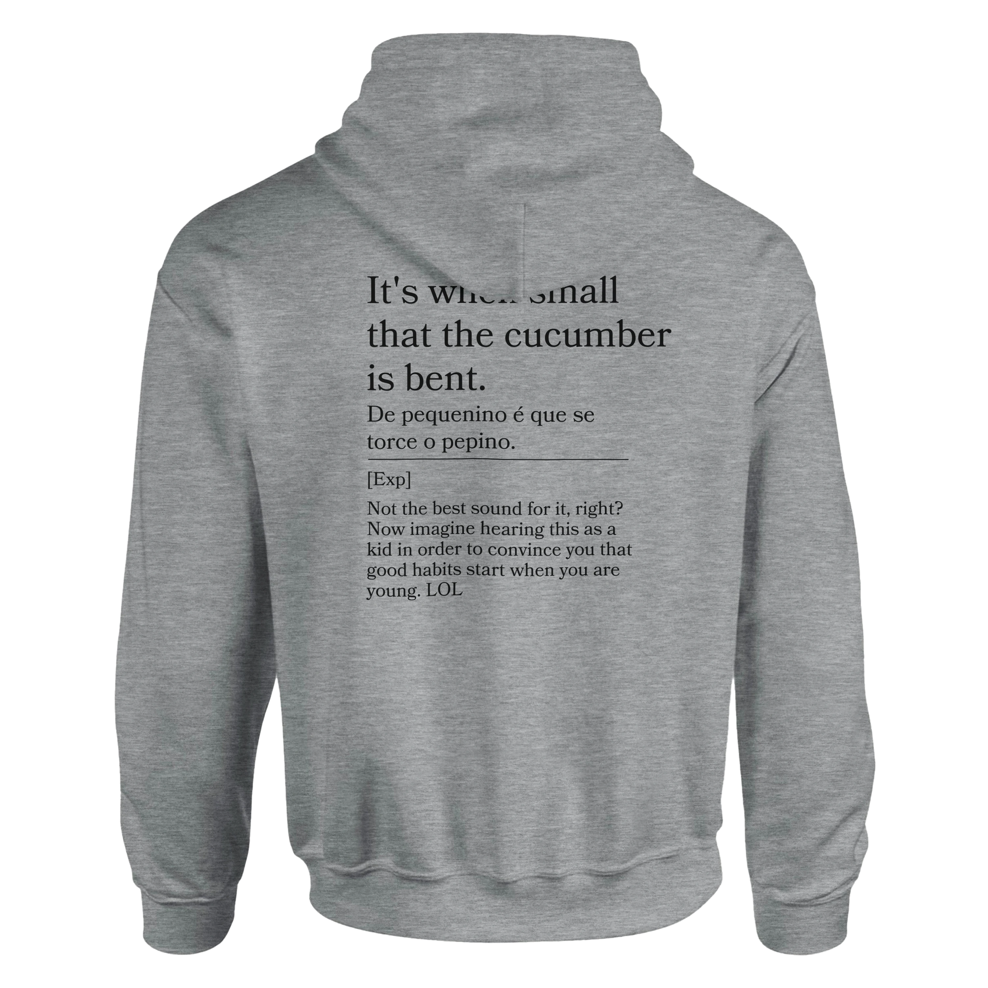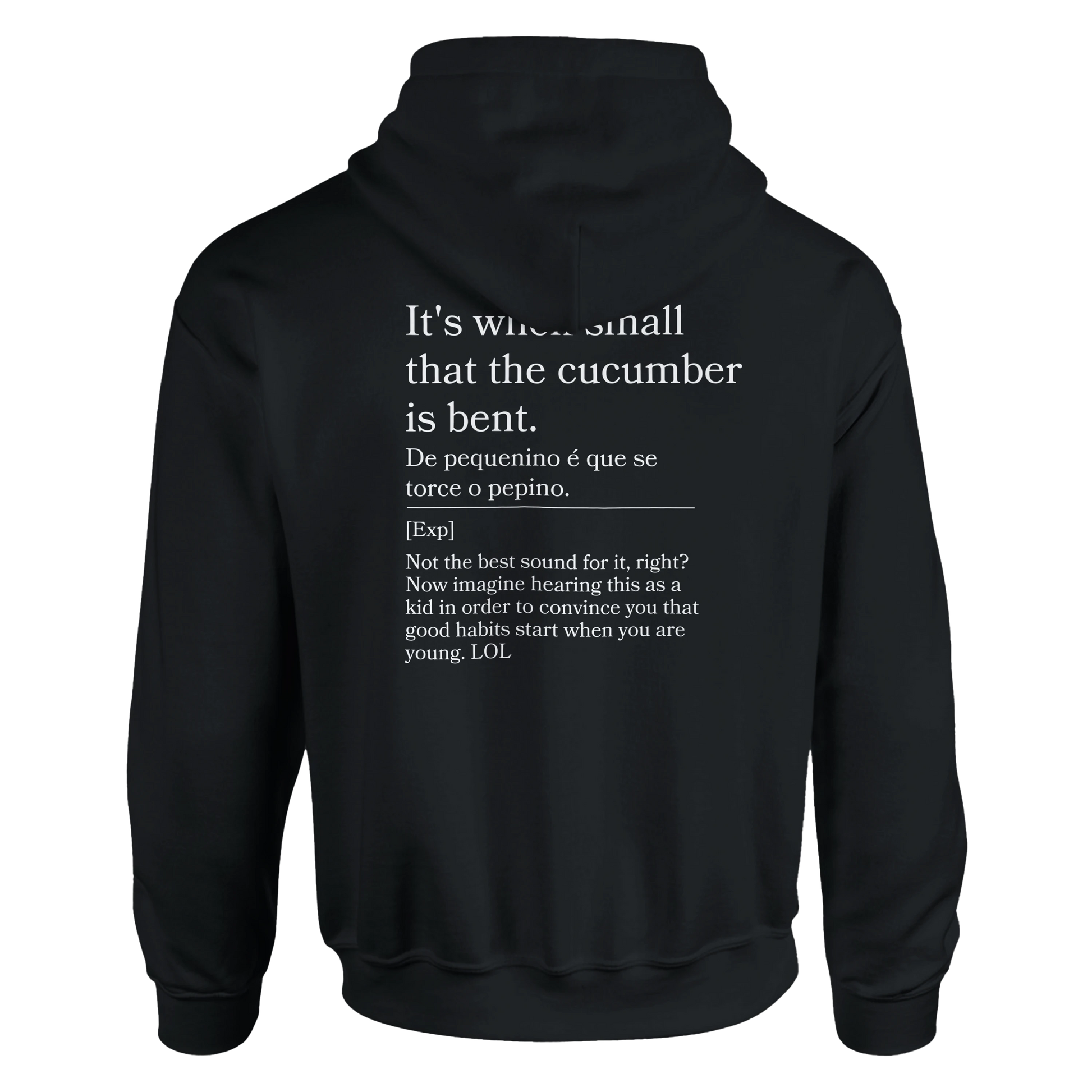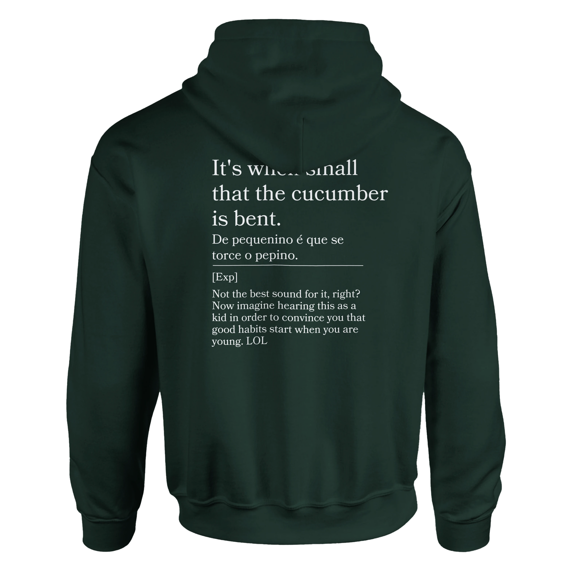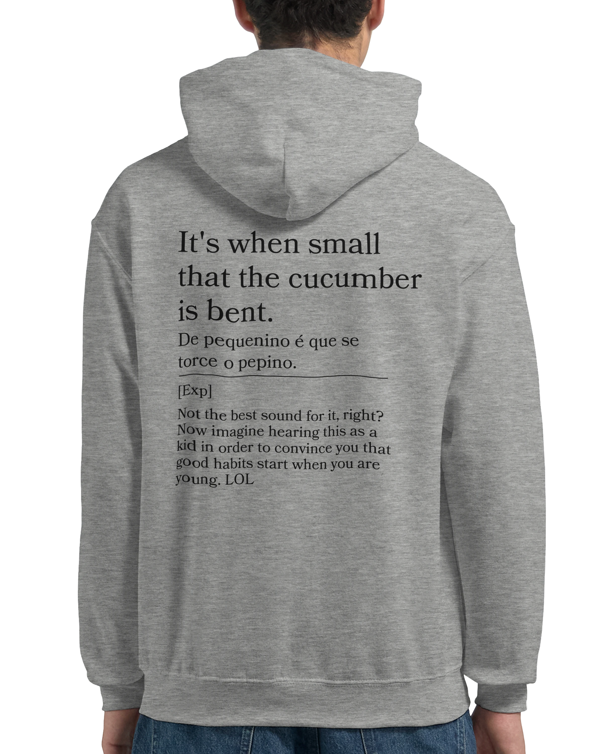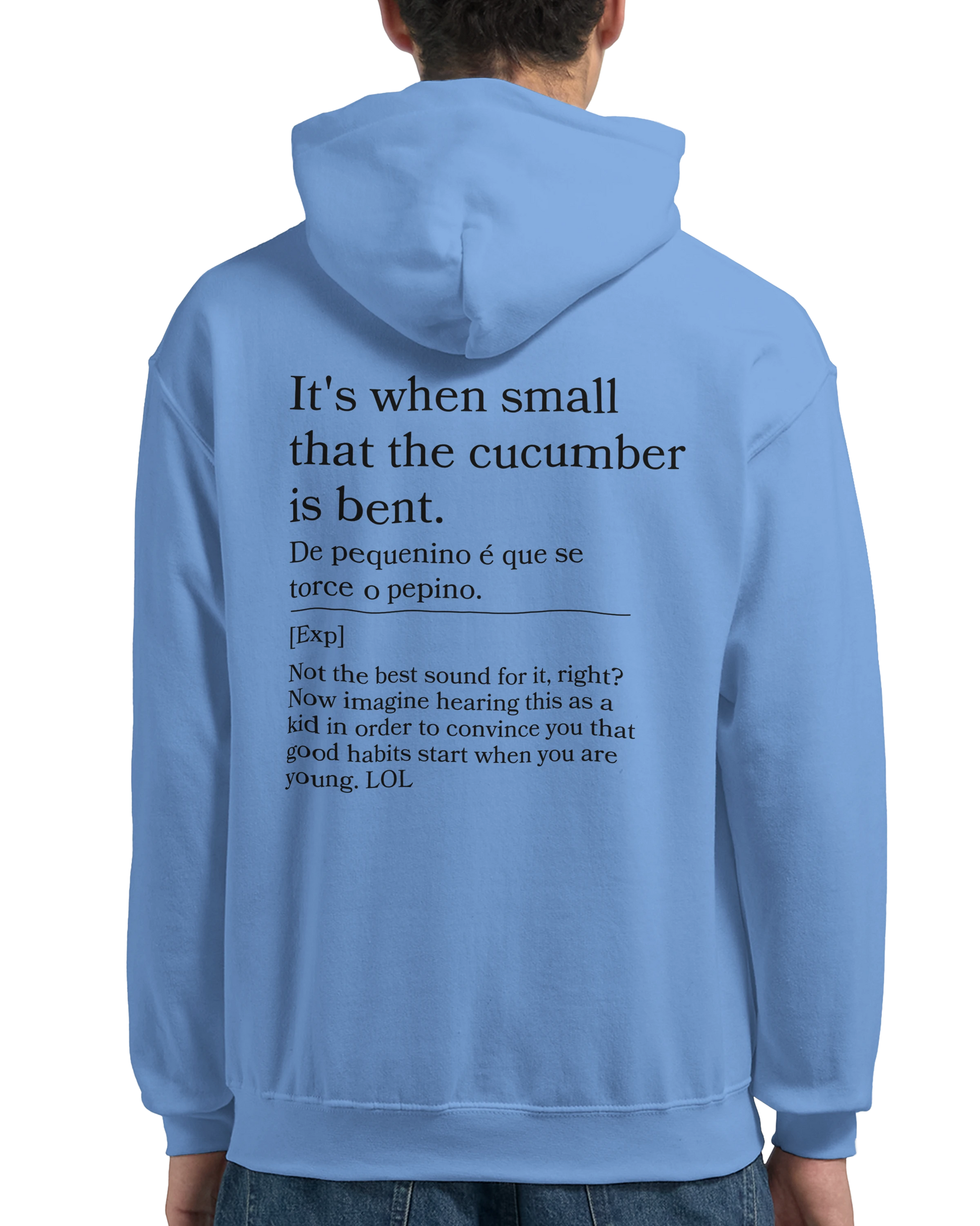 Start good habits early—or at least that’s the message. This hoodie proclaims “De pequenino é que se torce o pepino.” Back: “Form habits young.” or at least that is what your parents want you to believe in.