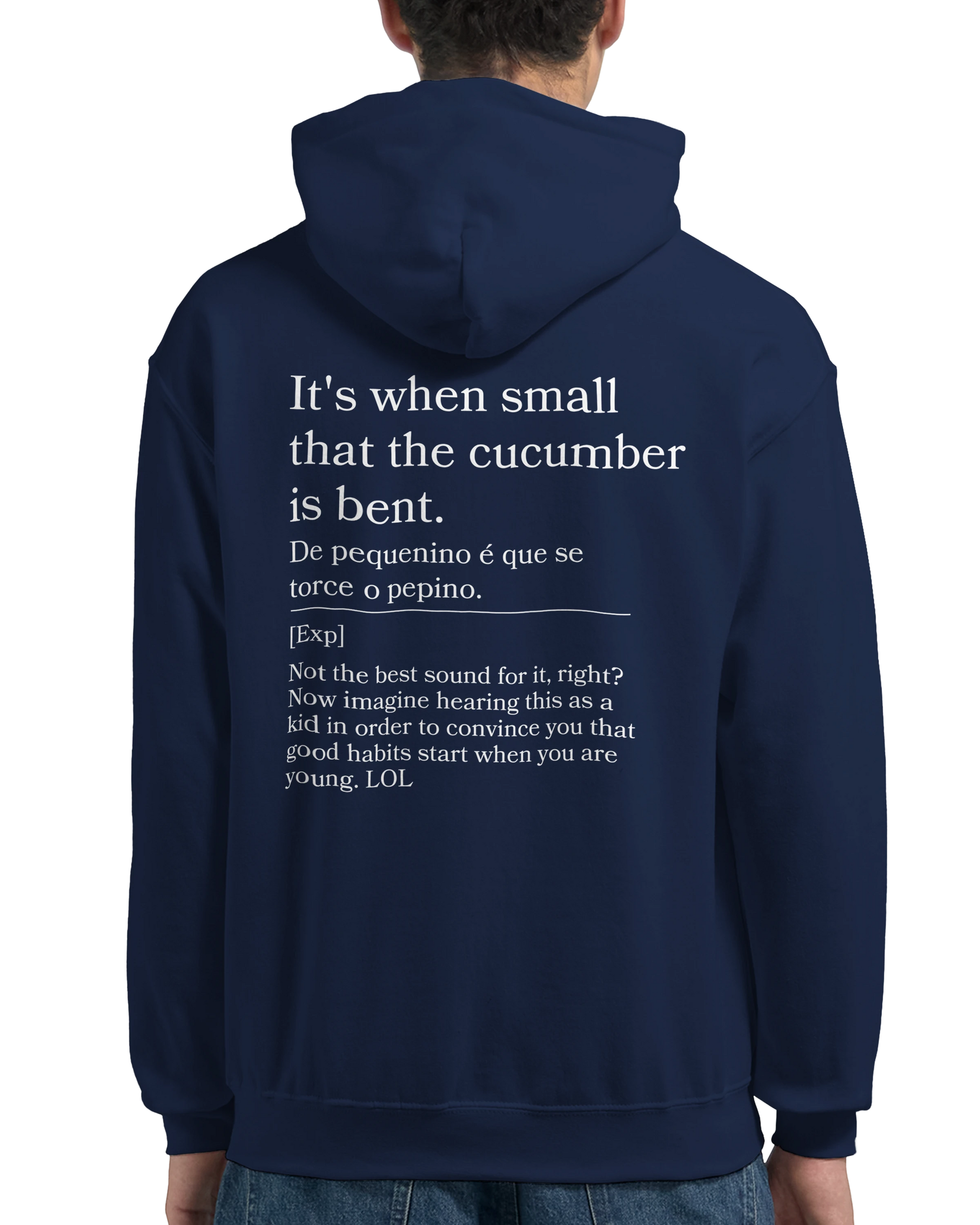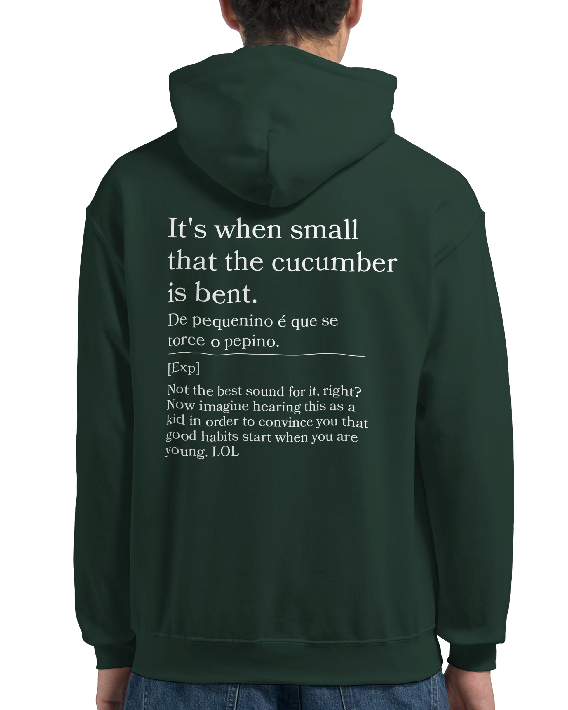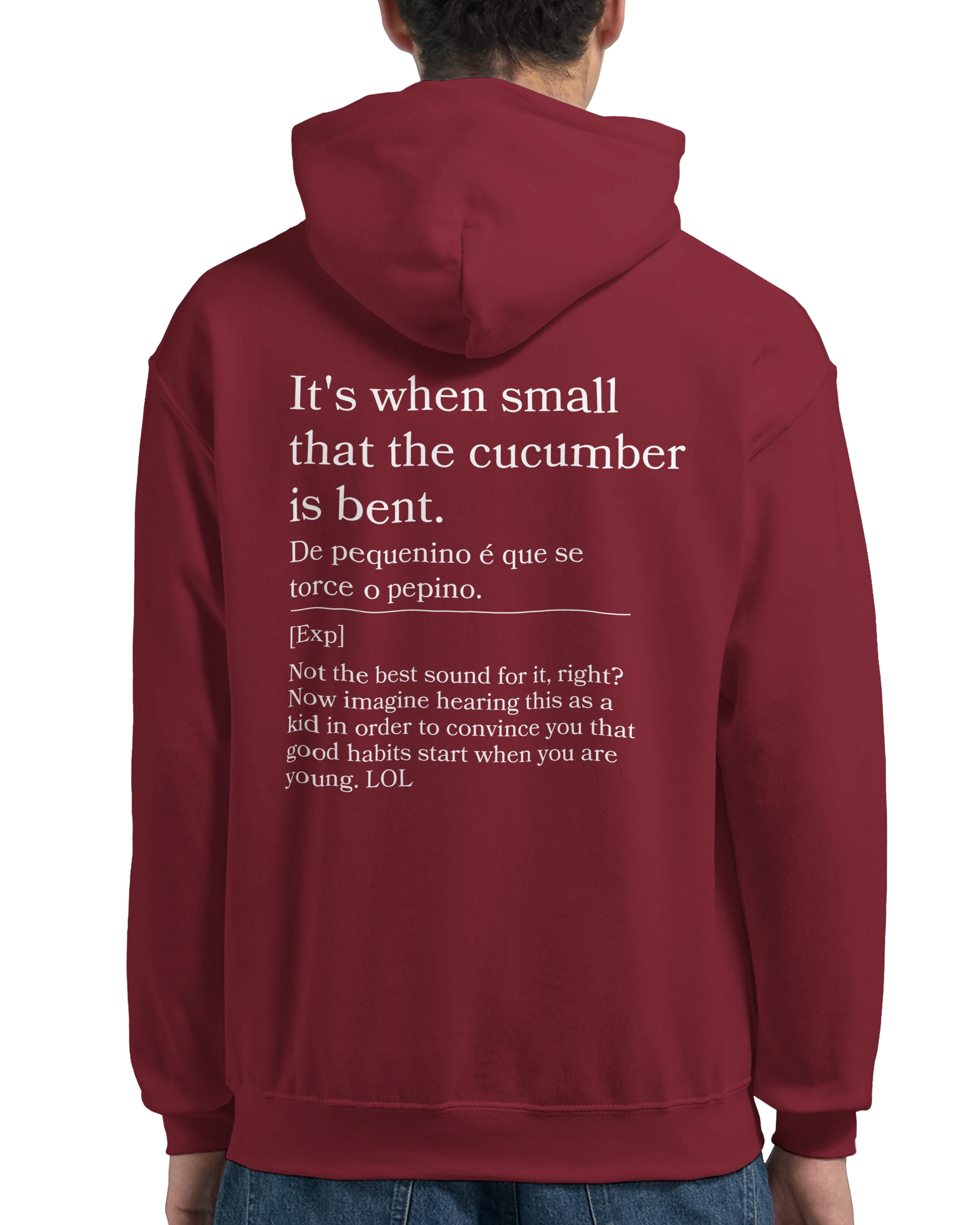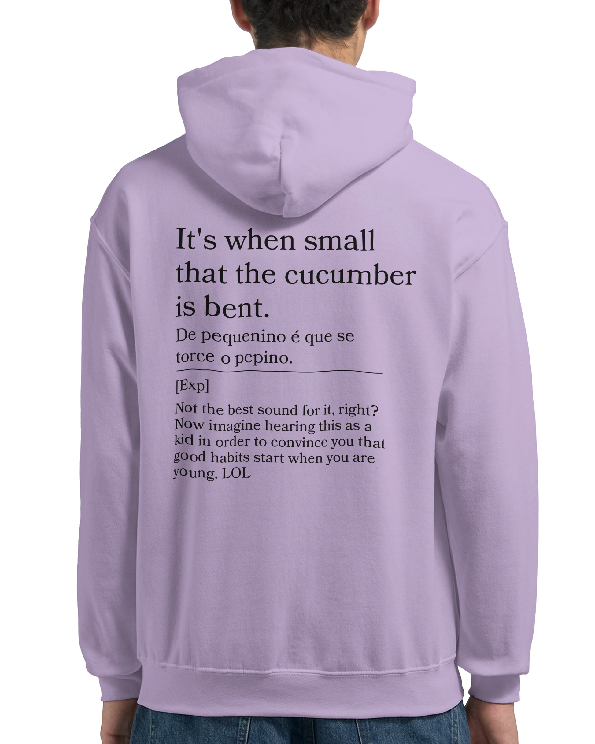 Start good habits early—or at least that’s the message. This hoodie proclaims “De pequenino é que se torce o pepino.” Back: “Form habits young.” or at least that is what your parents want you to believe in.