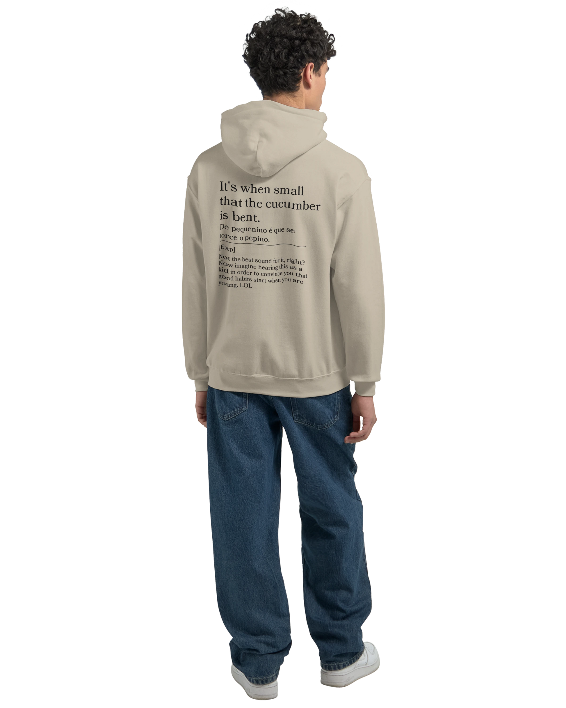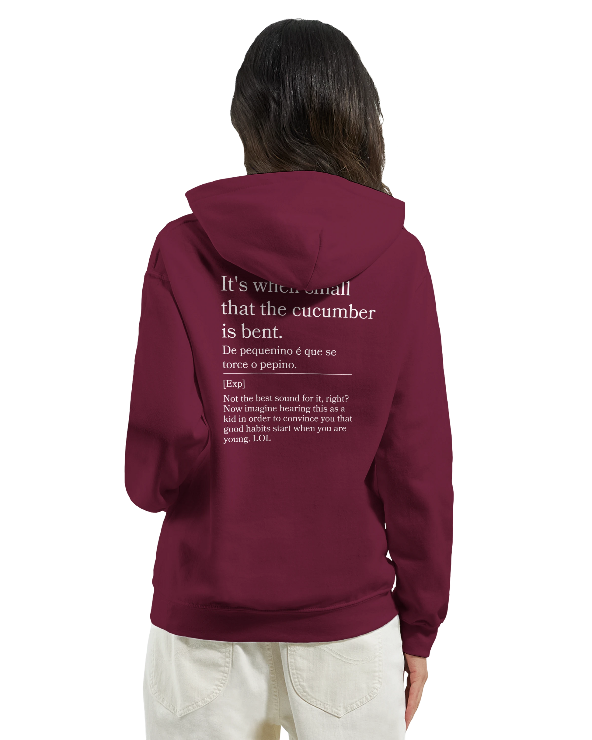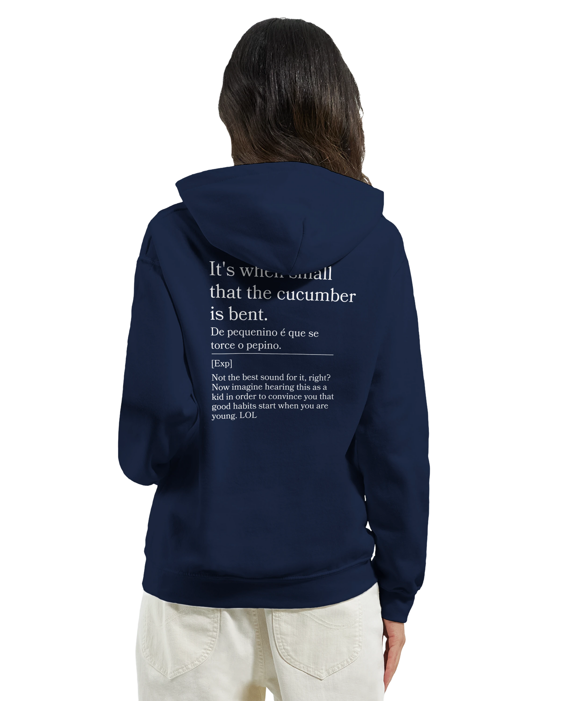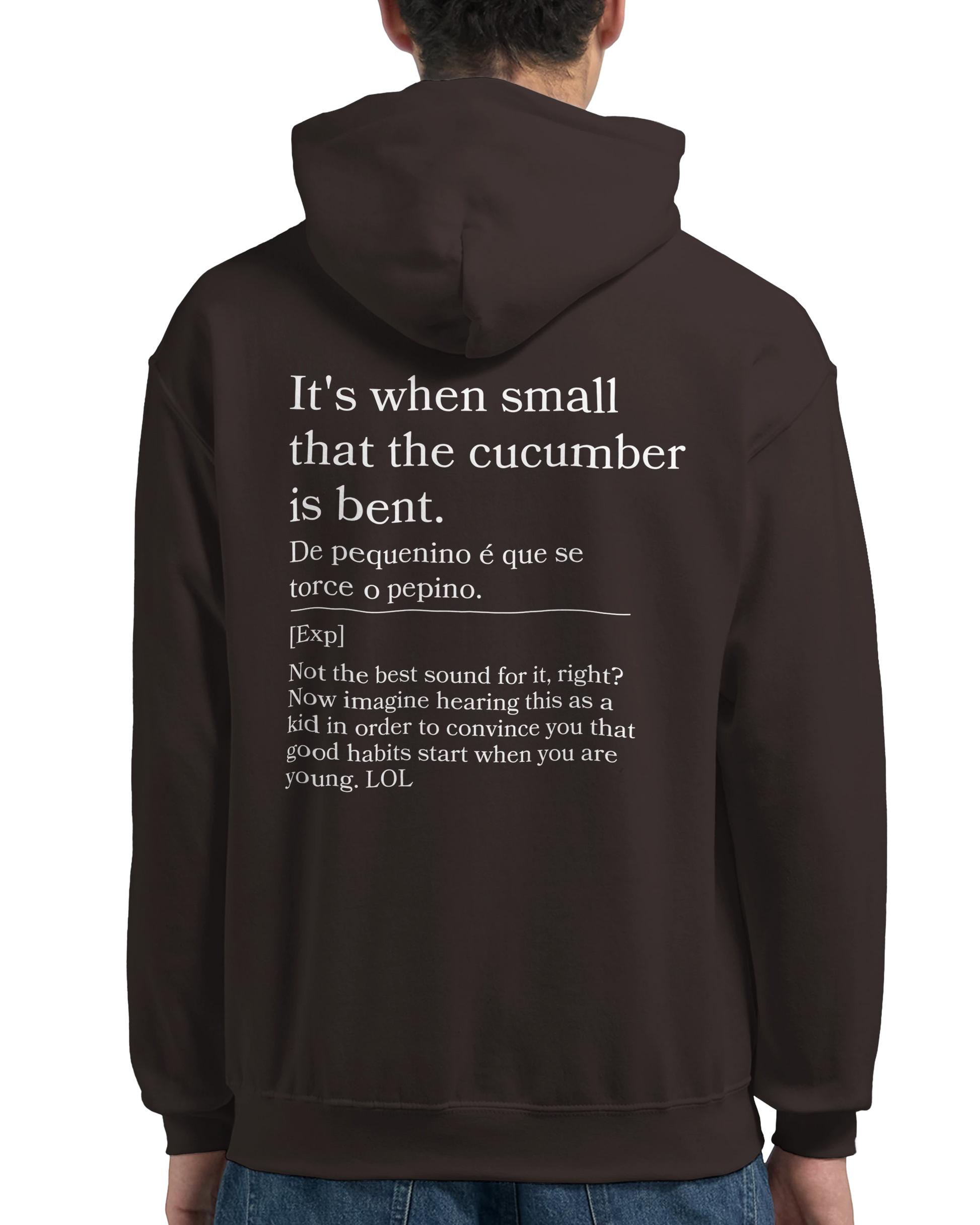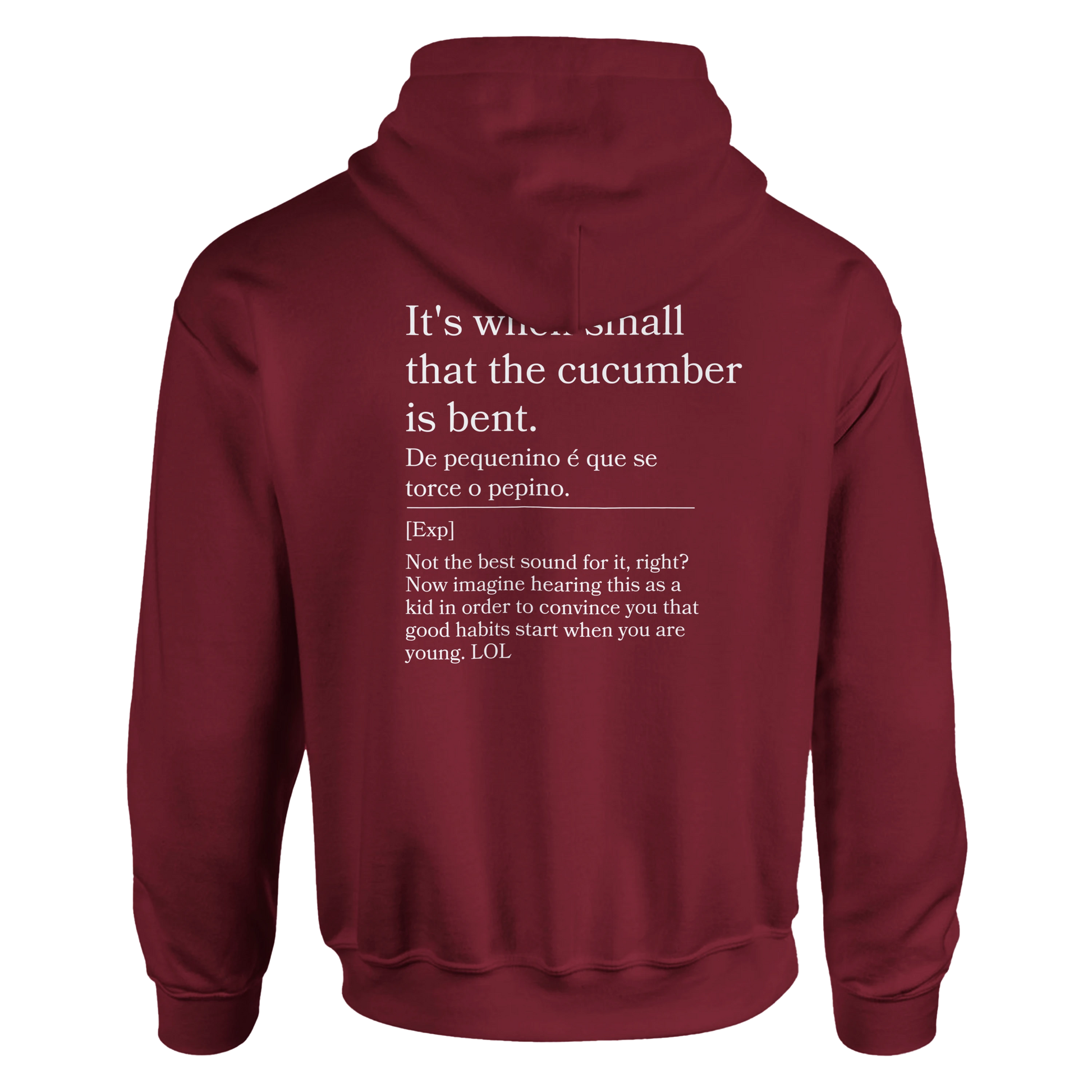 Start good habits early—or at least that’s the message. This hoodie proclaims “De pequenino é que se torce o pepino.” Back: “Form habits young.” or at least that is what your parents want you to believe in.