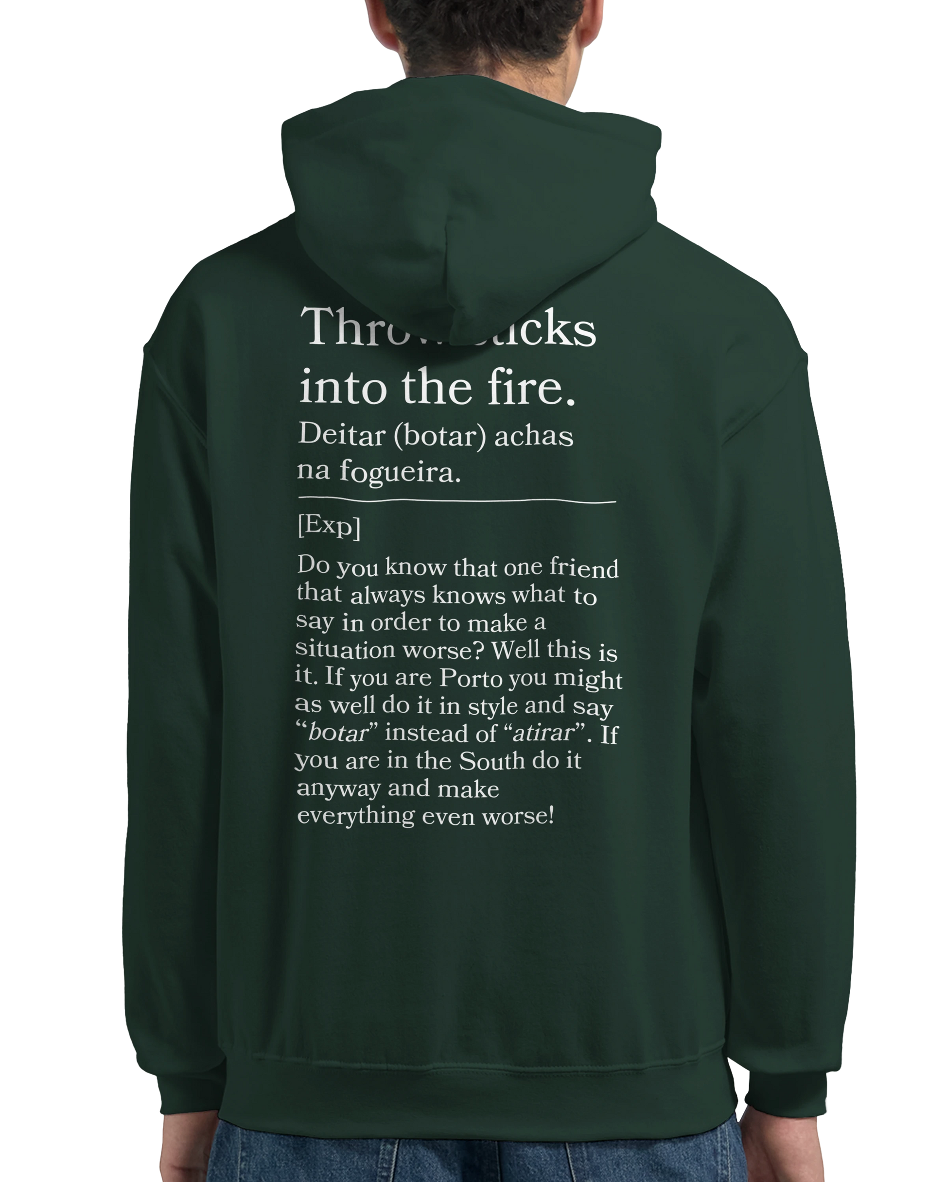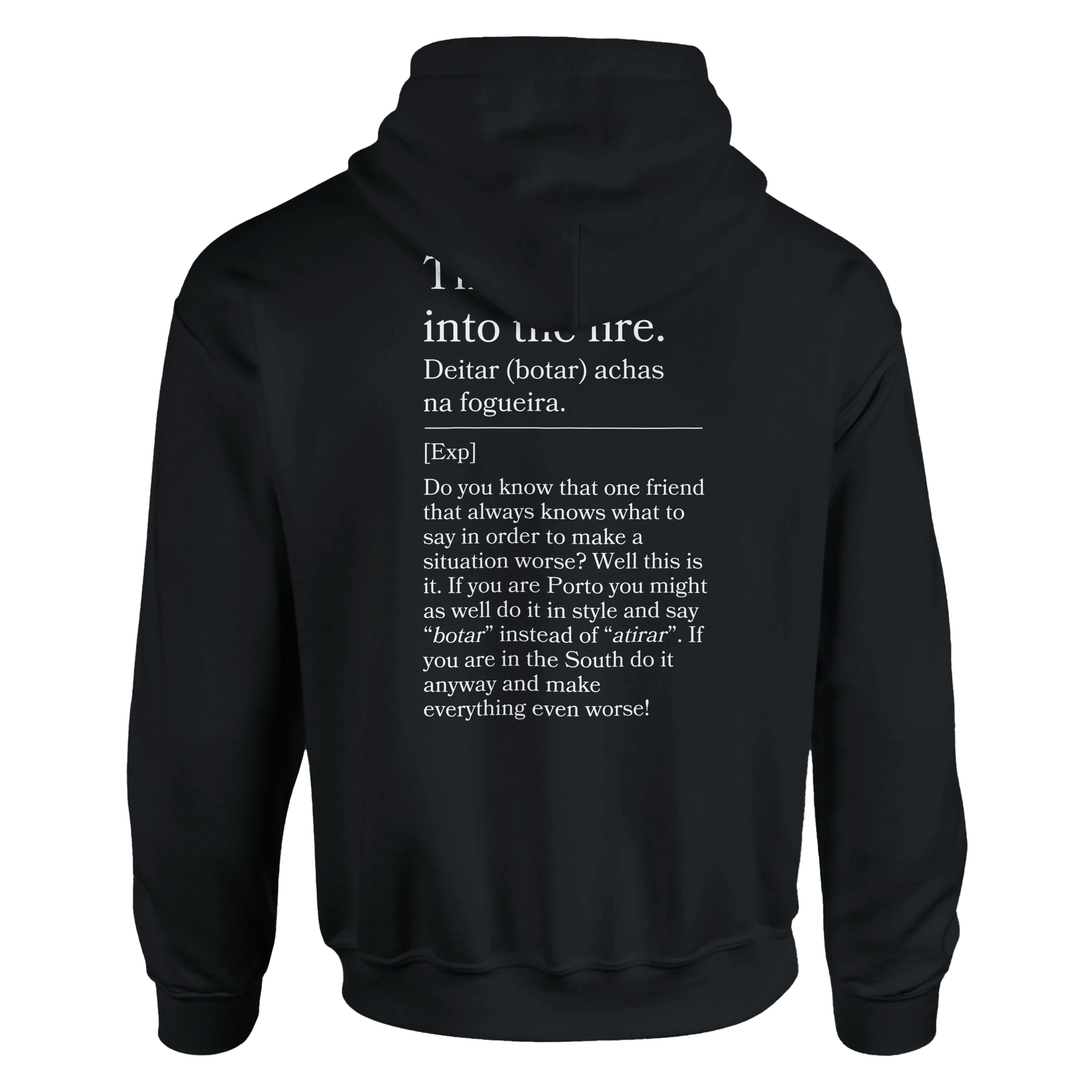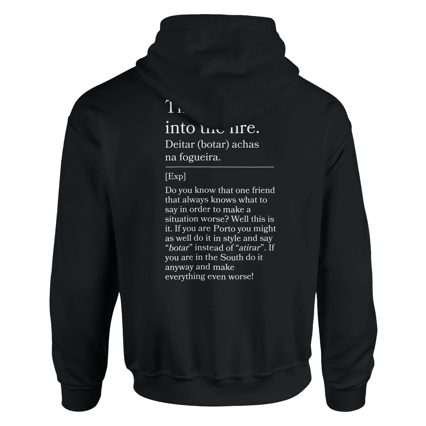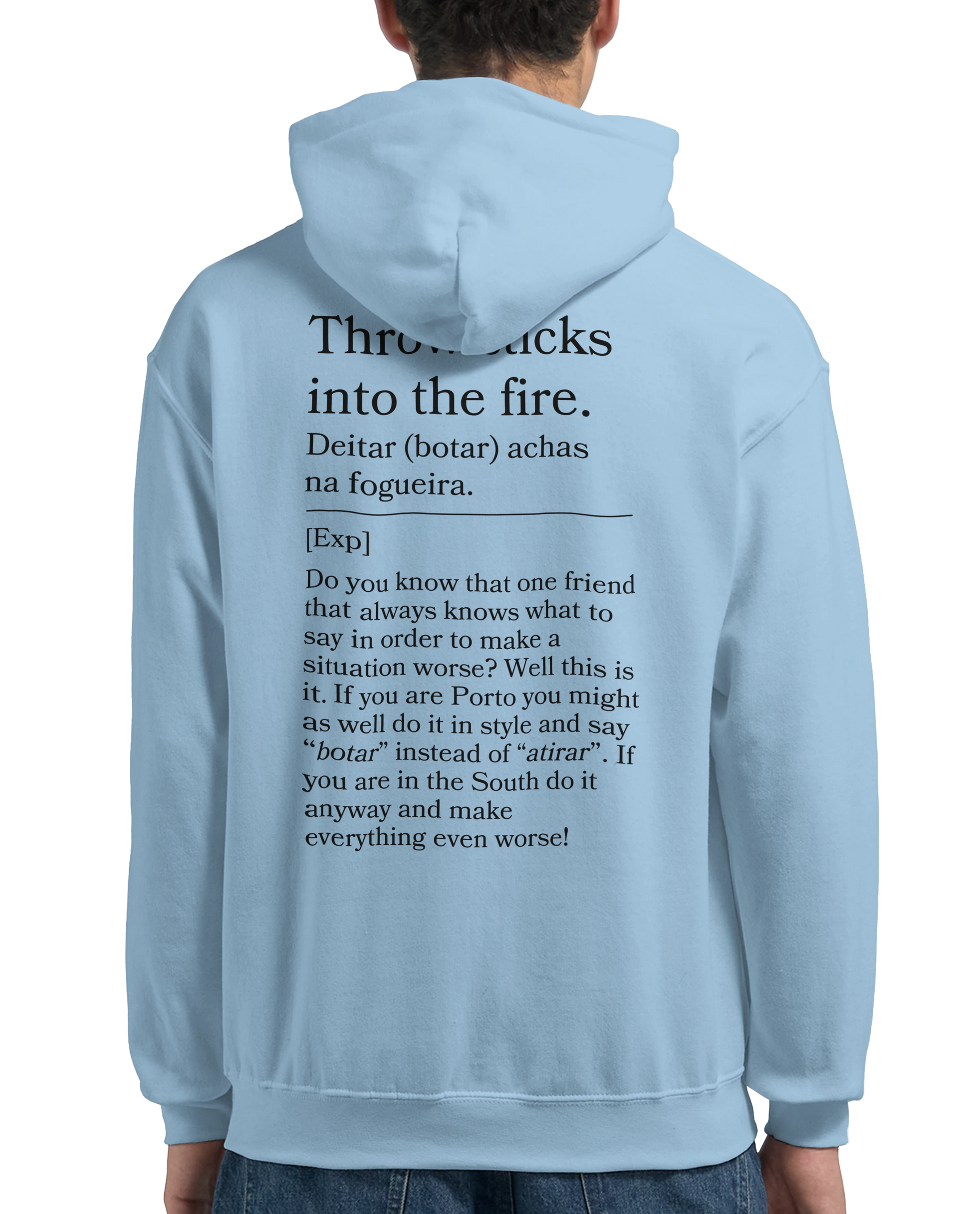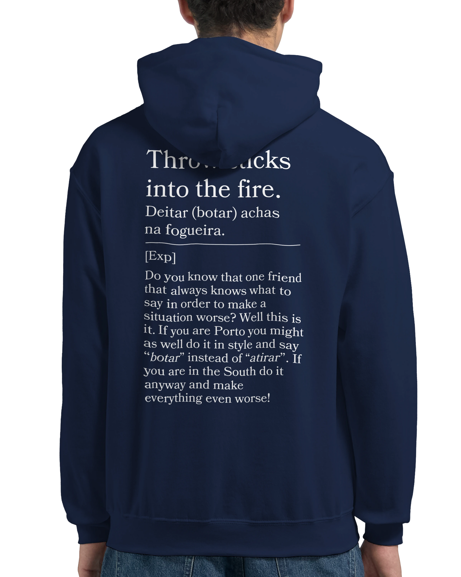 Got that friend who always makes things worse? This hoodie says “Deitar achas na fogueira” across the chest, with a flaming back-print: “To fuel an argument.” Choose “botar” if you're Porto; “deitar” works everywhere else.