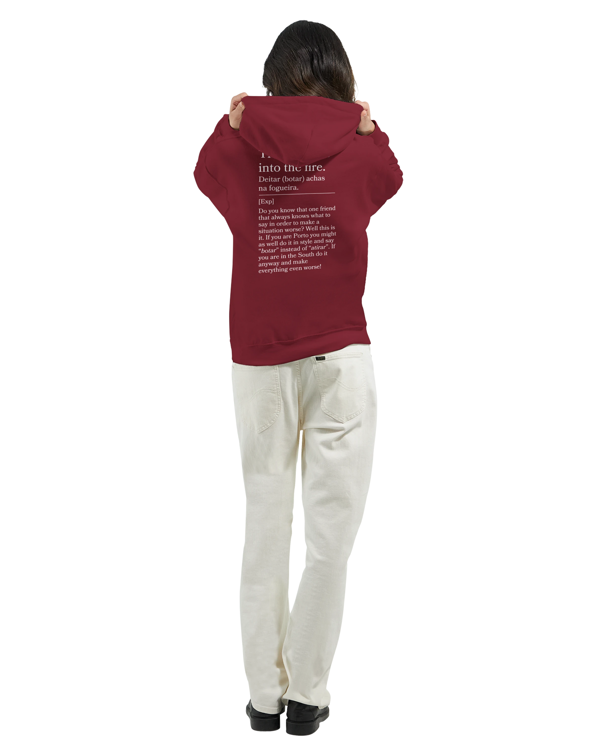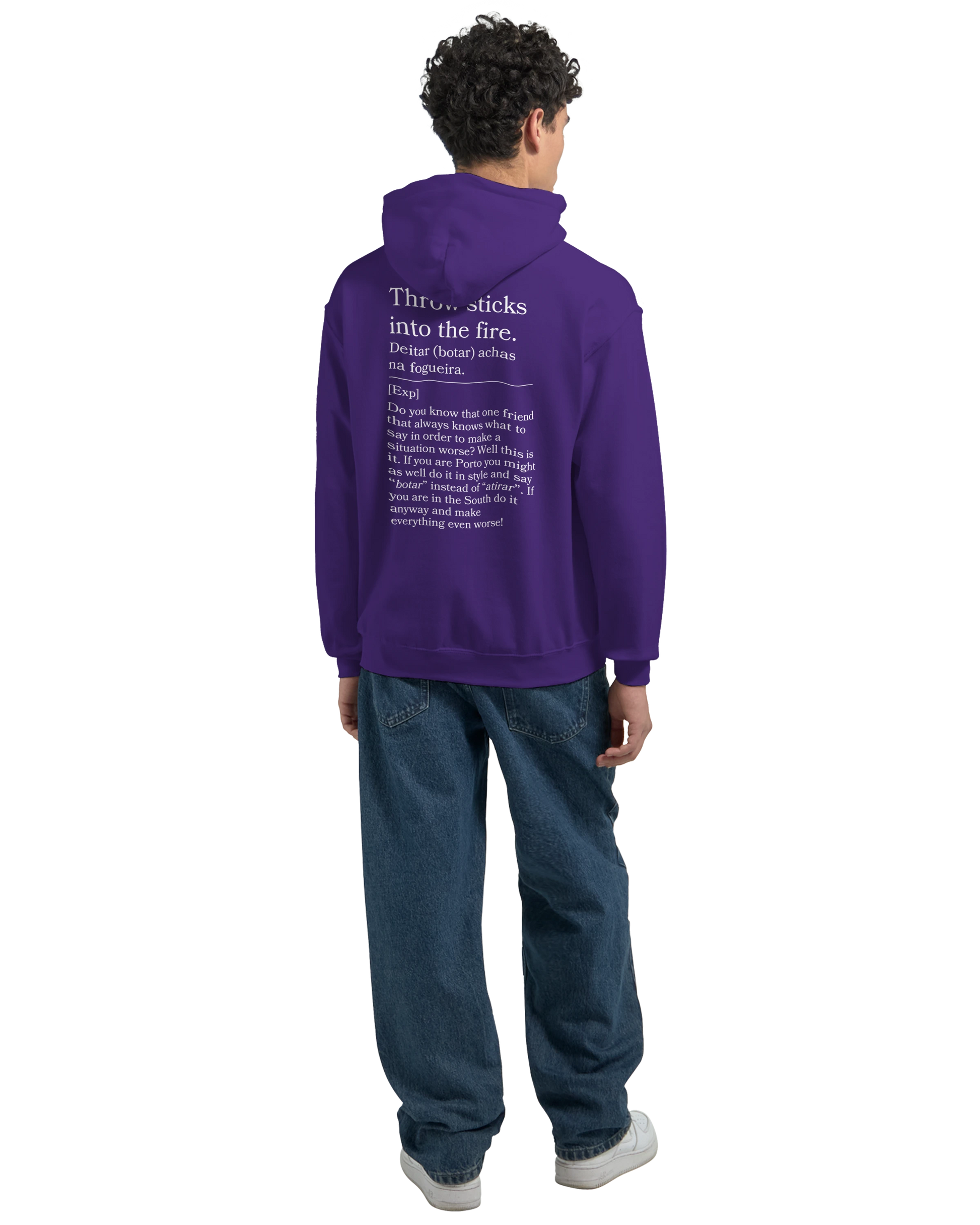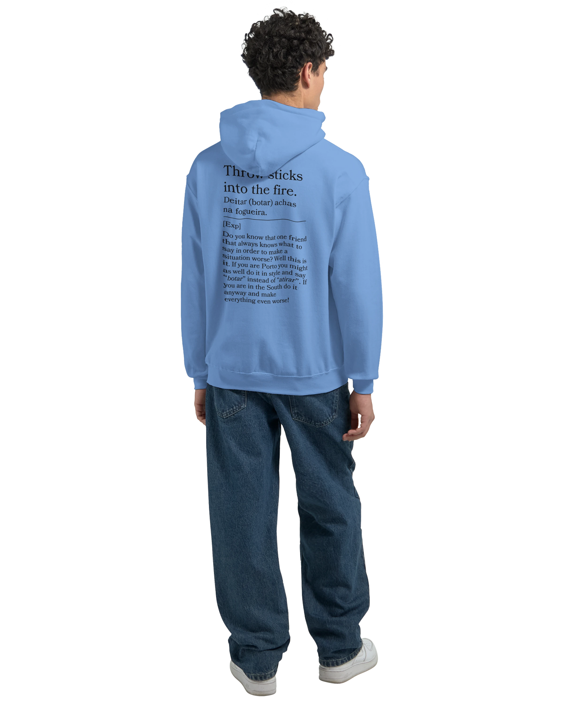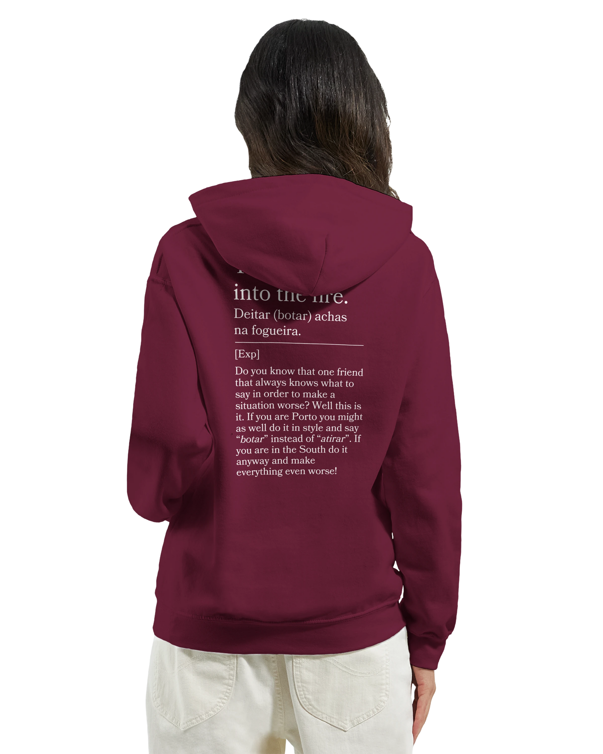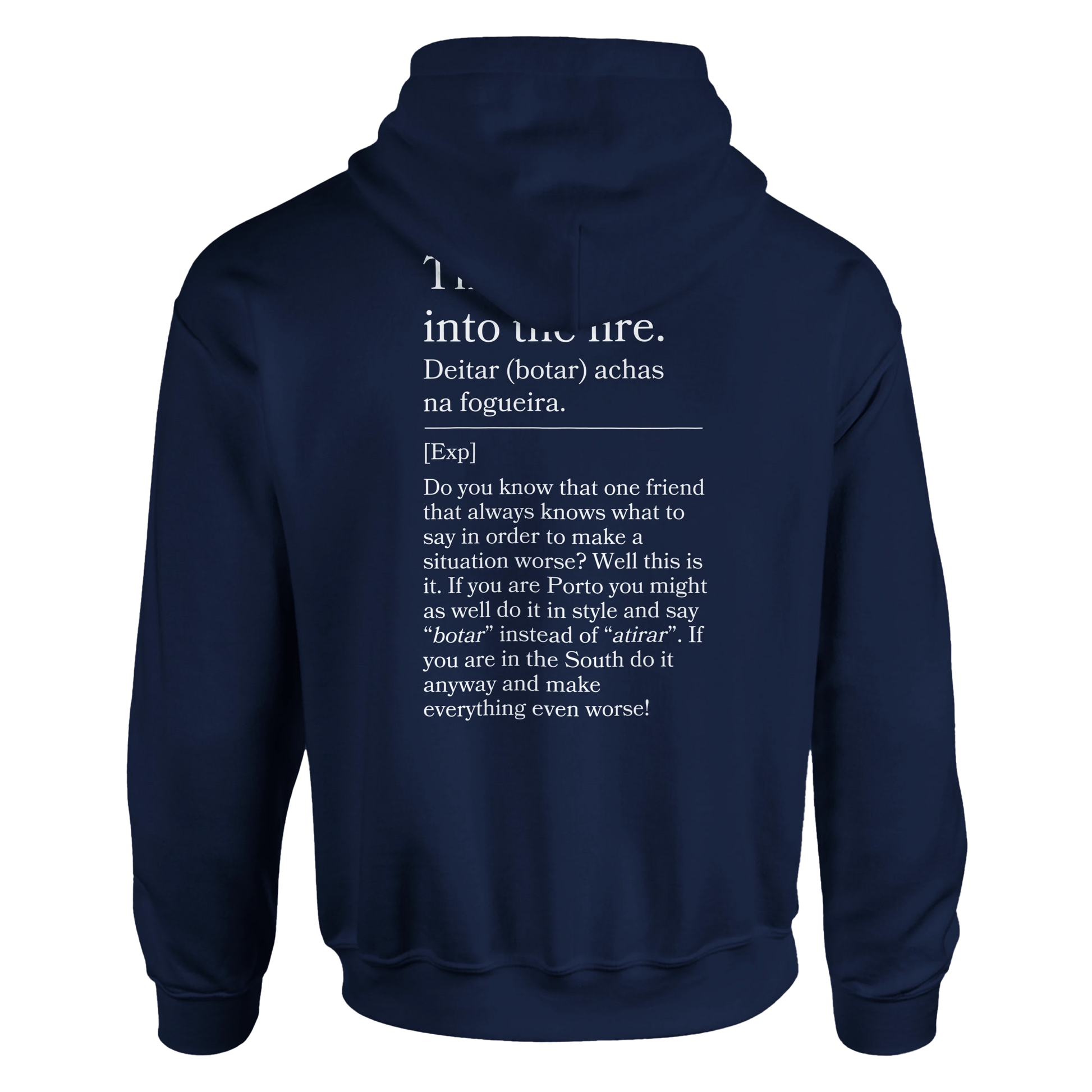 Got that friend who always makes things worse? This hoodie says “Deitar achas na fogueira” across the chest, with a flaming back-print: “To fuel an argument.” Choose “botar” if you're Porto; “deitar” works everywhere else.