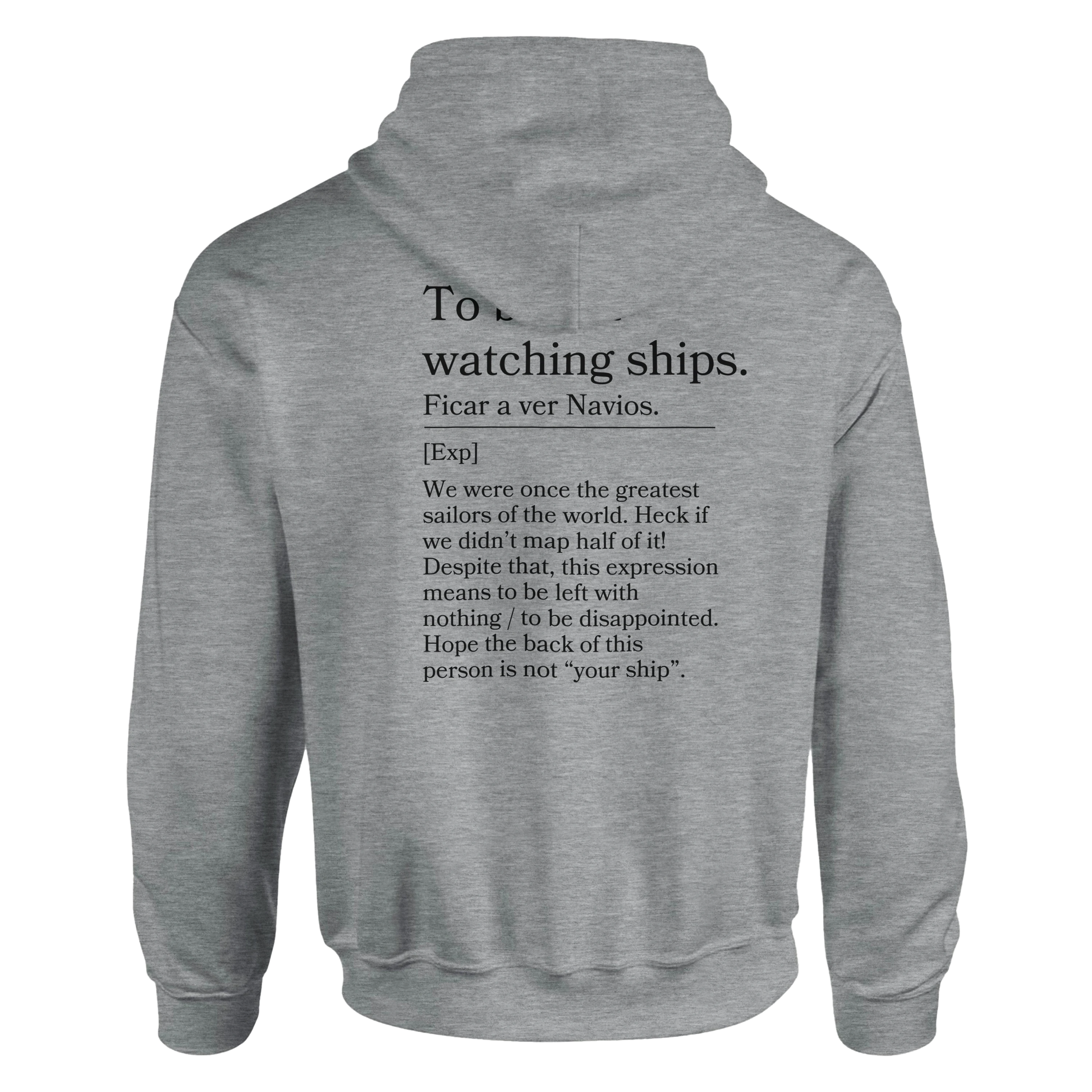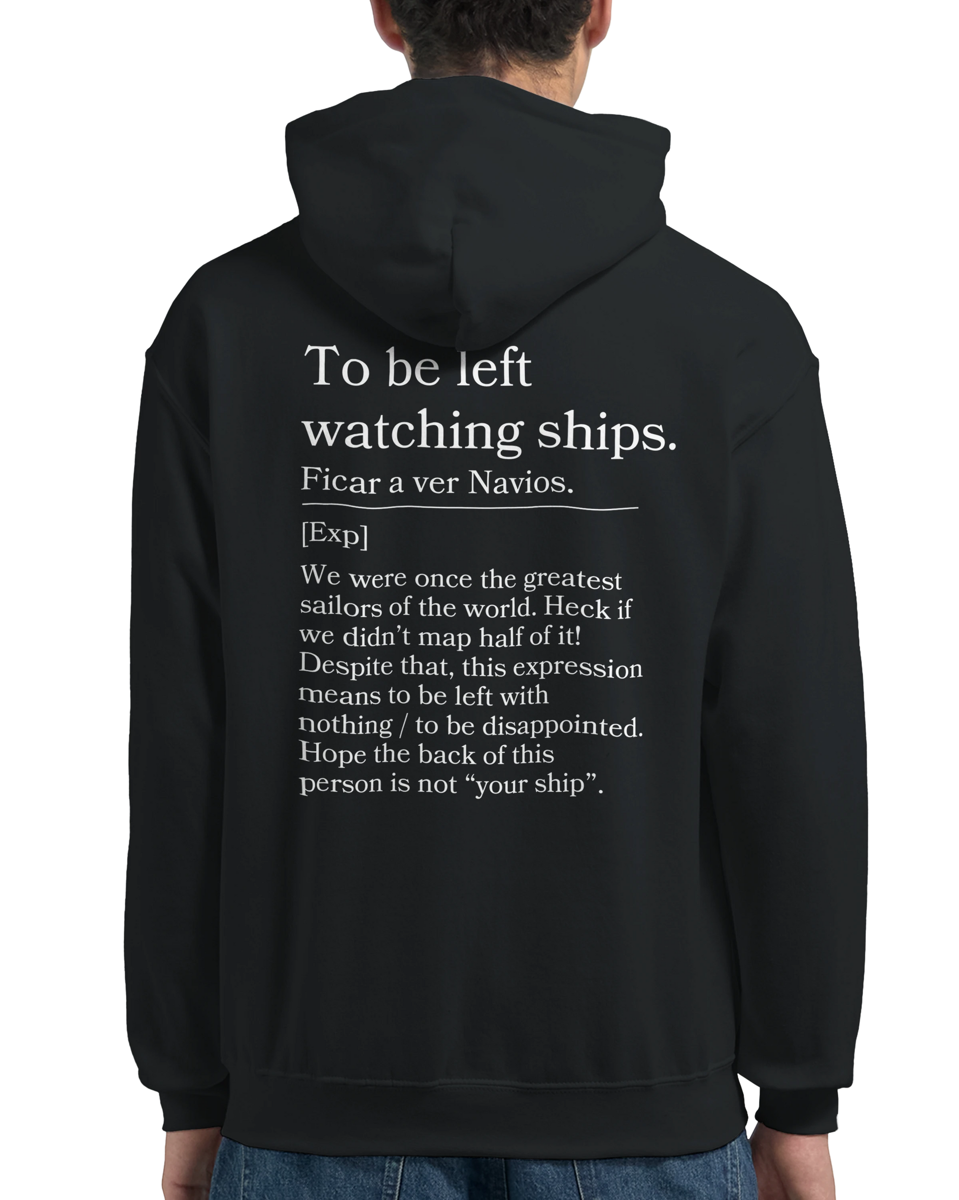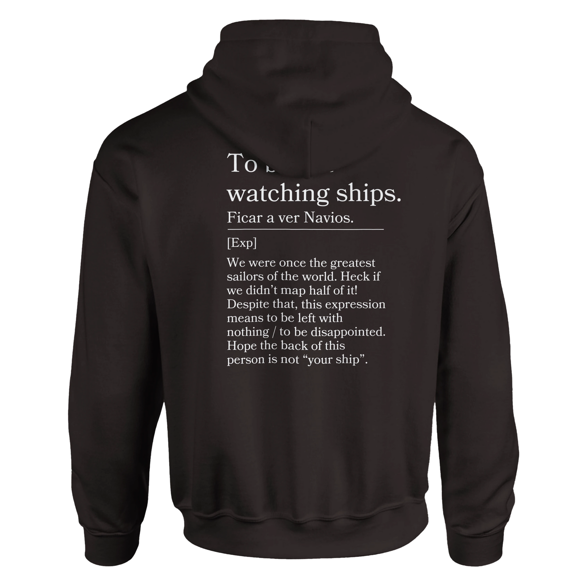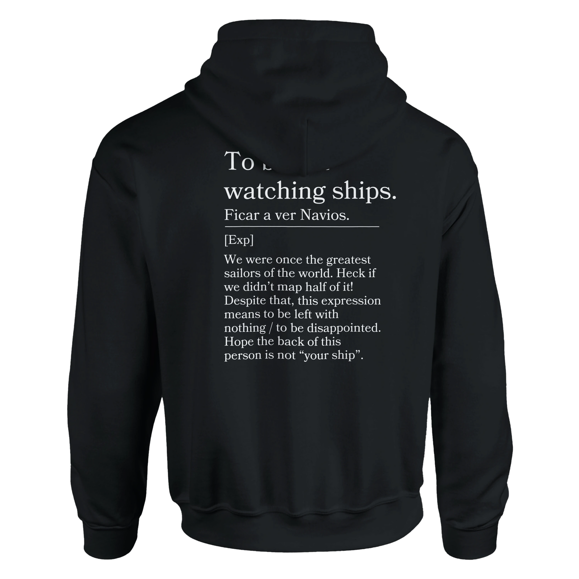Missed the boat again? This hoodie gets it. “Ficar a ver navios” on the chest, with a definition on the back: “To be left with nothing.” Nautical‑inspired design—perfect for the perpetually disappointed.