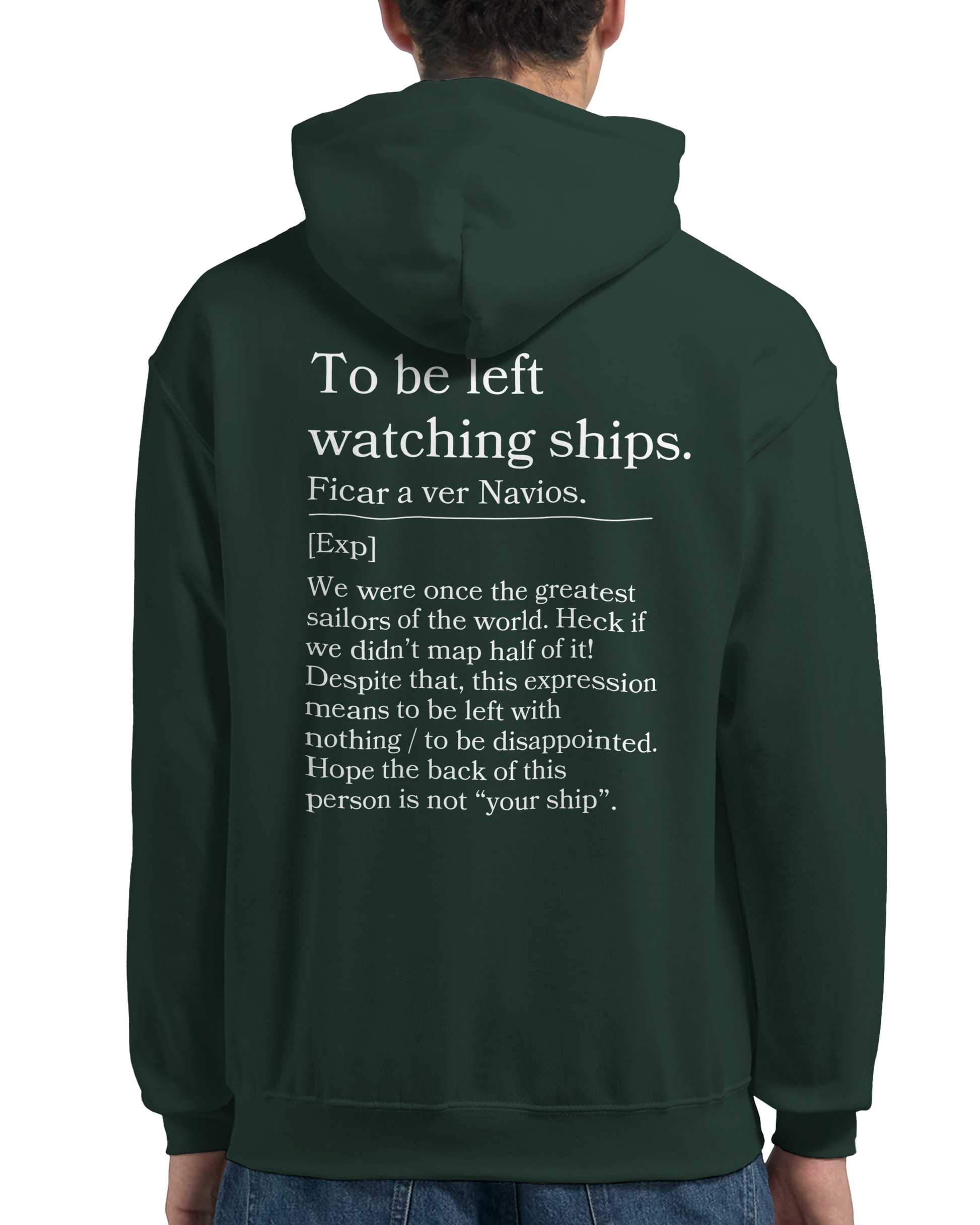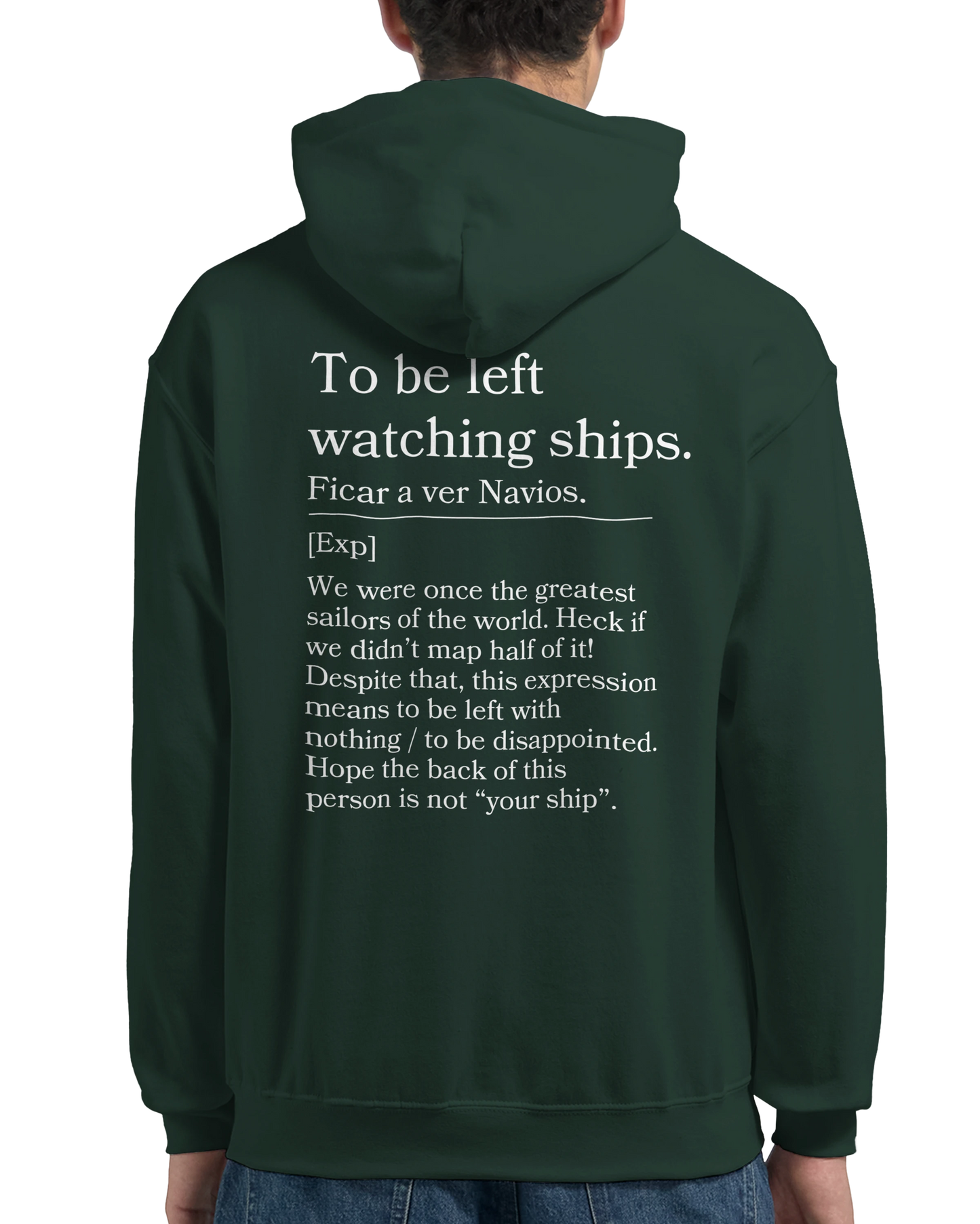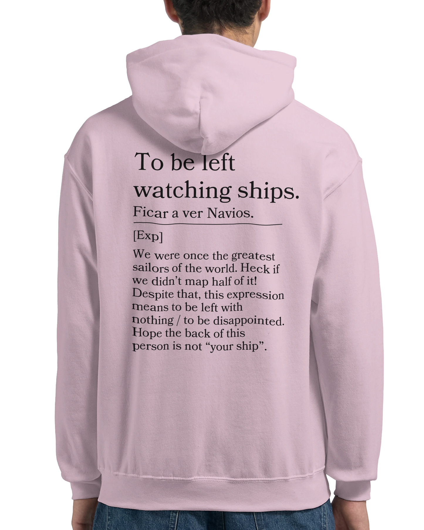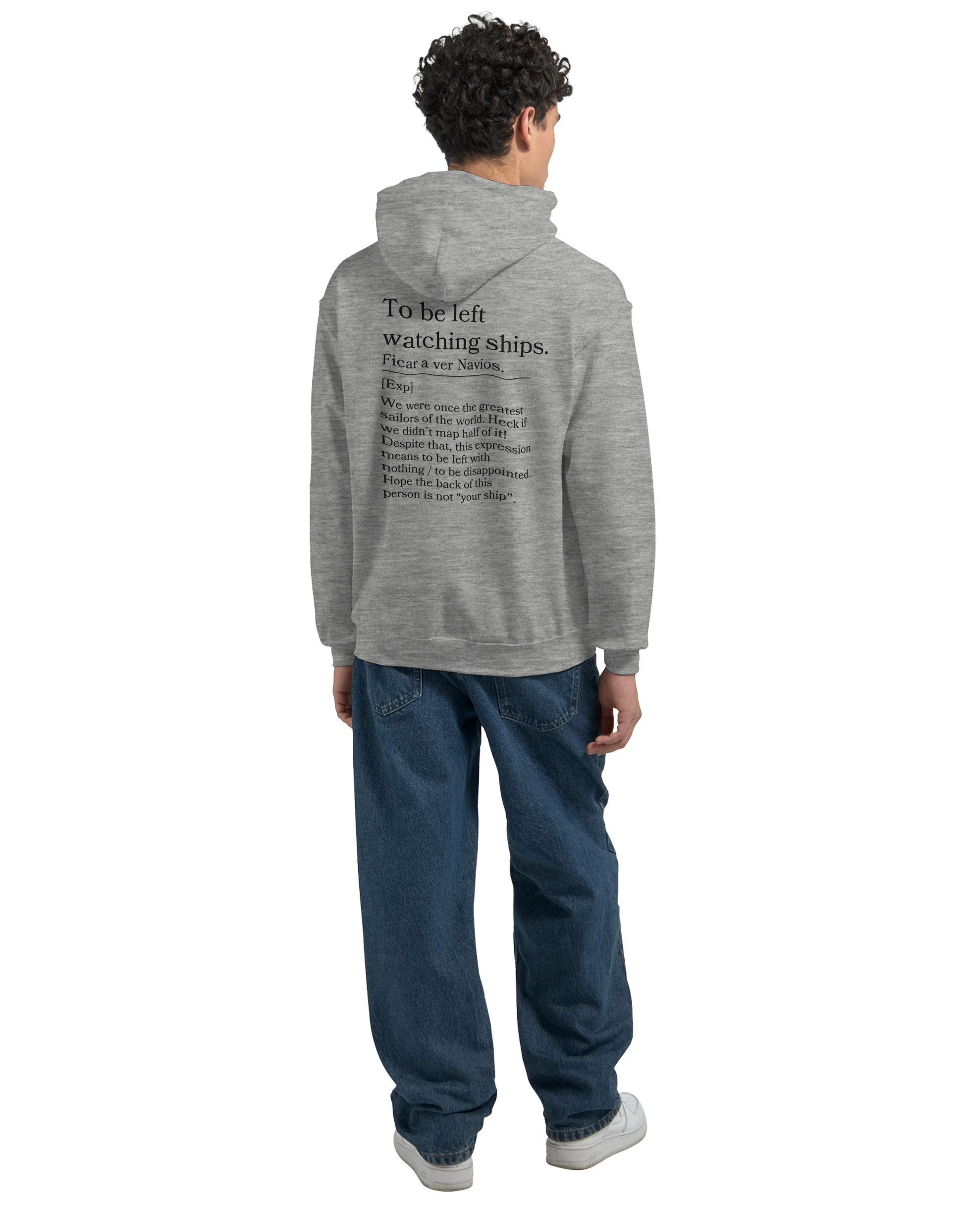 Missed the boat again? This hoodie gets it. “Ficar a ver navios” on the chest, with a definition on the back: “To be left with nothing.” Nautical‑inspired design—perfect for the perpetually disappointed.