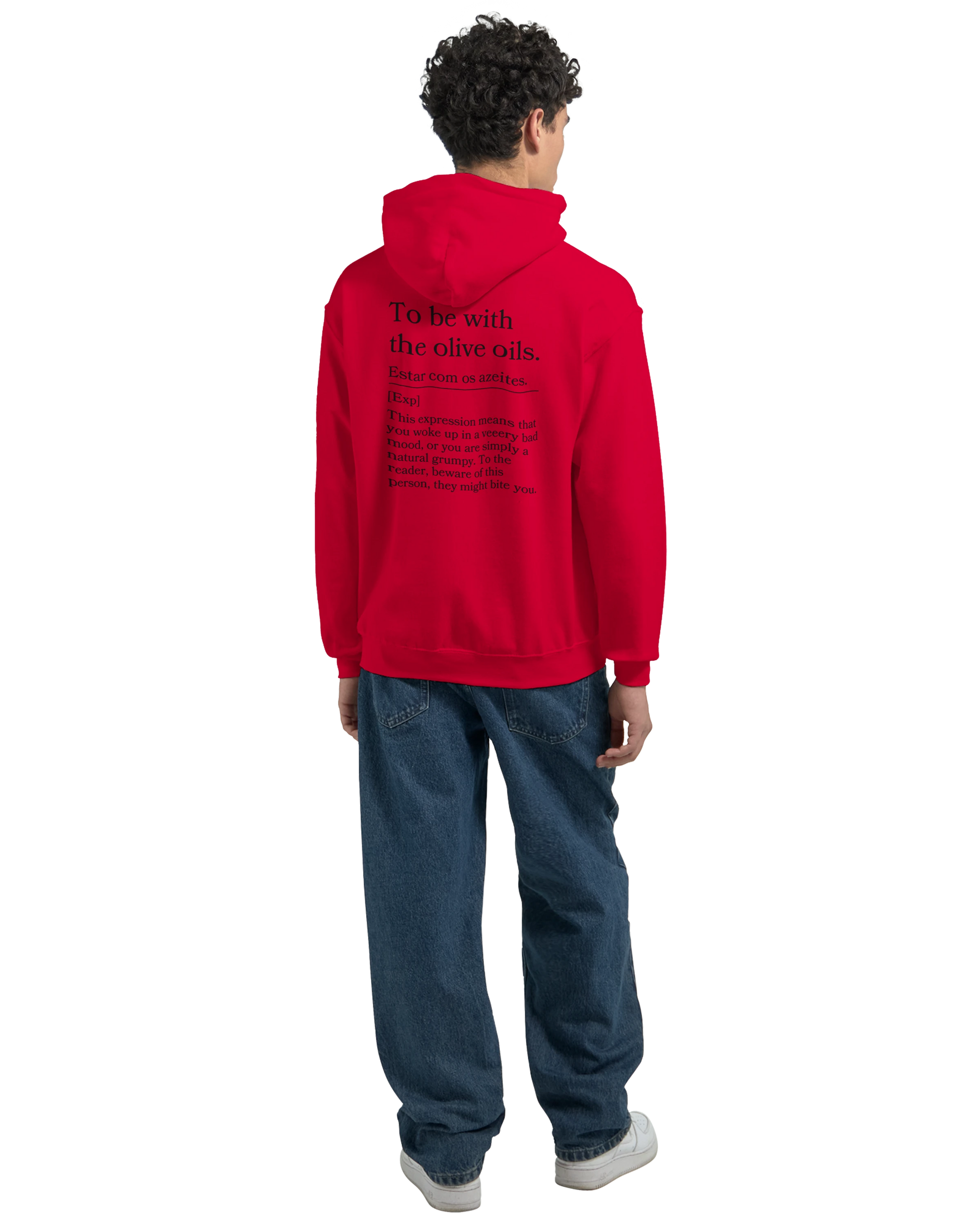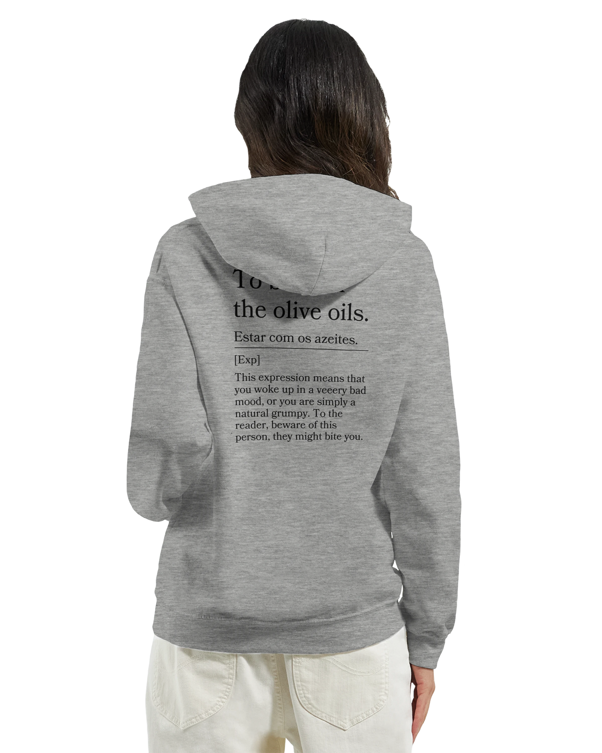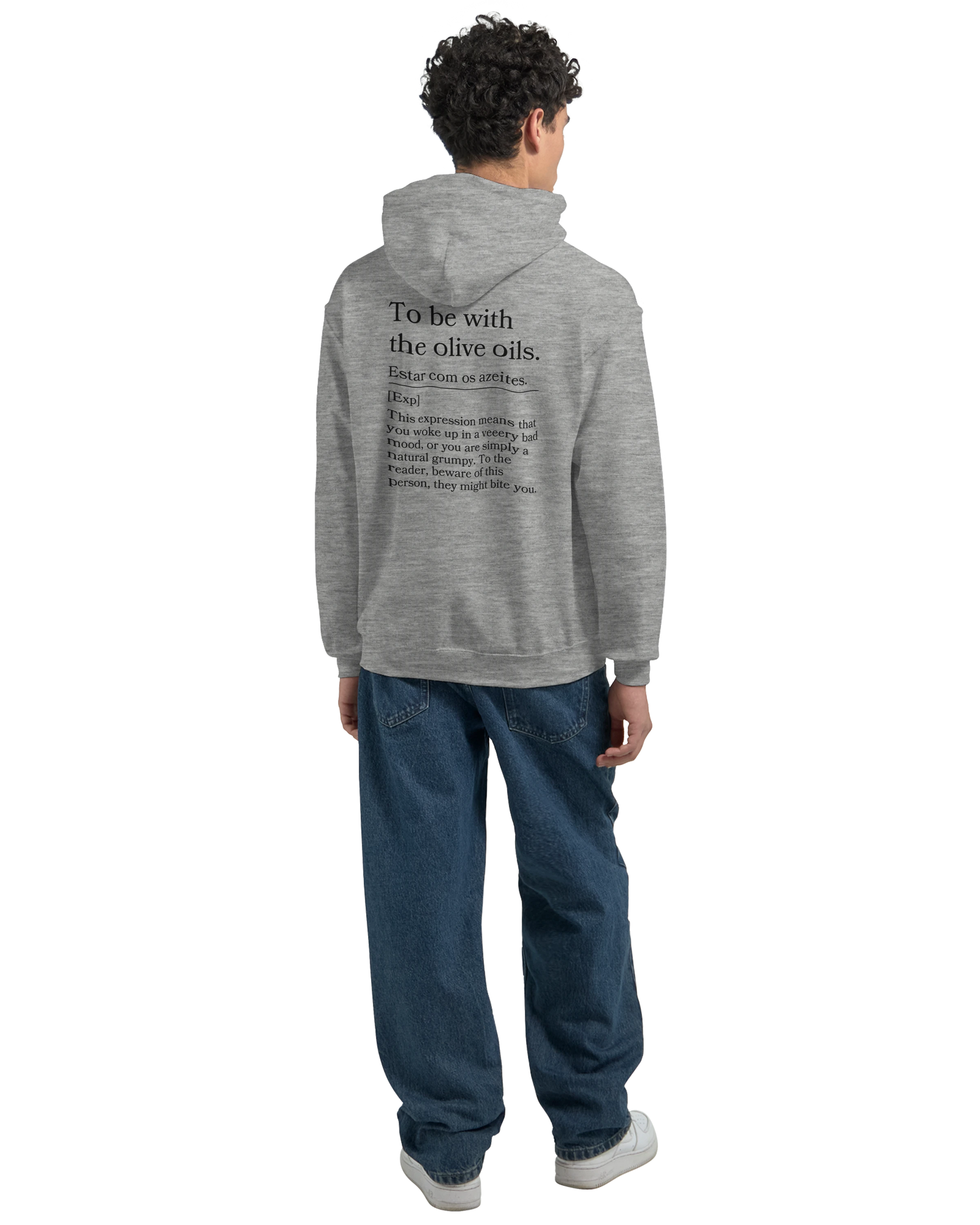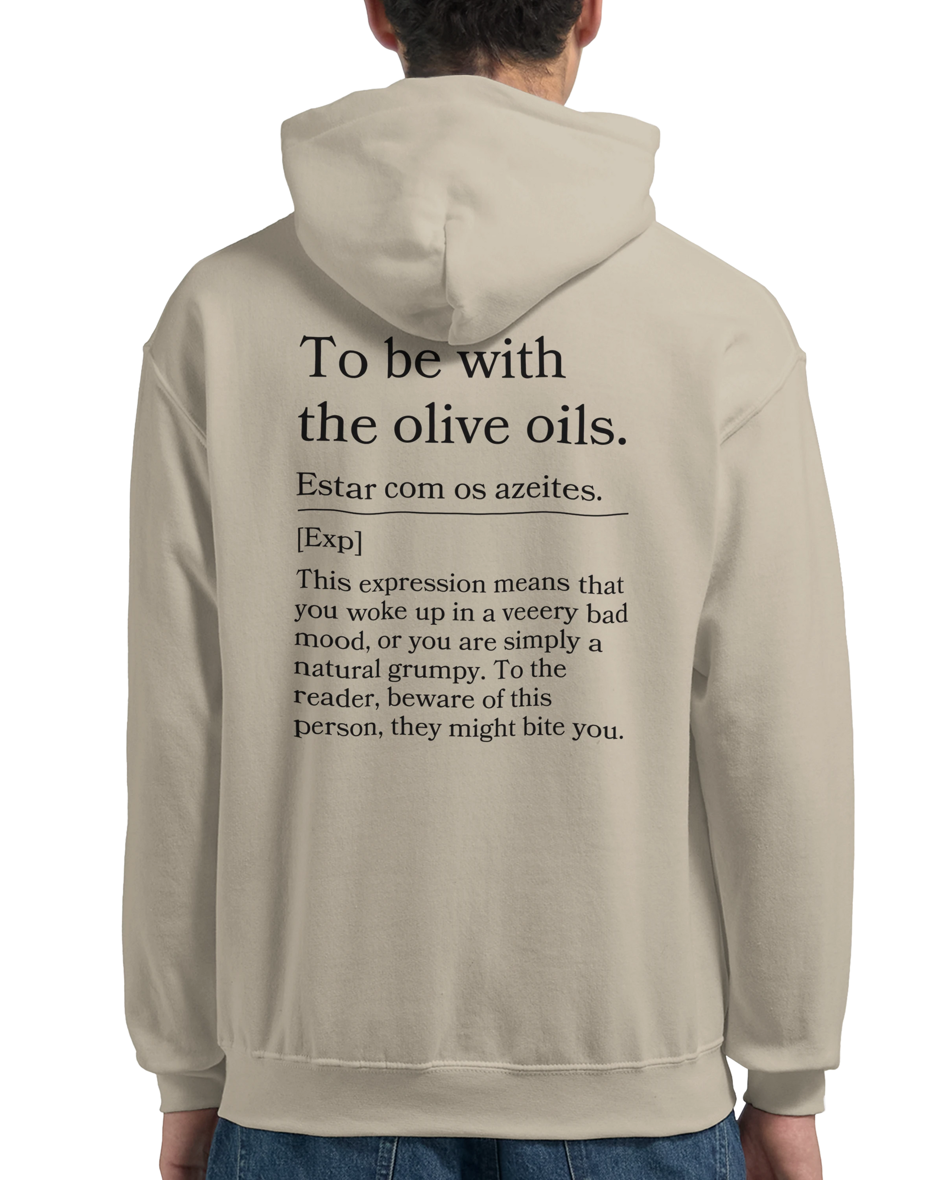 Feeling grumpy? This hoodie says it loud and proud: “Estar com os azeites.” Because waking up on the wrong side of the bed shouldn’t have to be quiet. With a cheeky dictionary-style back print, it warns everyone: avoid me until I’ve had coffee.