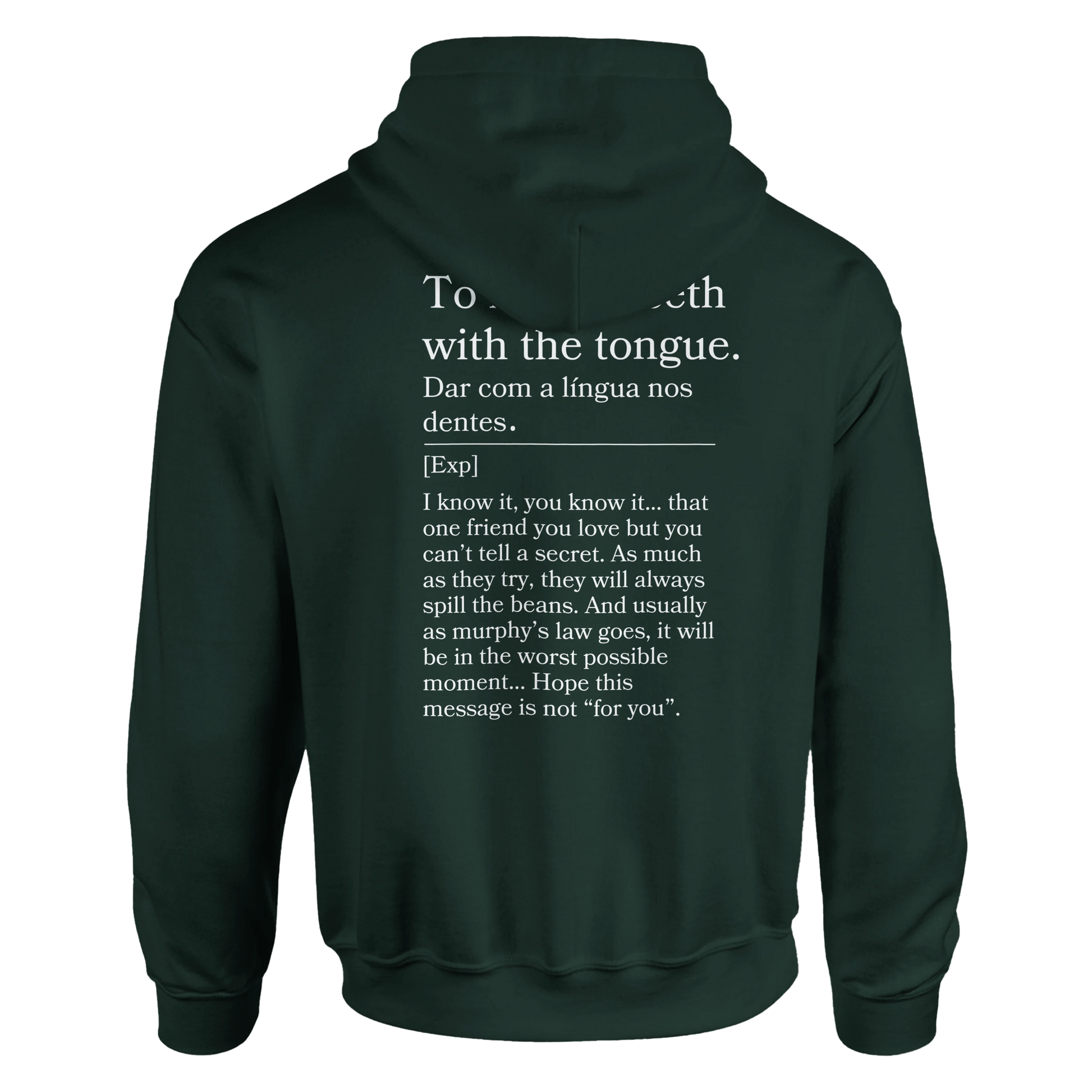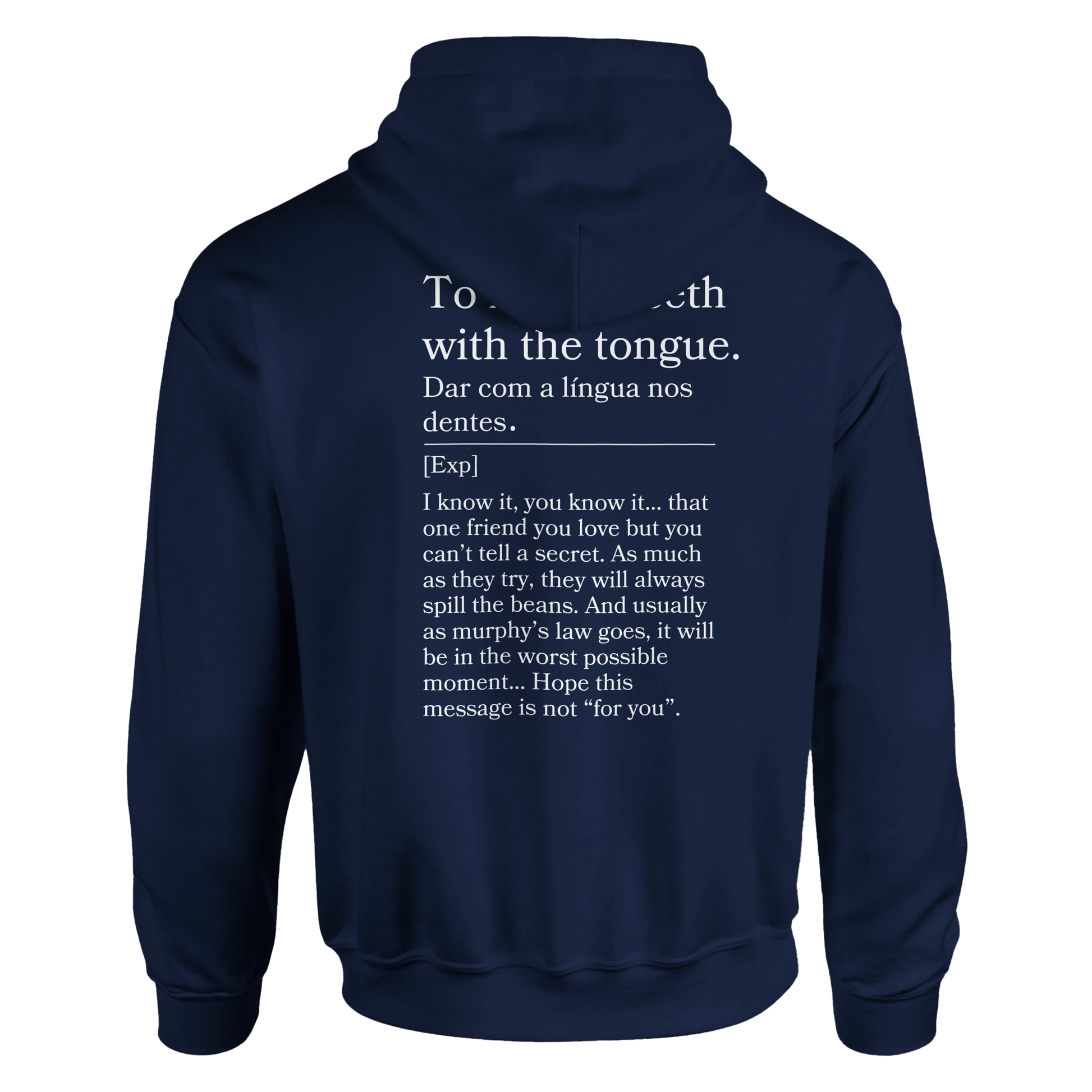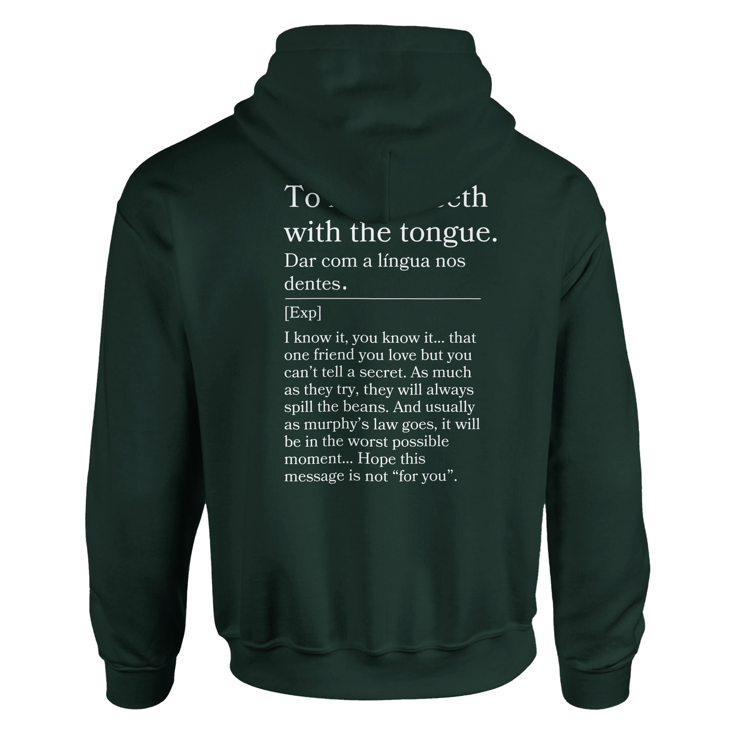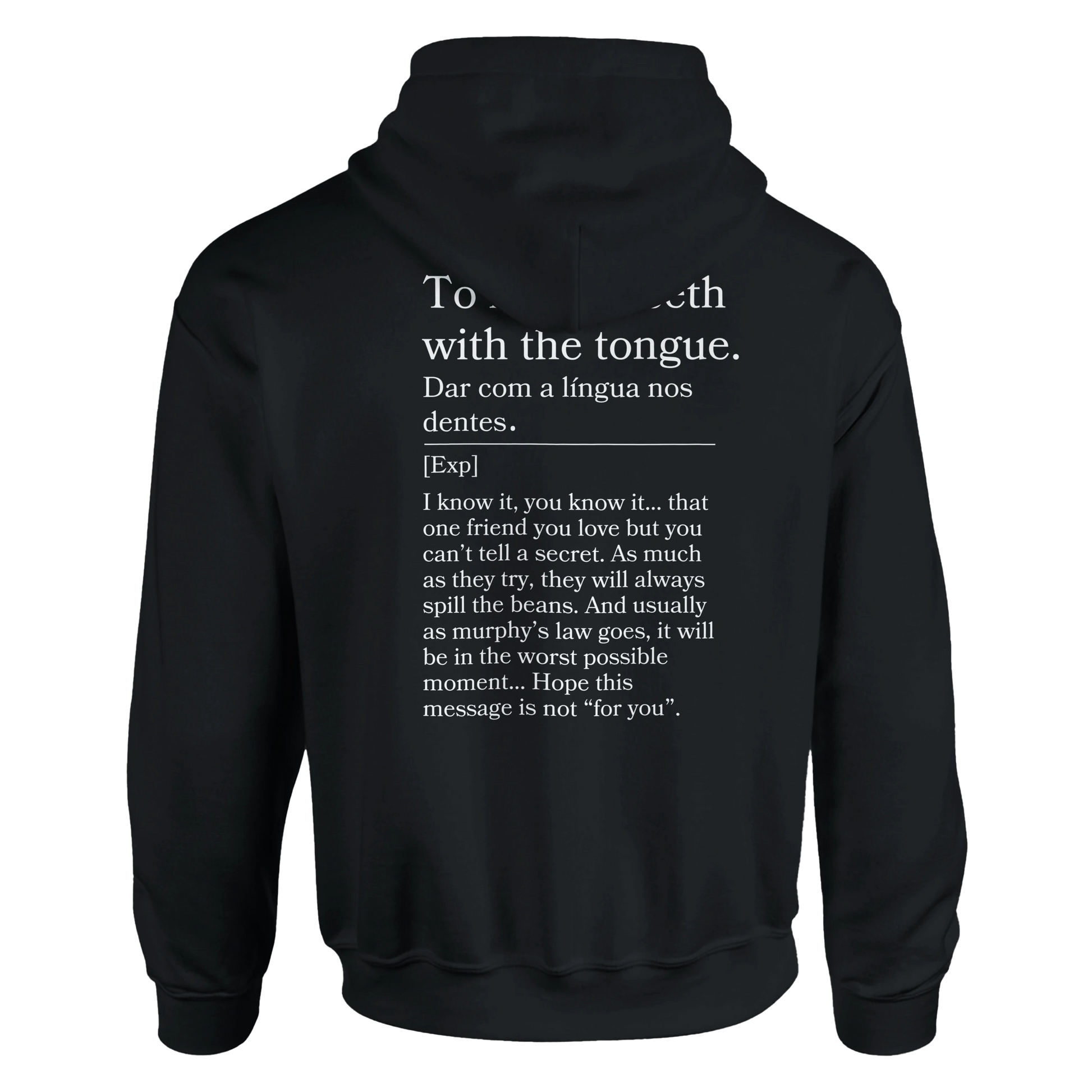 Gossip alert! This hoodie proclaims: “Dar com a língua nos dentes” — classic warning: don’t trust me with secrets. Back features a dictionary‑style hint: “To blab.” Great for the chatty friend.