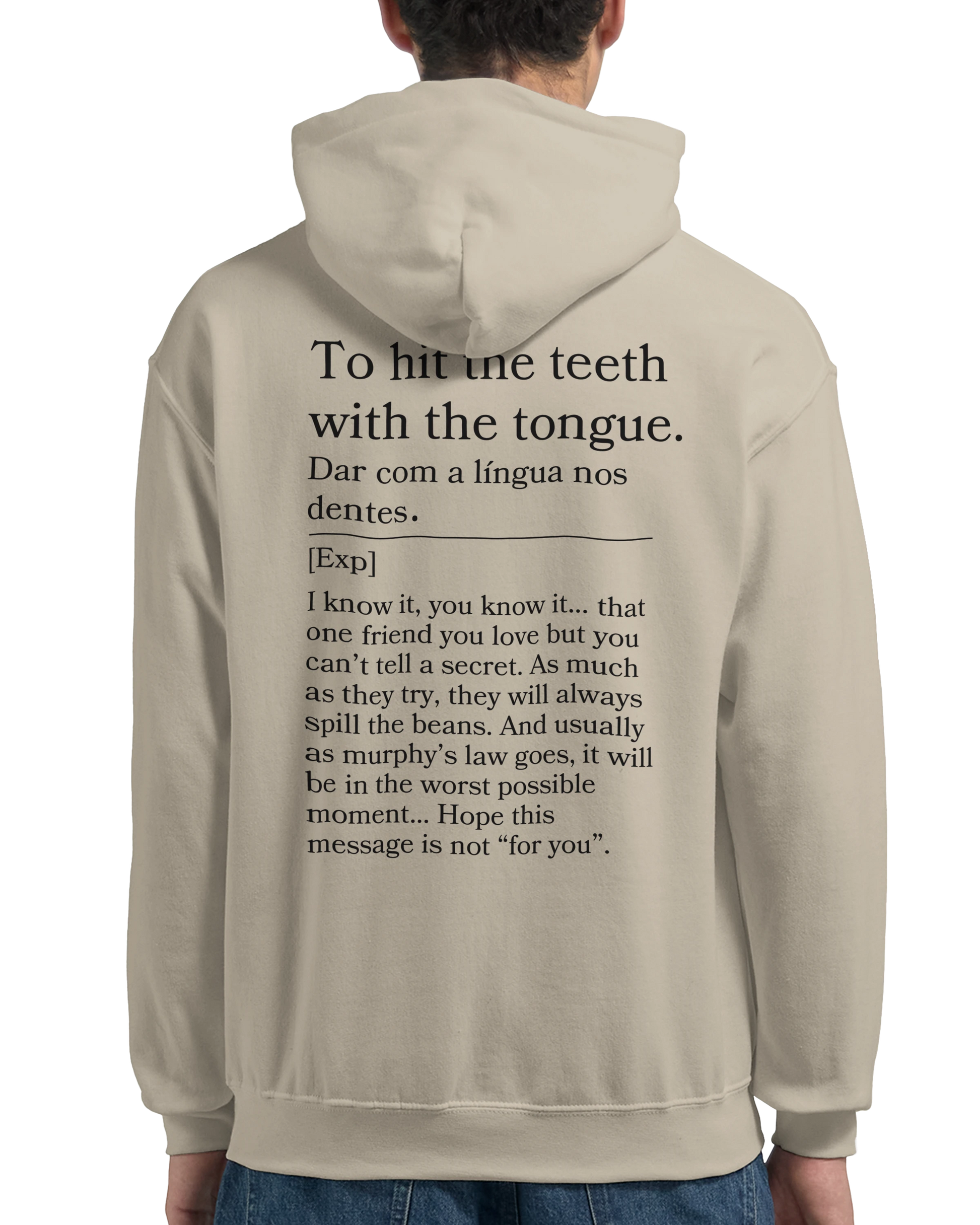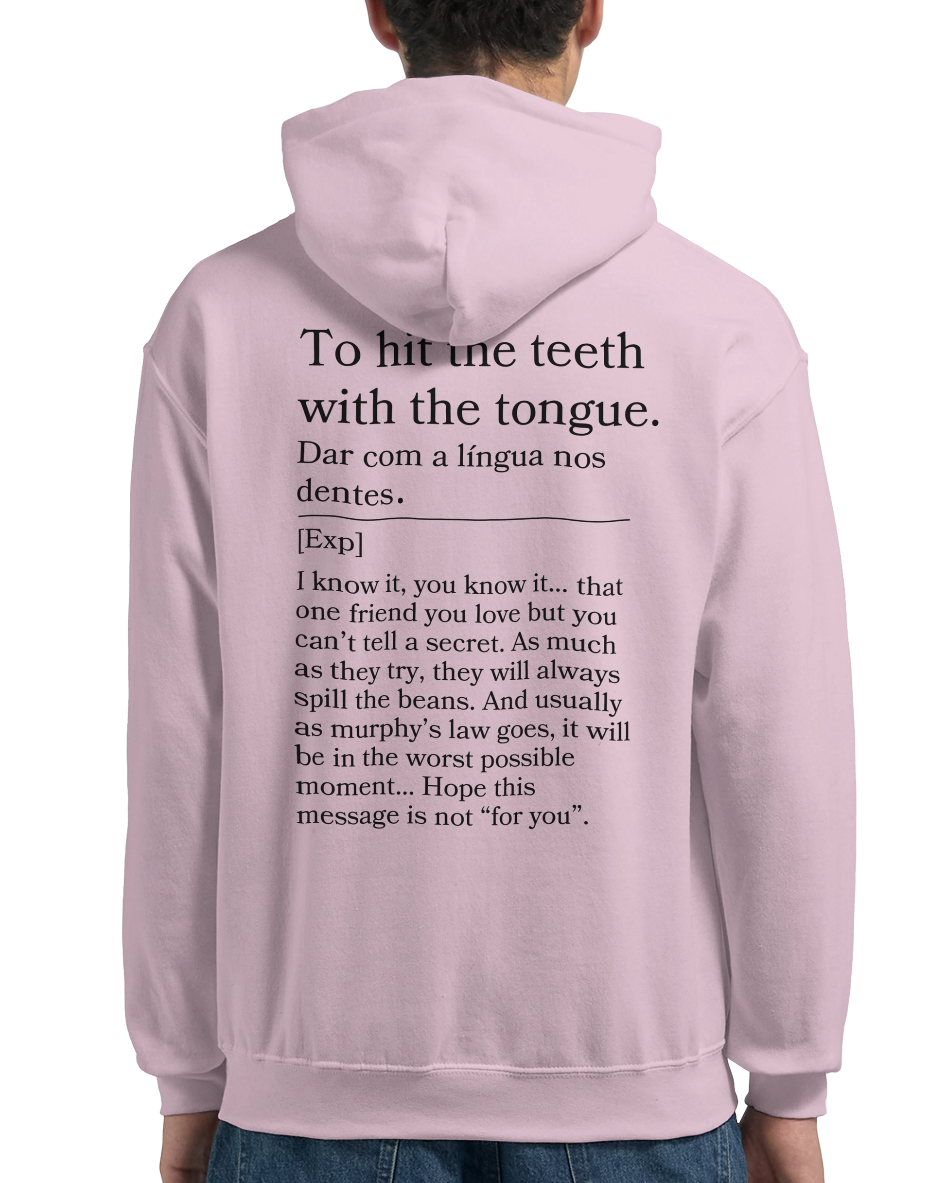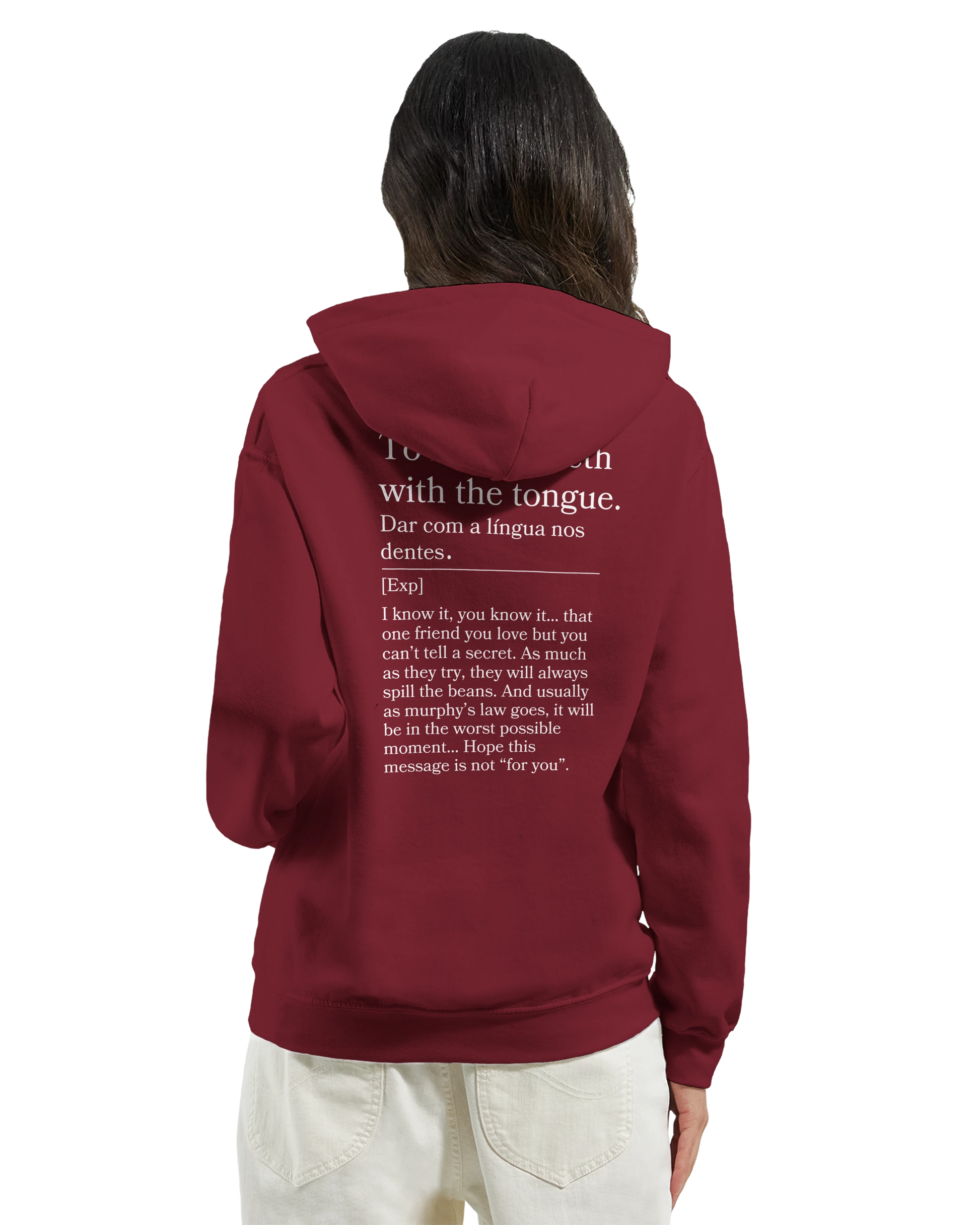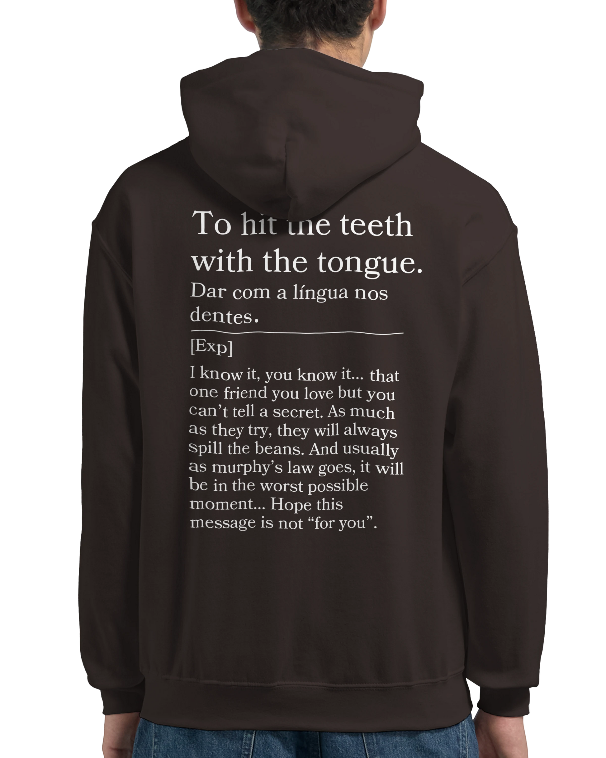 Gossip alert! This hoodie proclaims: “Dar com a língua nos dentes” — classic warning: don’t trust me with secrets. Back features a dictionary‑style hint: “To blab.” Great for the chatty friend.
