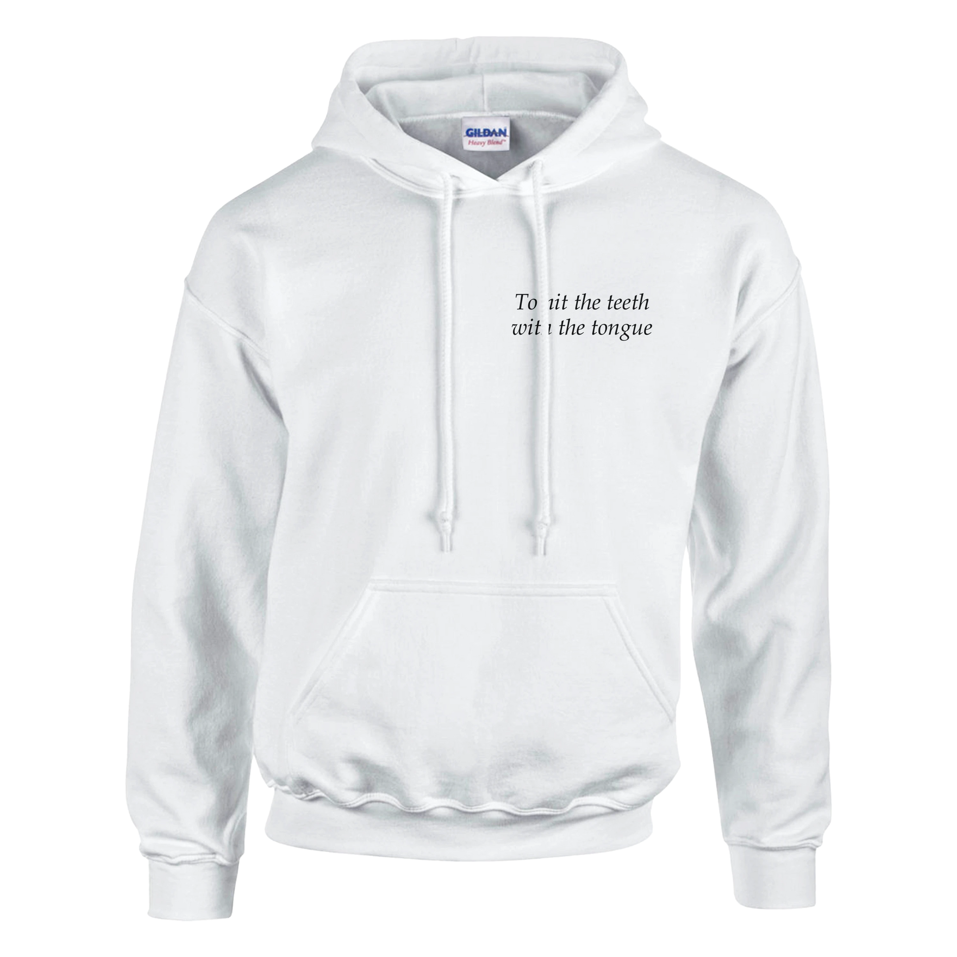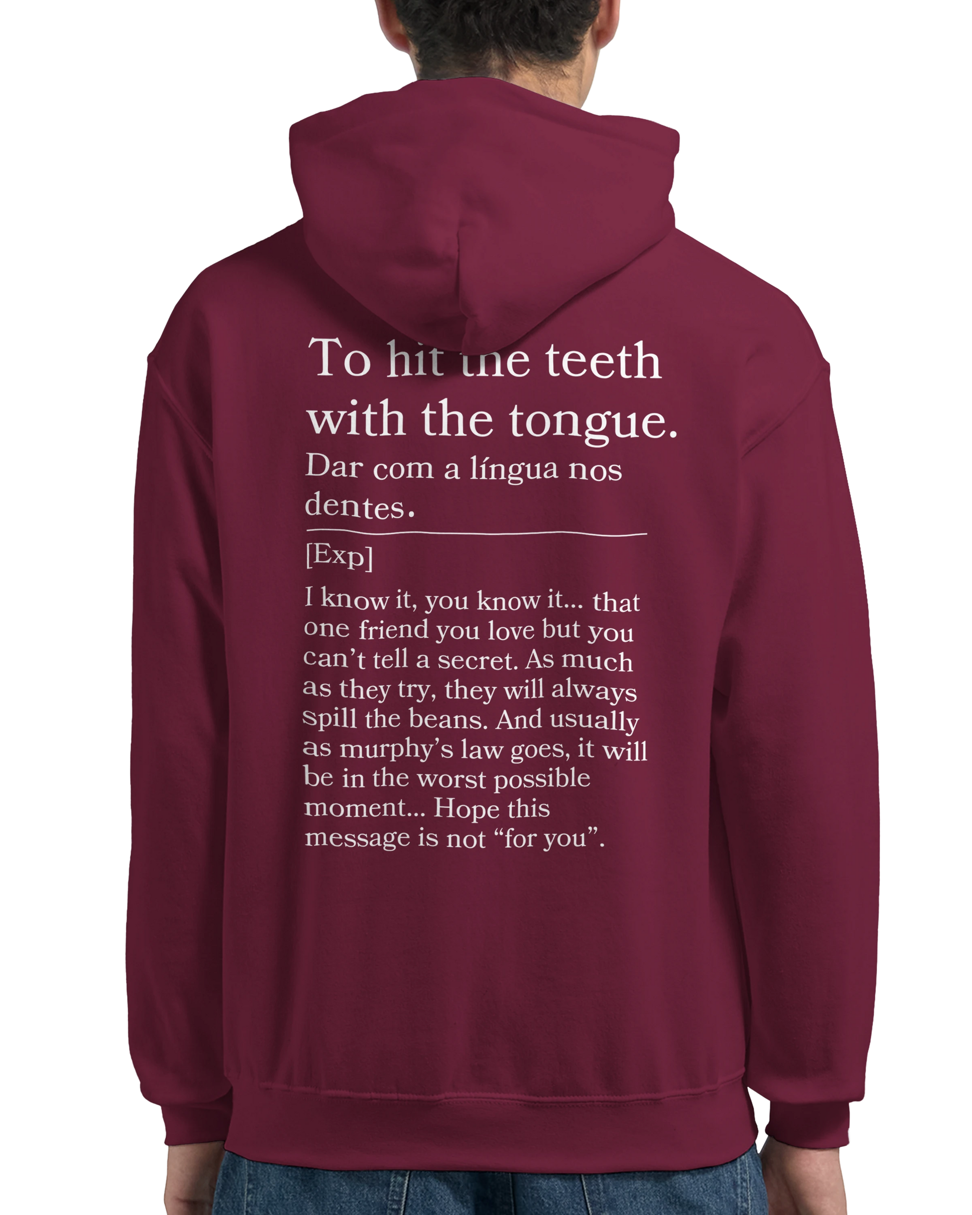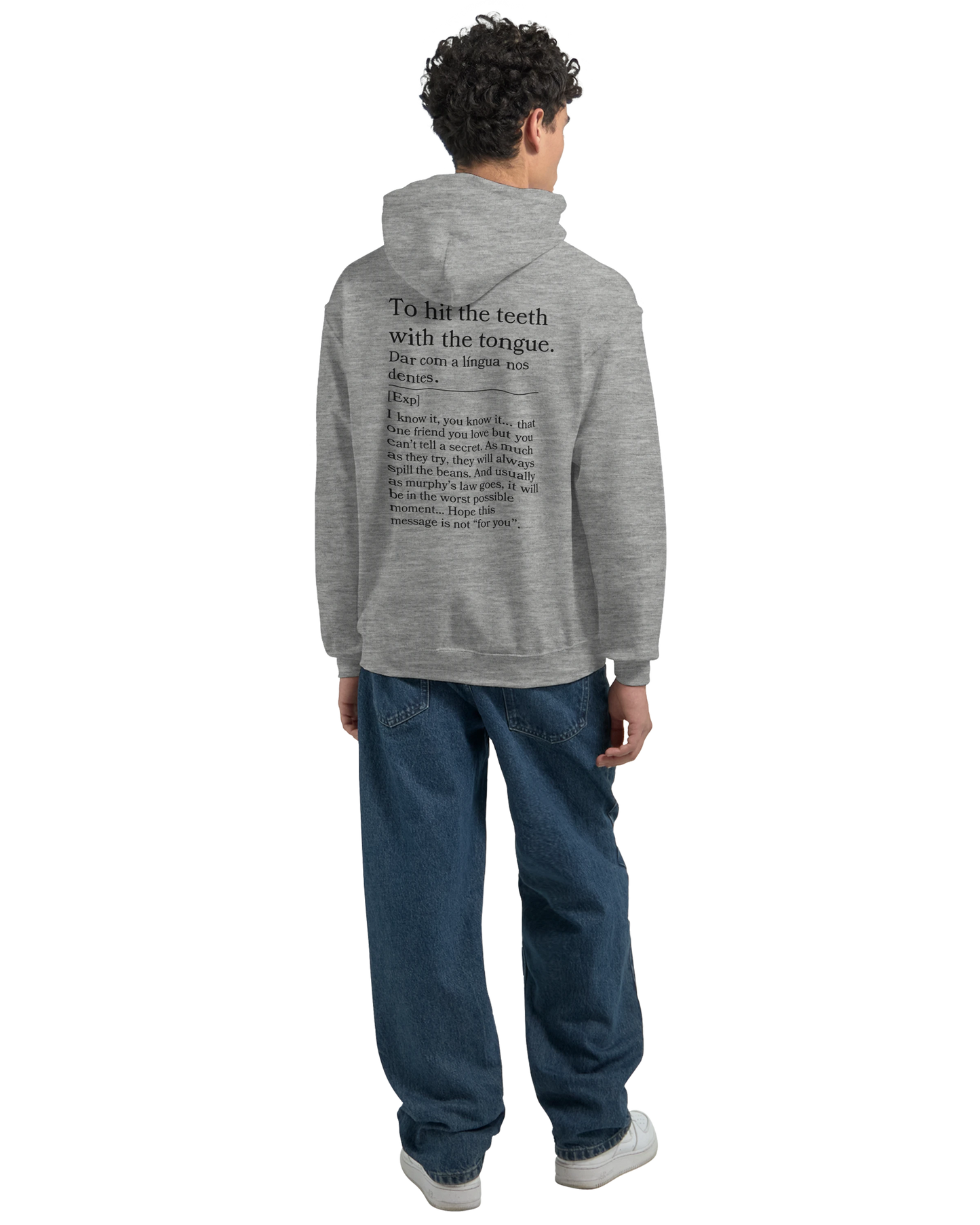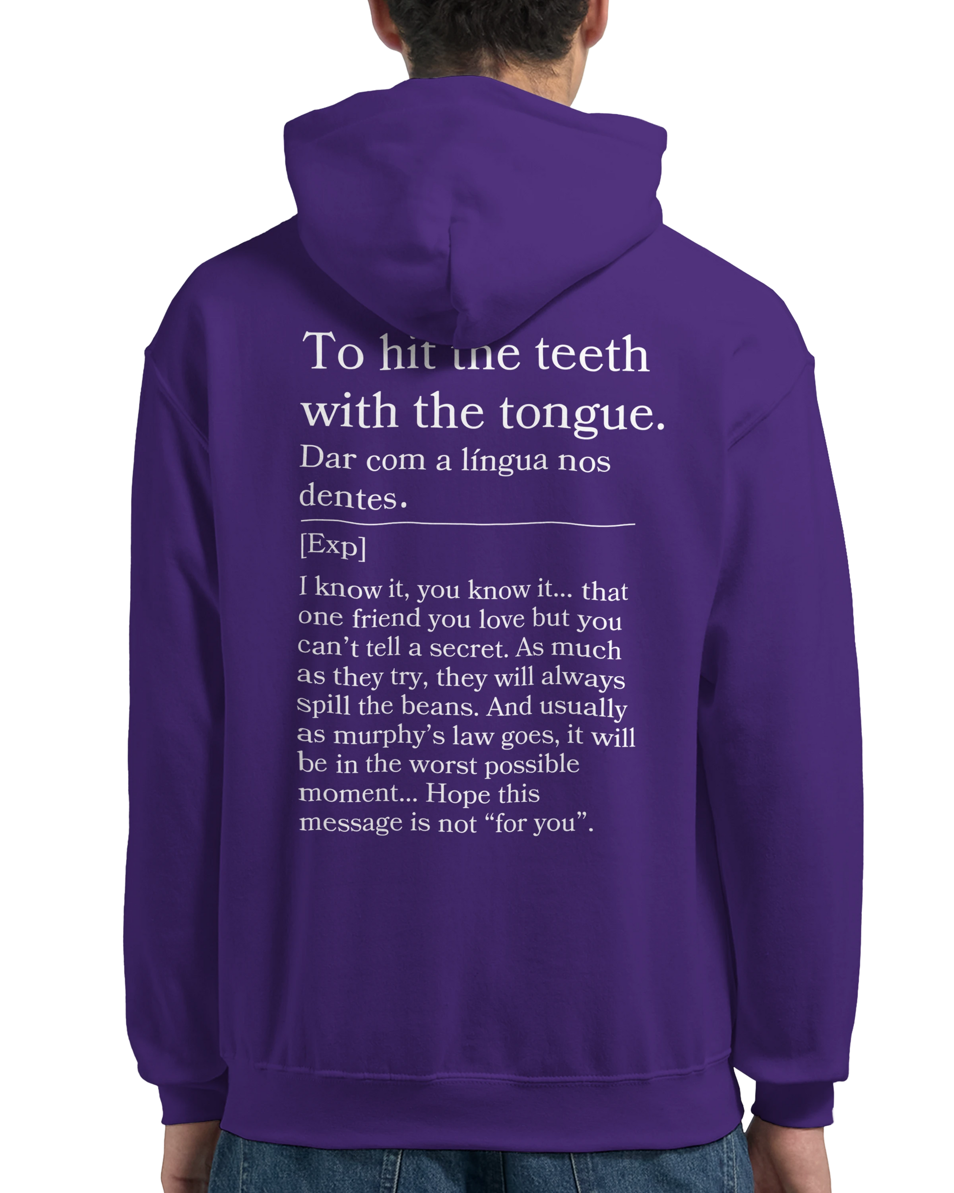 Gossip alert! This hoodie proclaims: “Dar com a língua nos dentes” — classic warning: don’t trust me with secrets. Back features a dictionary‑style hint: “To blab.” Great for the chatty friend.