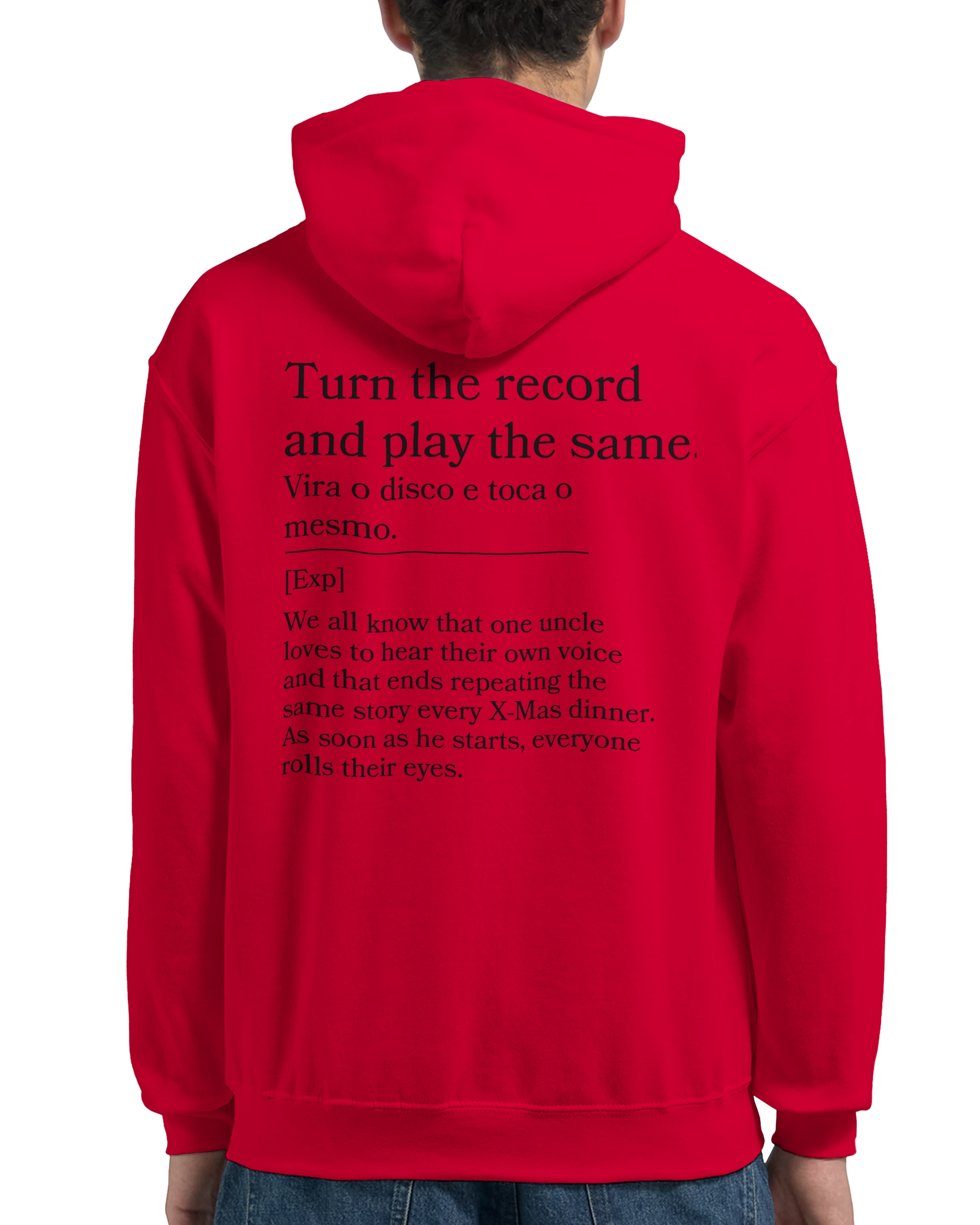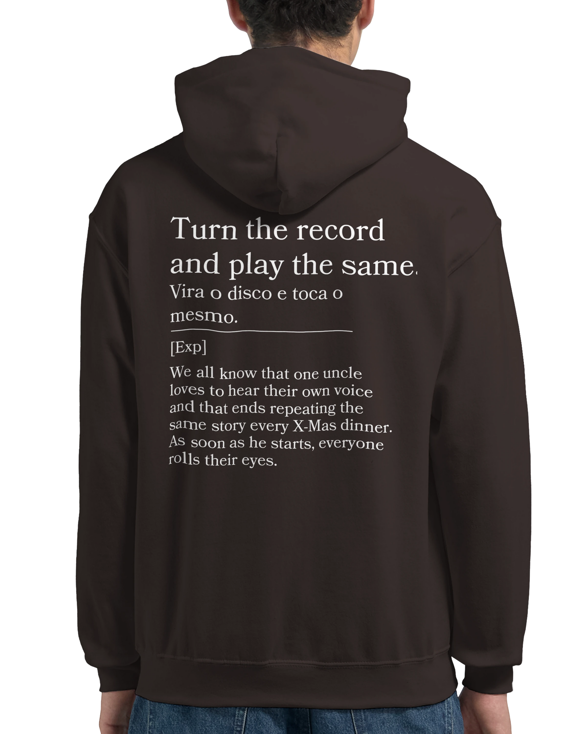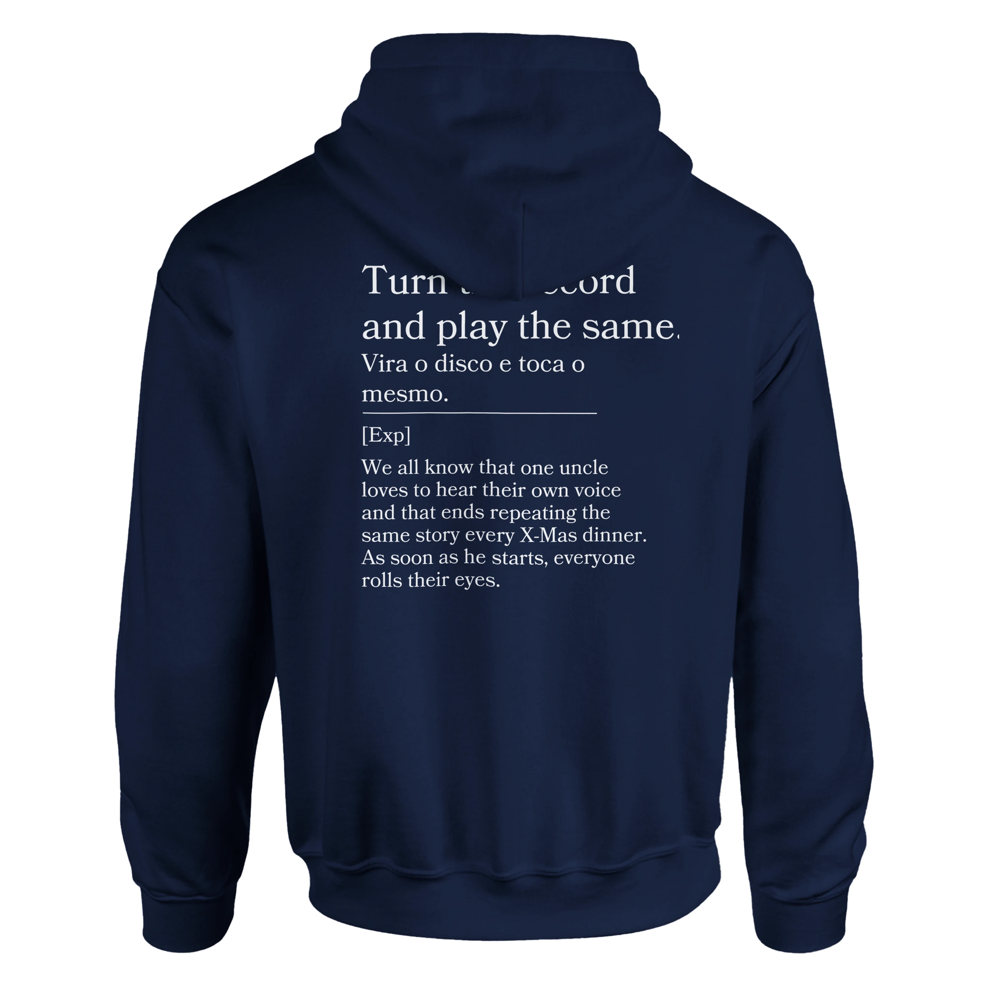 Tired of repeats? This hoodie reads “Vira o disco e toca o mesmo” with back: “Here we go again.” Perfect for that uncle or conversation that never changes.