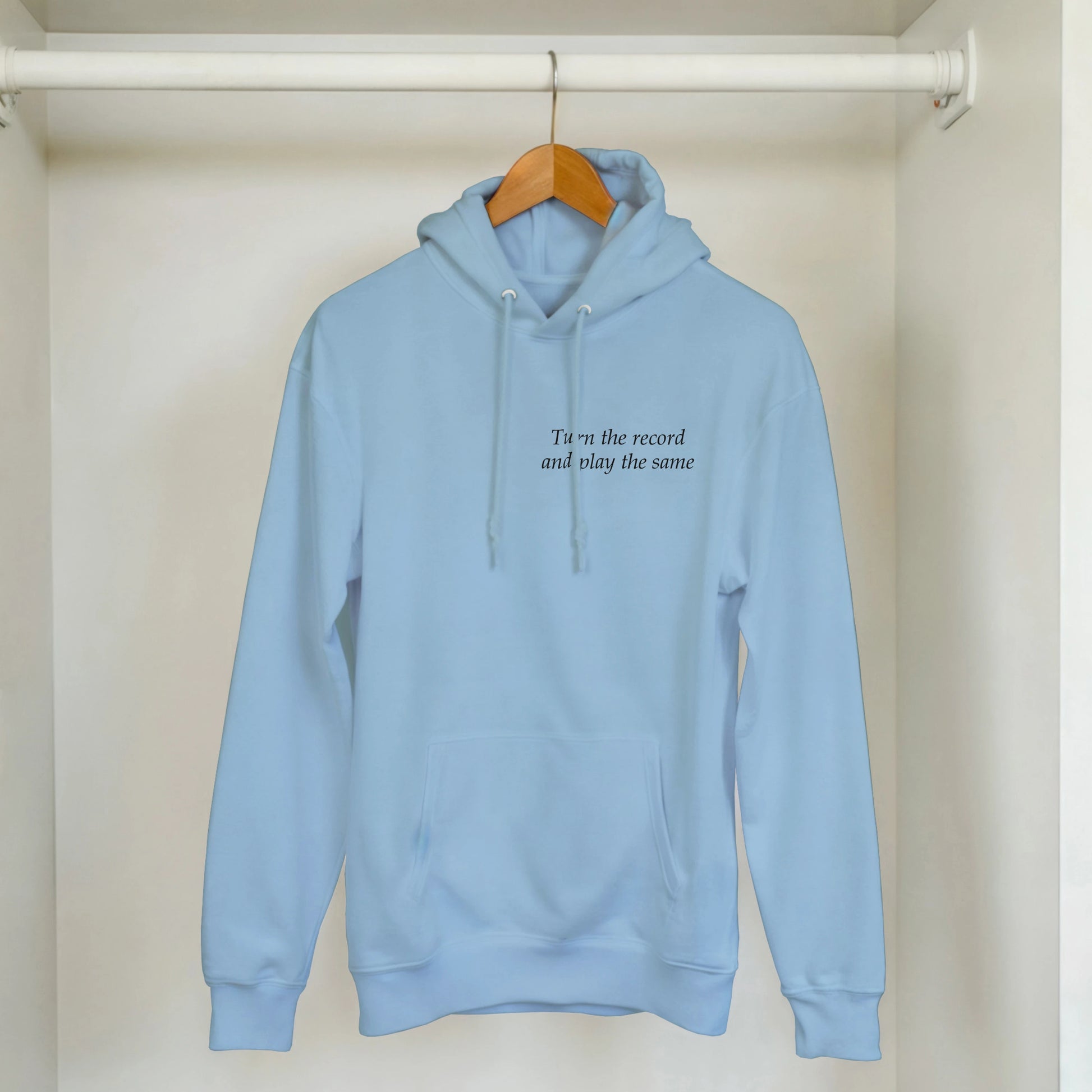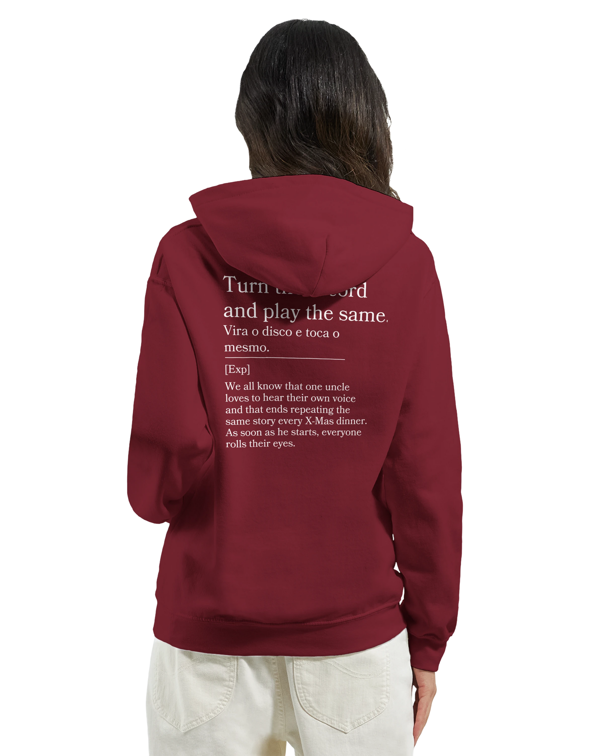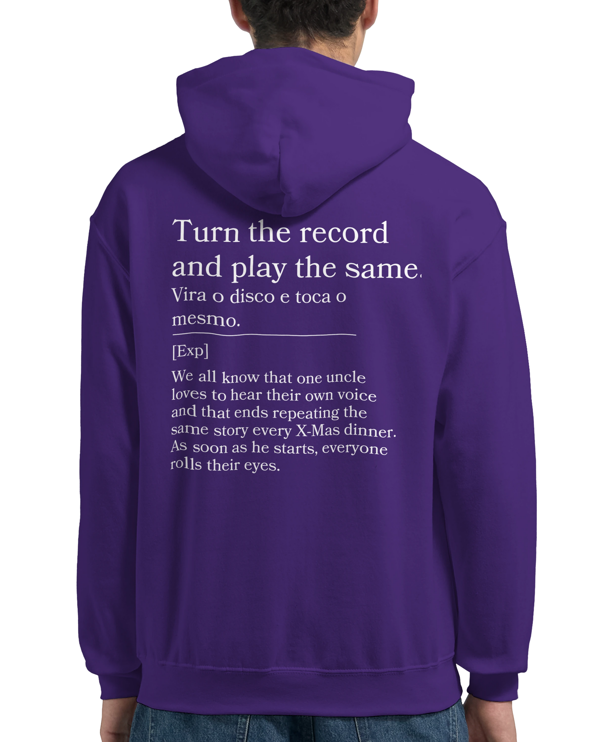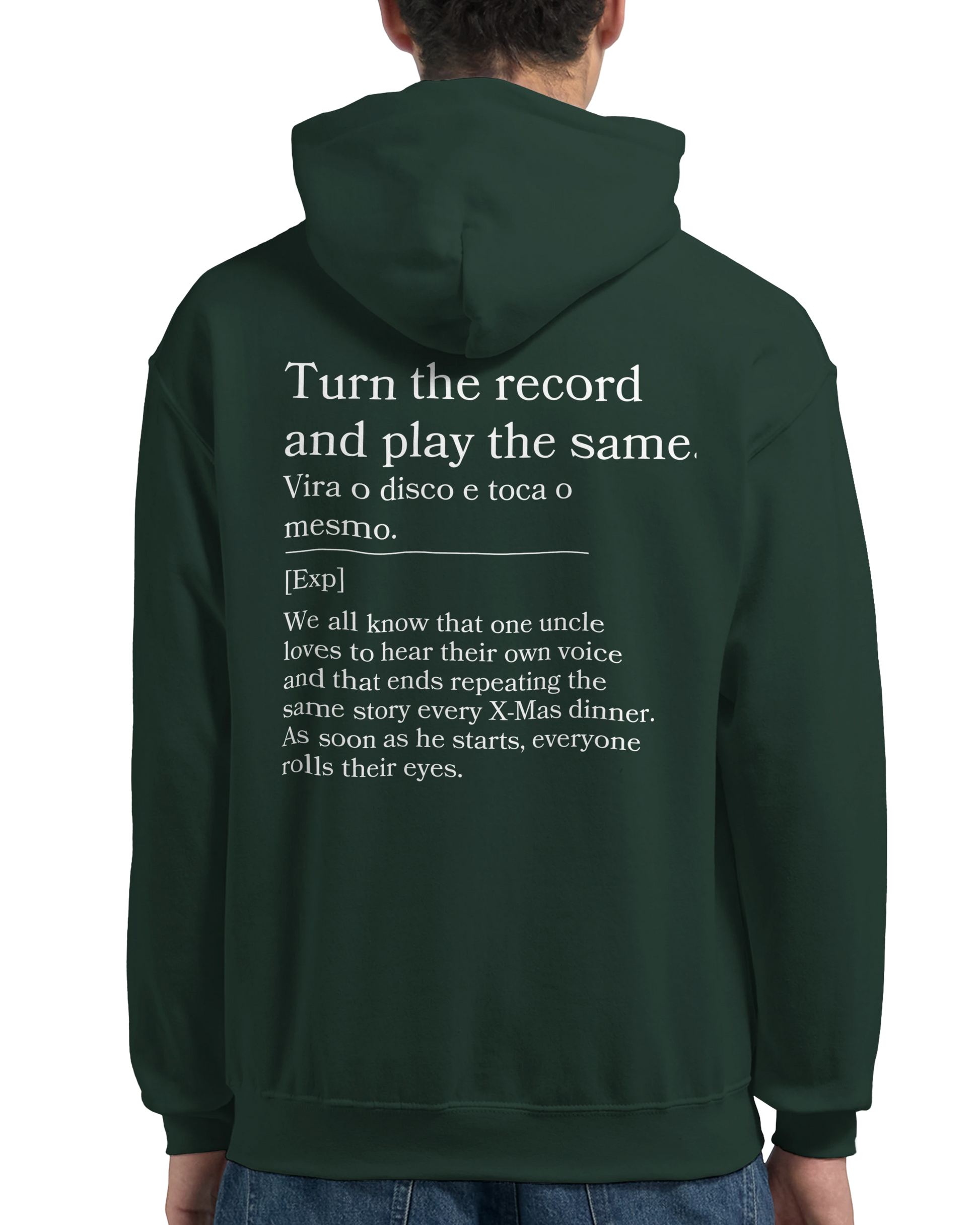 Tired of repeats? This hoodie reads “Vira o disco e toca o mesmo” with back: “Here we go again.” Perfect for that uncle or conversation that never changes.