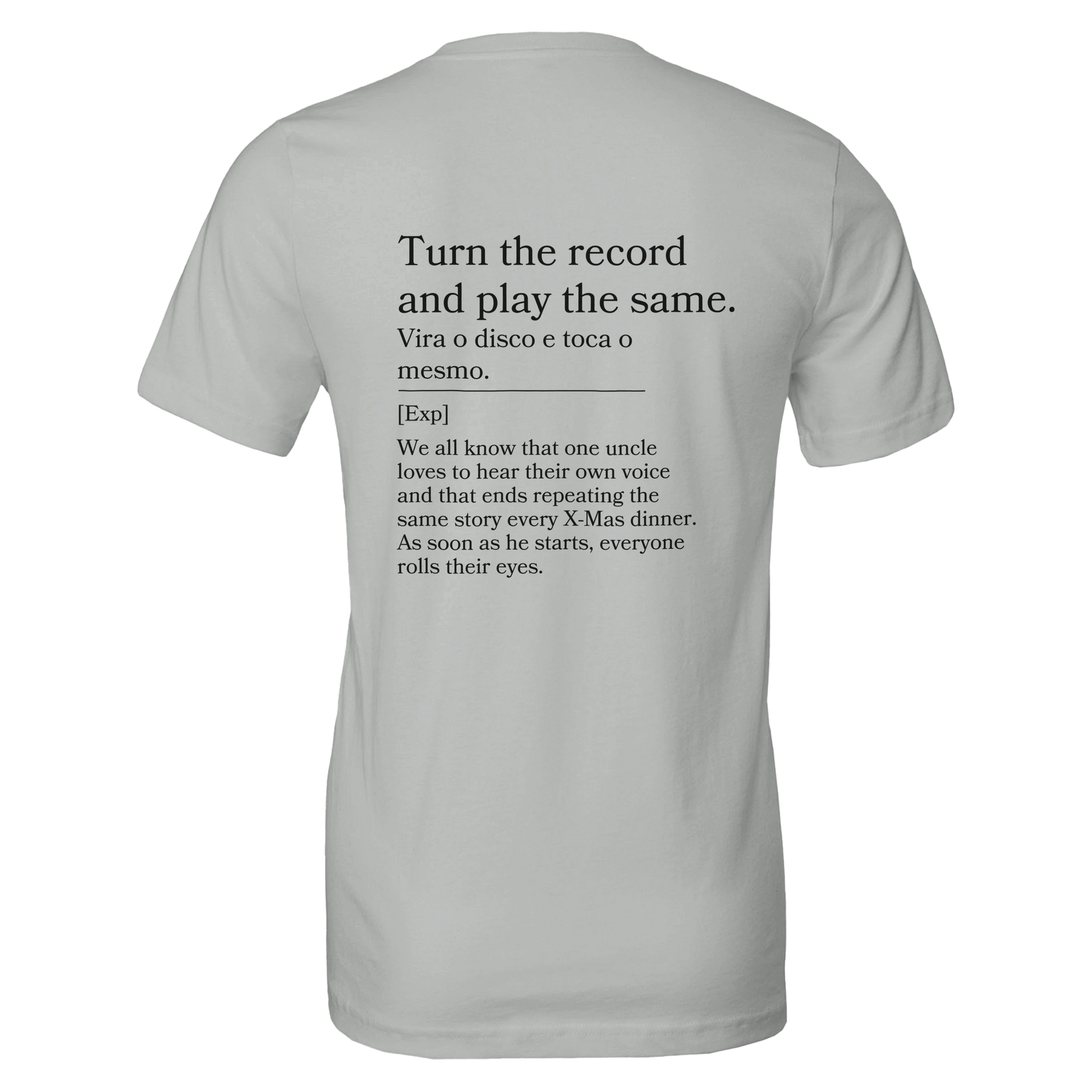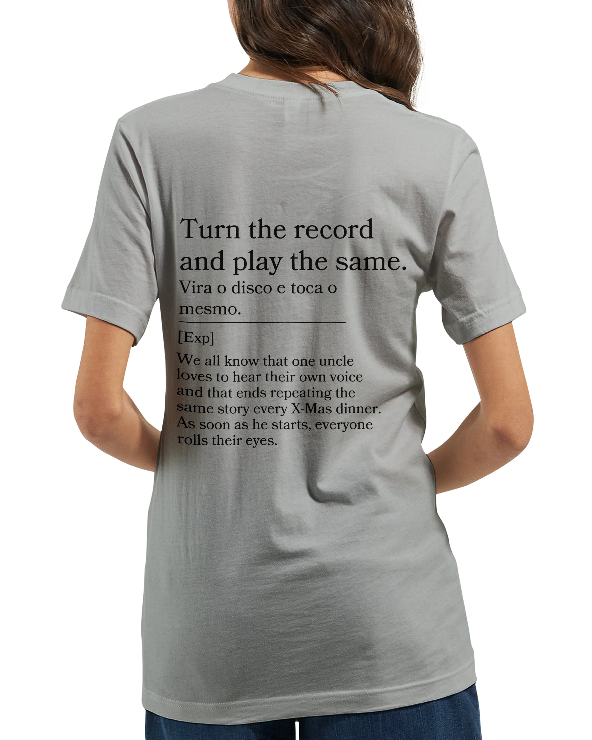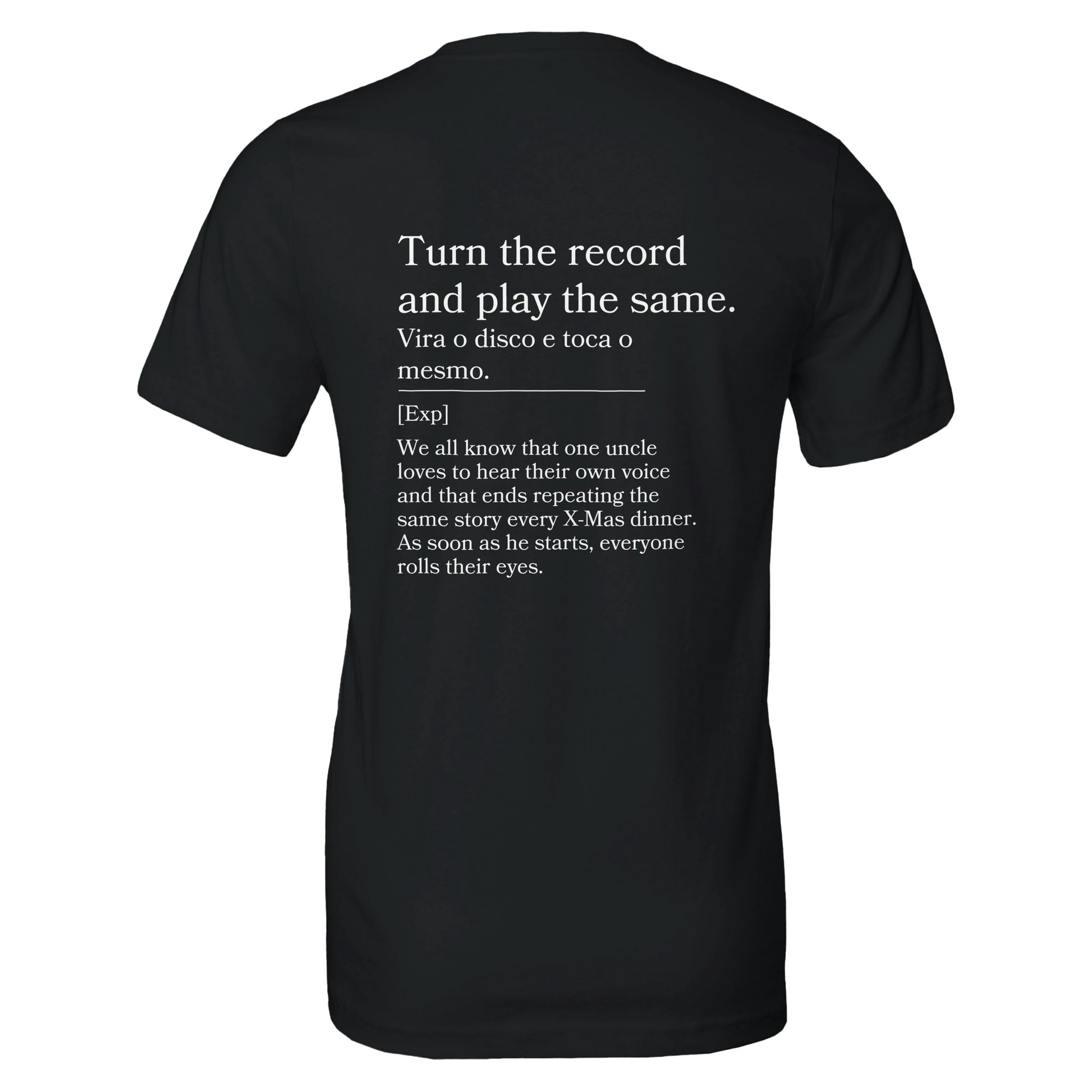 Tired of repeats? This t-shirt reads “Vira o disco e toca o mesmo” with back: “Here we go again.” Perfect for that uncle or conversation that never changes.
