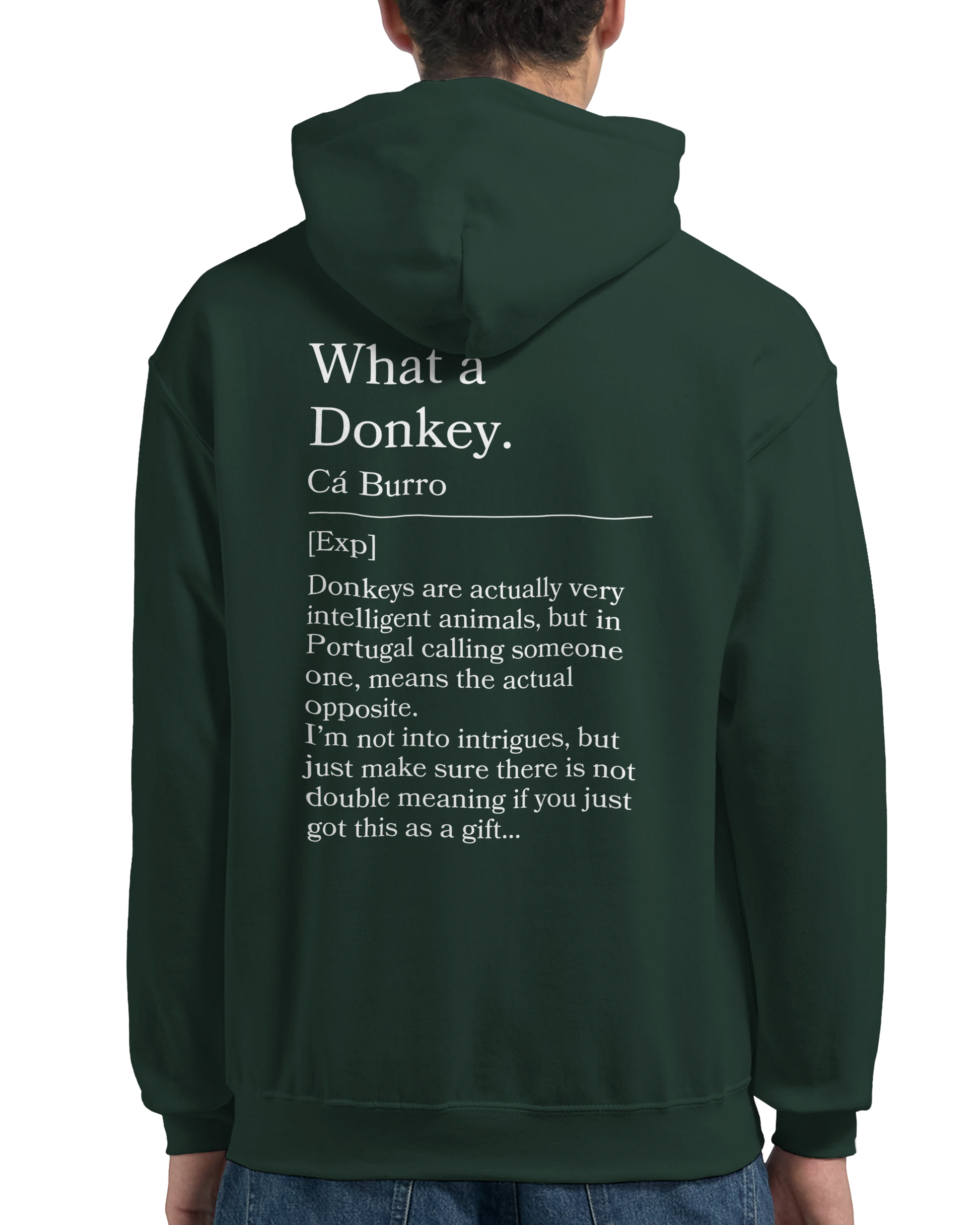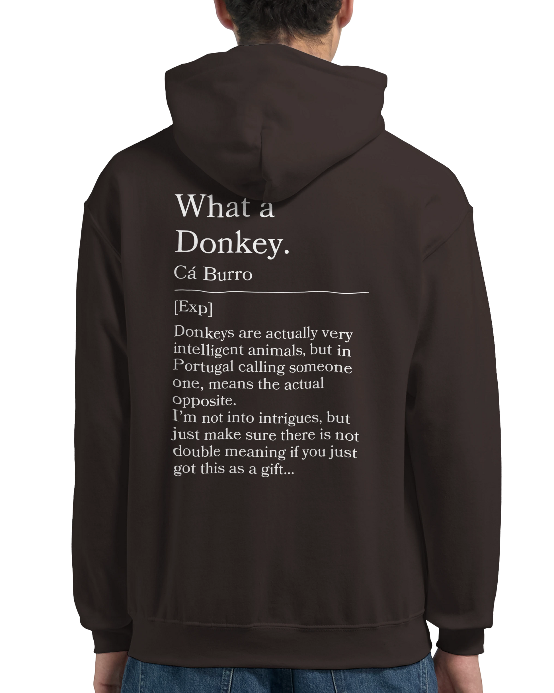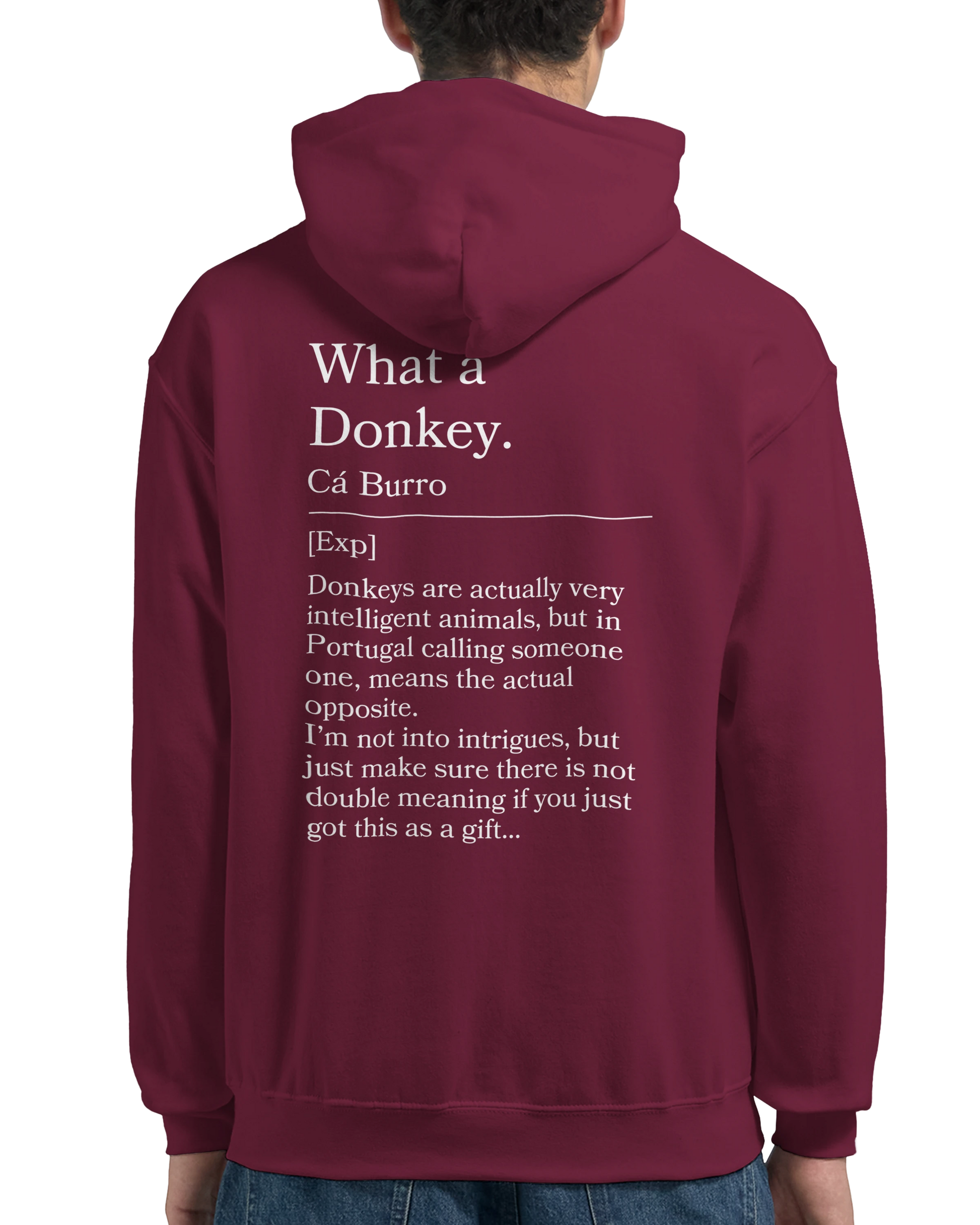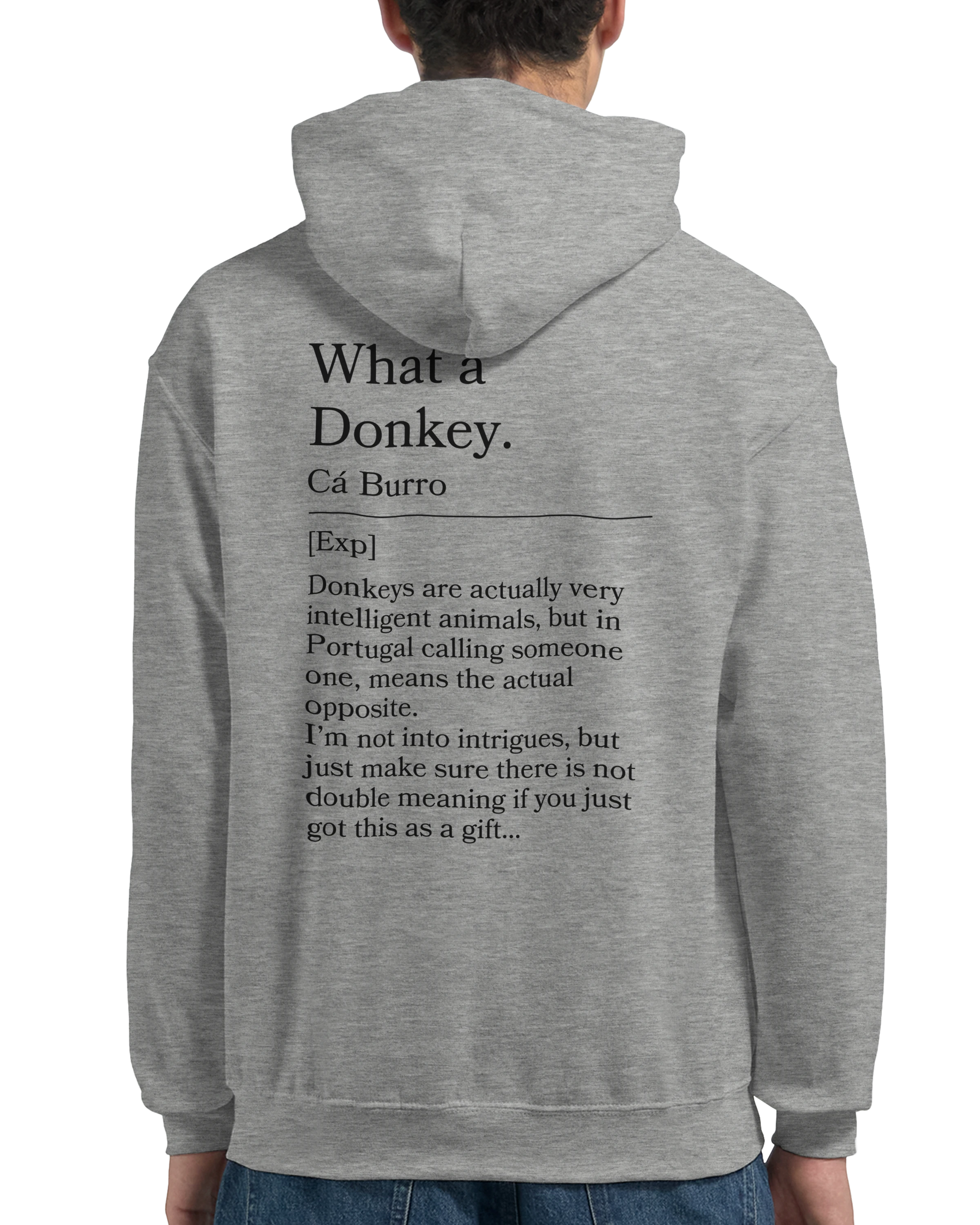 Feeling particularly foolish? Wear this hoodie that bluntly says “Cá burro.” The front reads it proudly, the back cheekily explains: “Donkey = idiot.” Intelligent animals, yes — but not that intelligent Portuguese insult! Perfect for self-deprecating souls or warning signs.