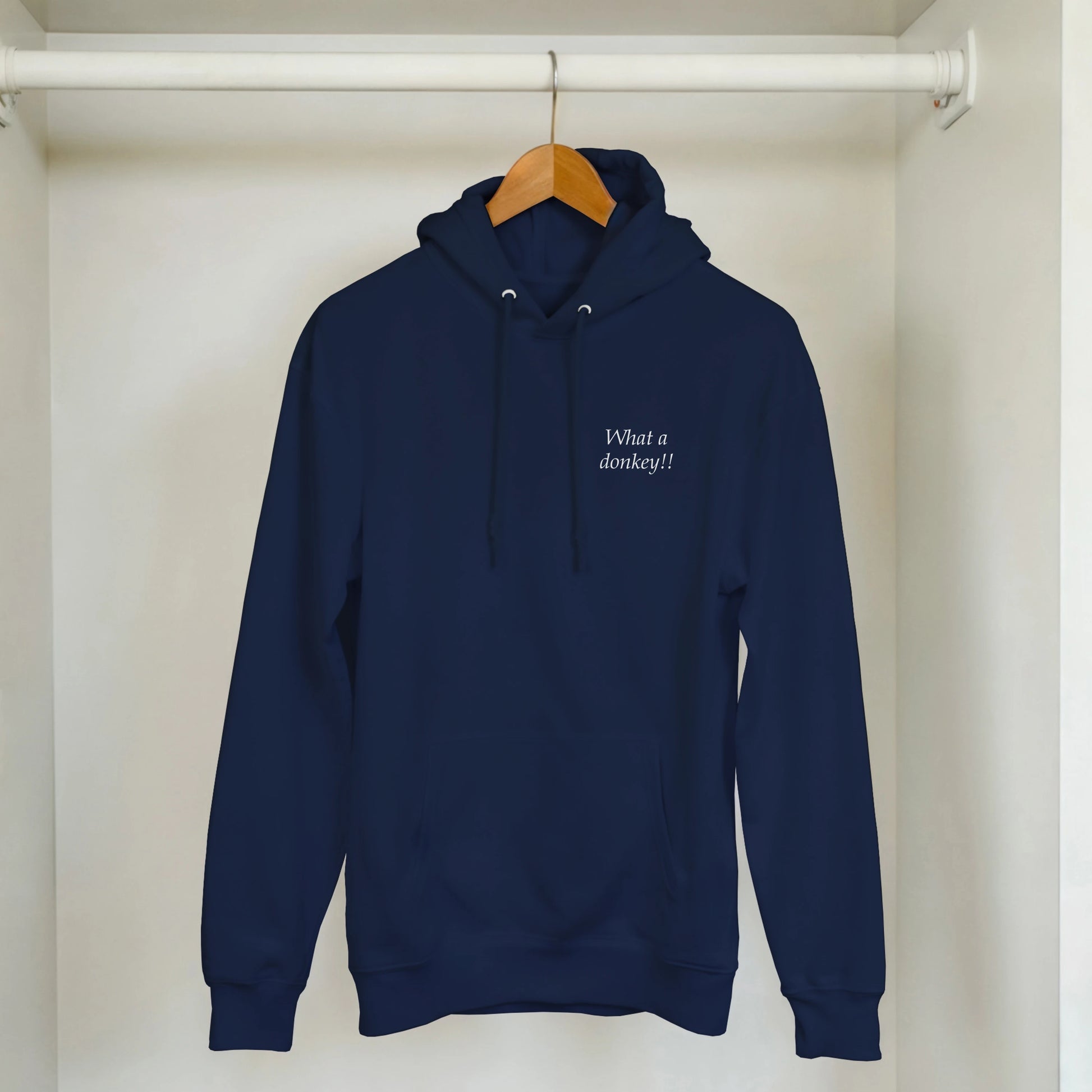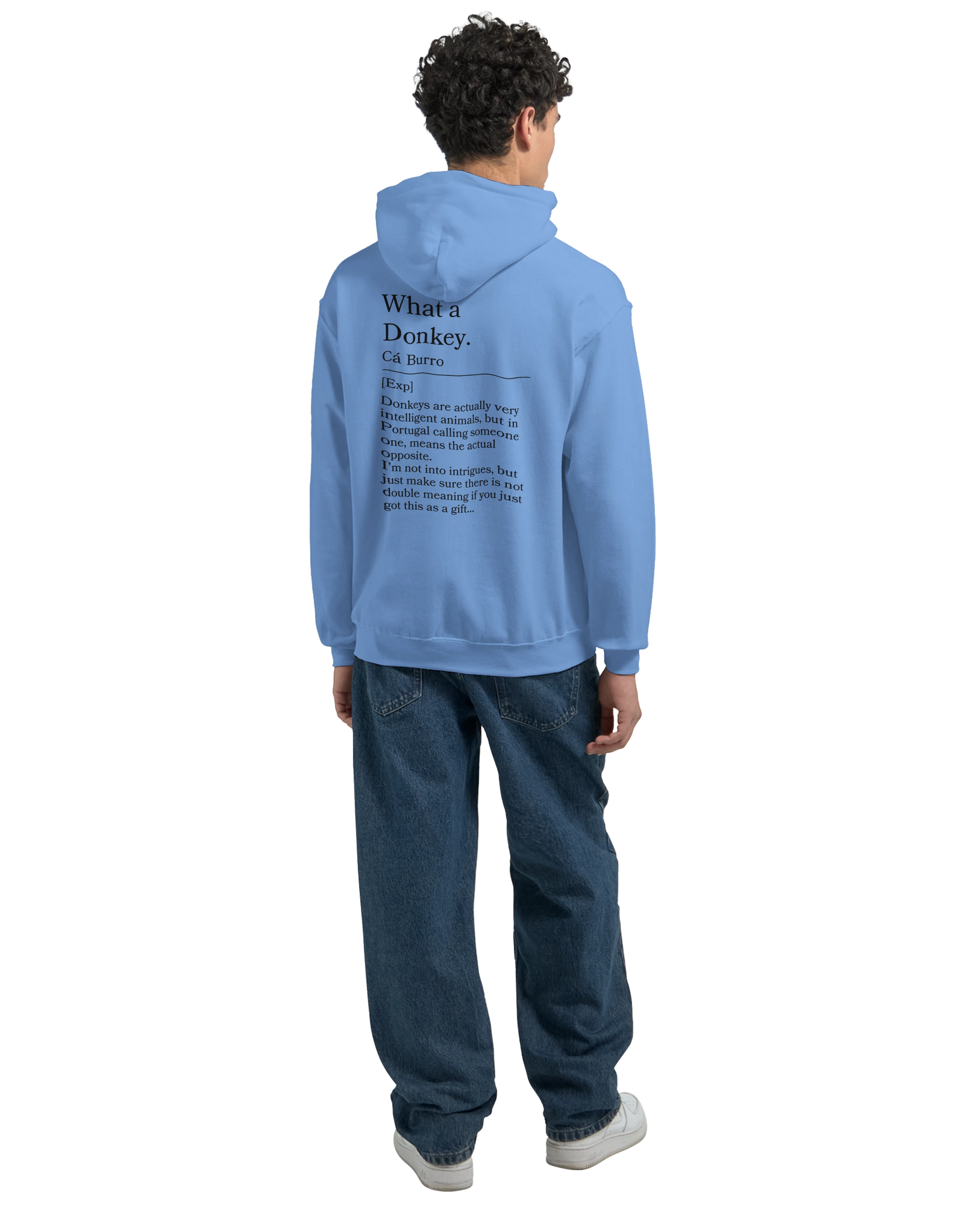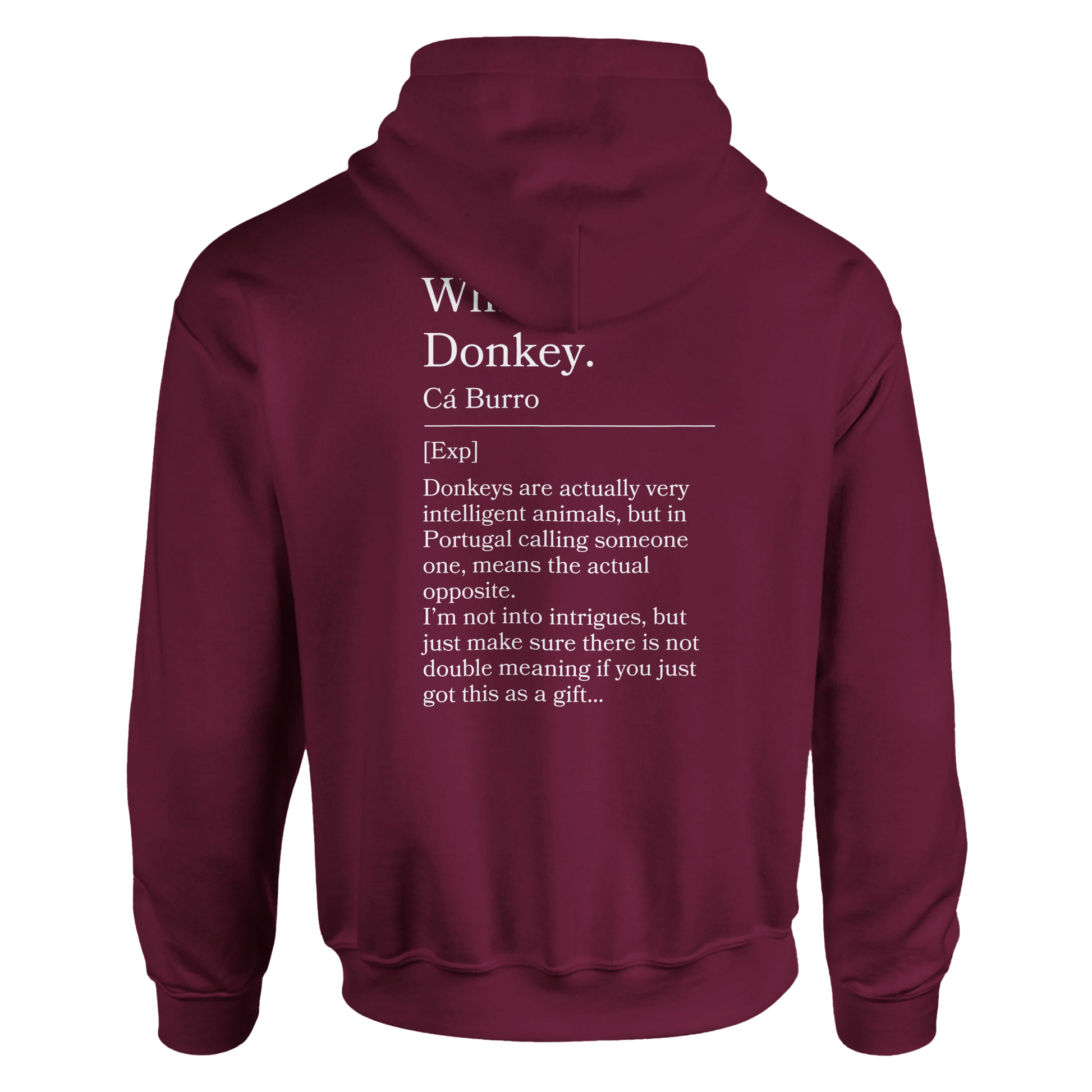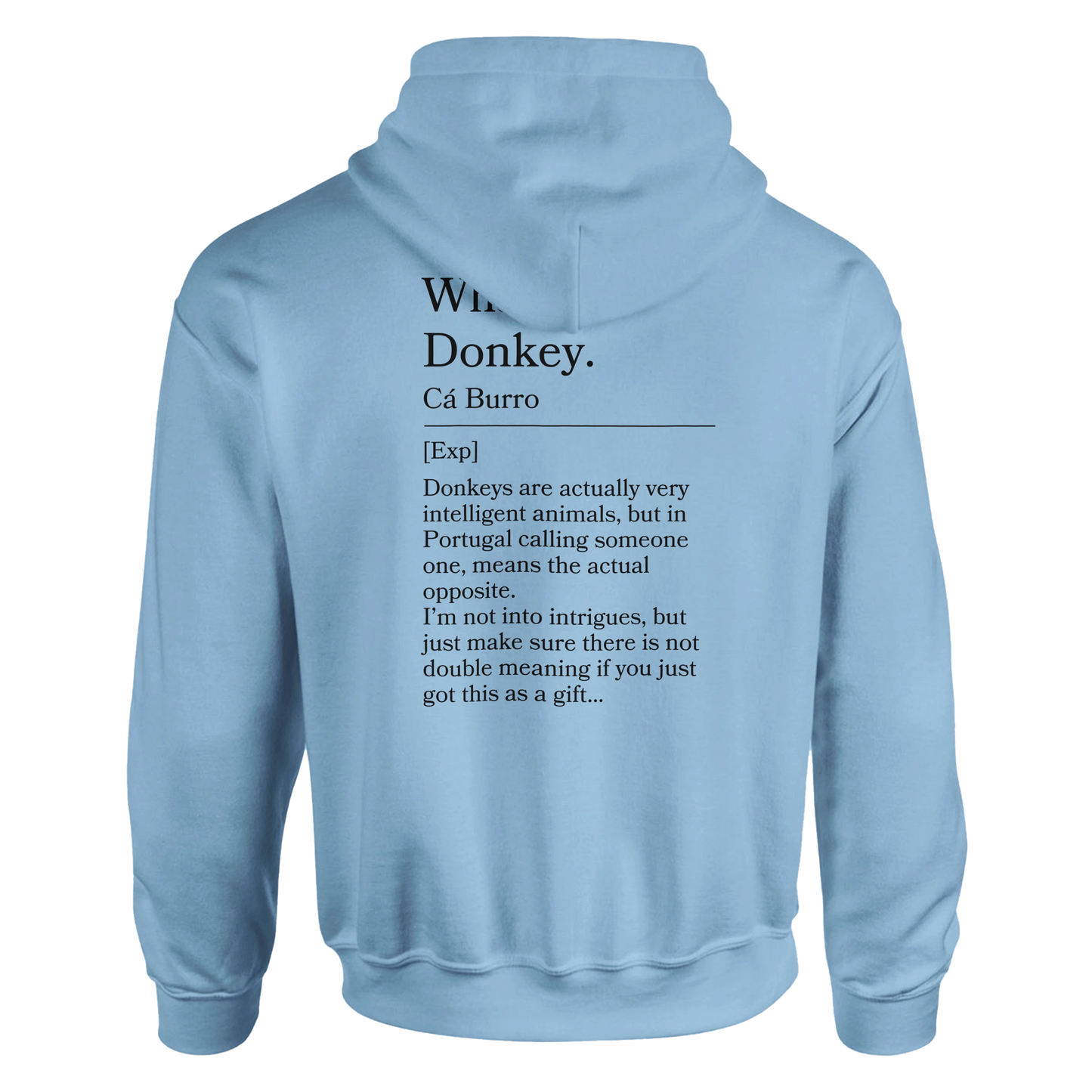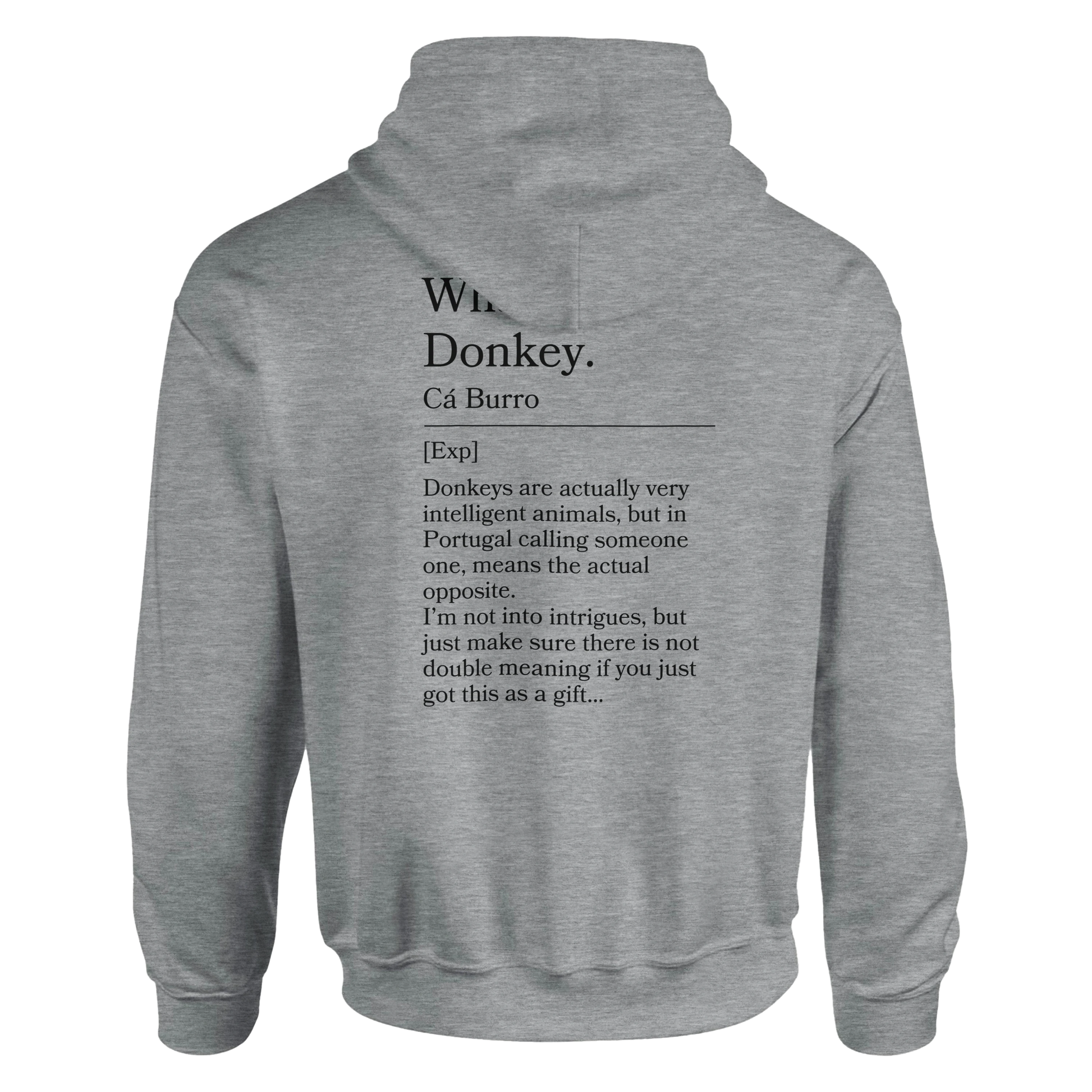 Feeling particularly foolish? Wear this hoodie that bluntly says “Cá burro.” The front reads it proudly, the back cheekily explains: “Donkey = idiot.” Intelligent animals, yes — but not that intelligent Portuguese insult! Perfect for self-deprecating souls or warning signs.